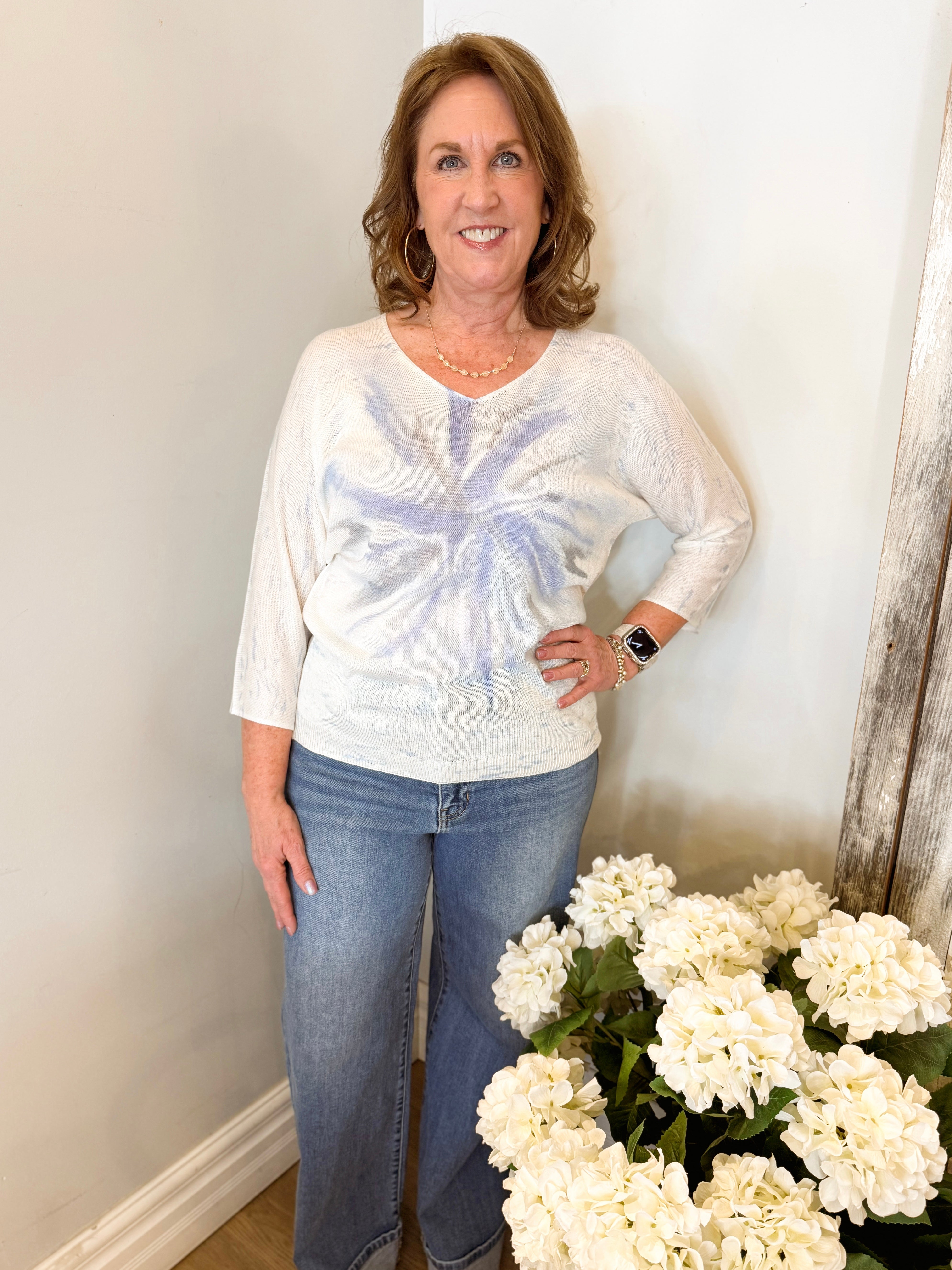 3/4 Dolman Blouson Sleeve Printed Sweater Top with Pleat Detail, Round Neck, and Banded Bottom