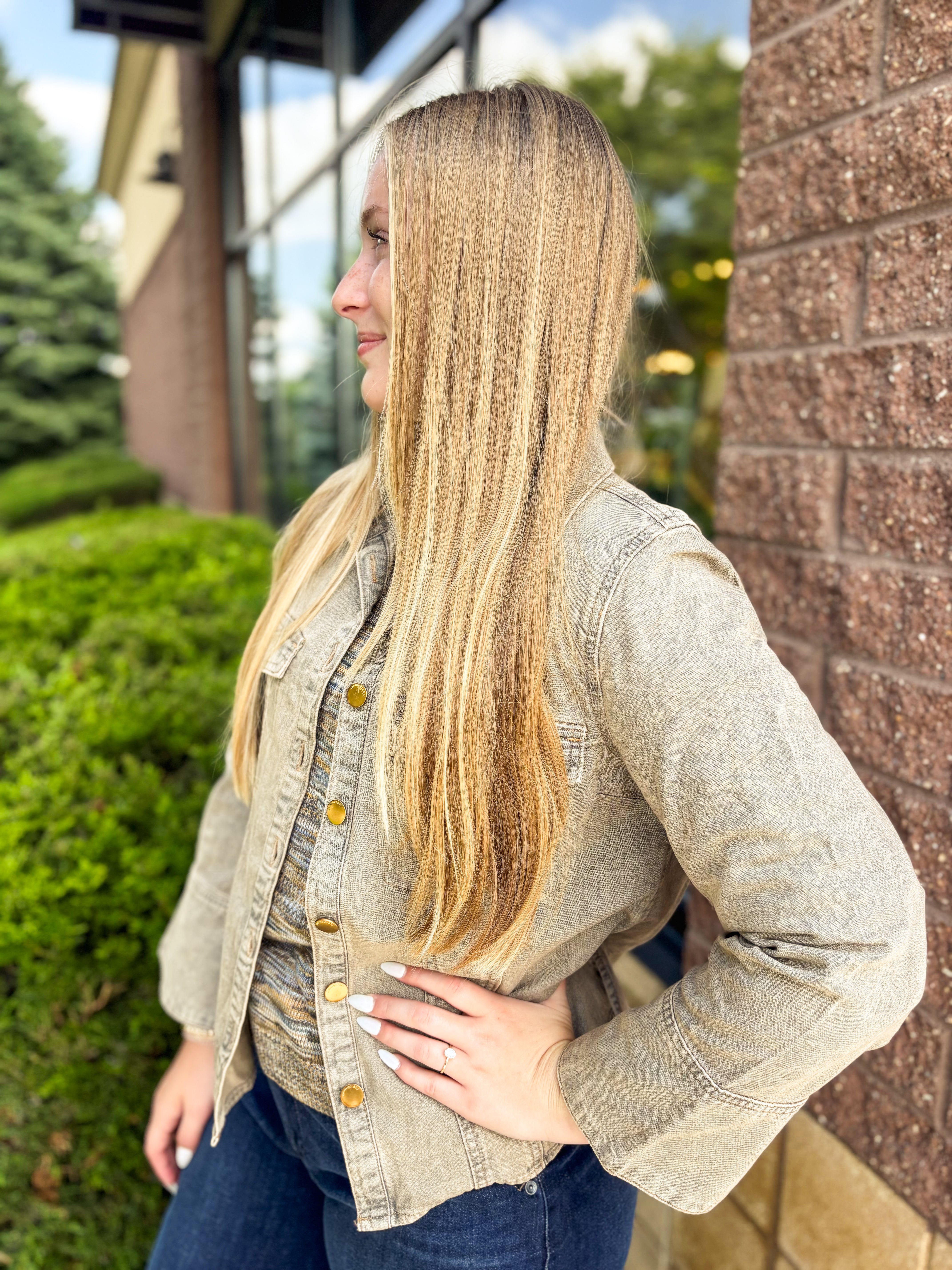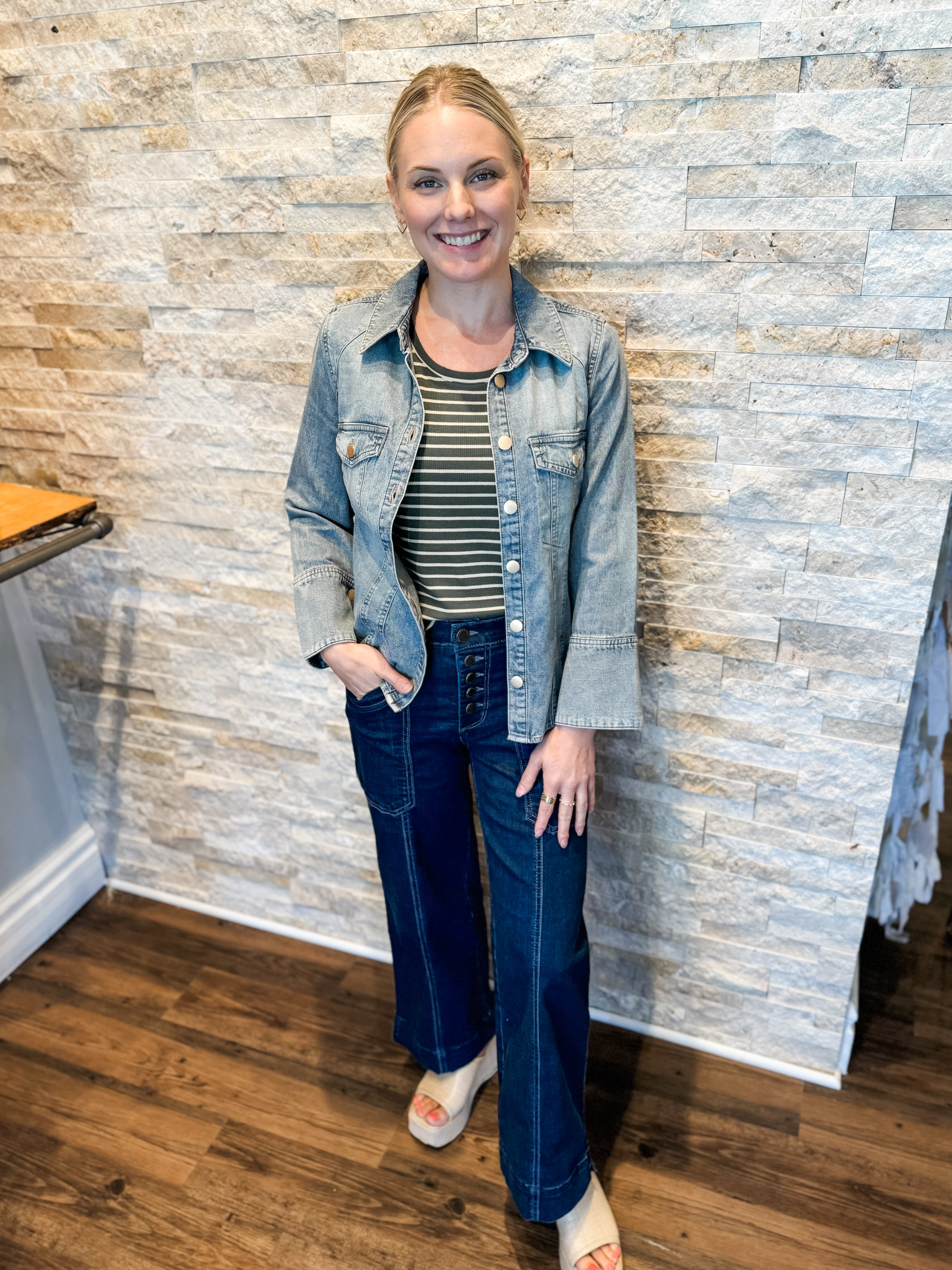 3/4 French Cuff Sleeve Button Down Denim Shirt - HQ