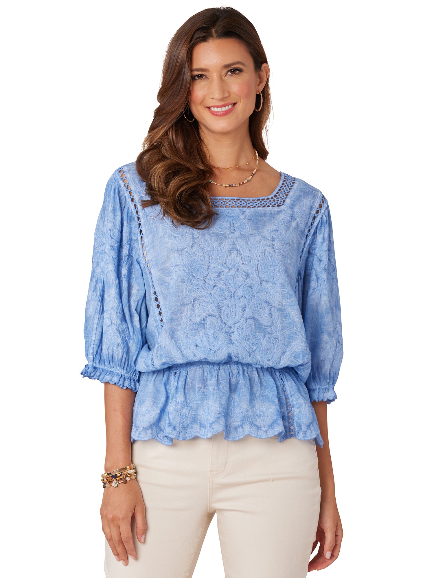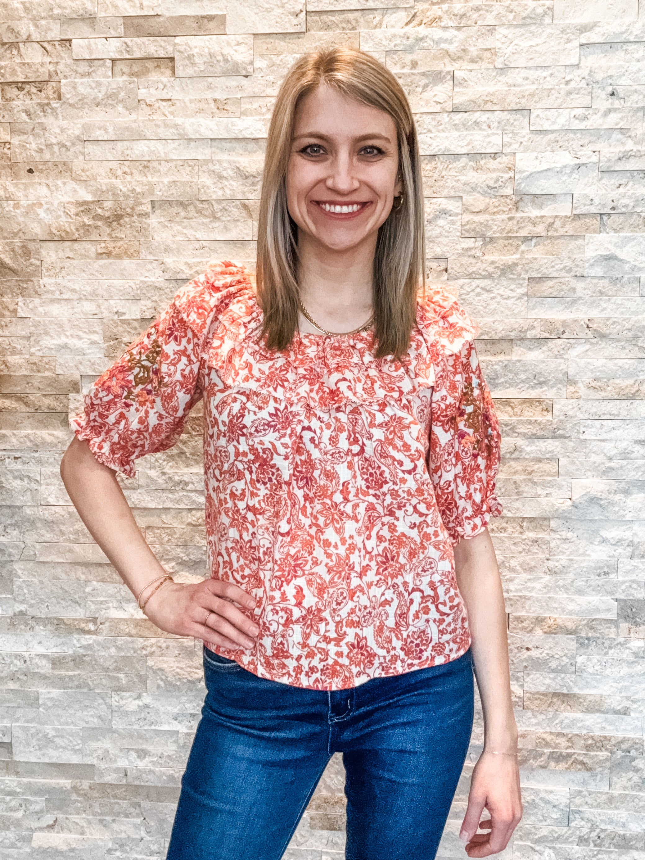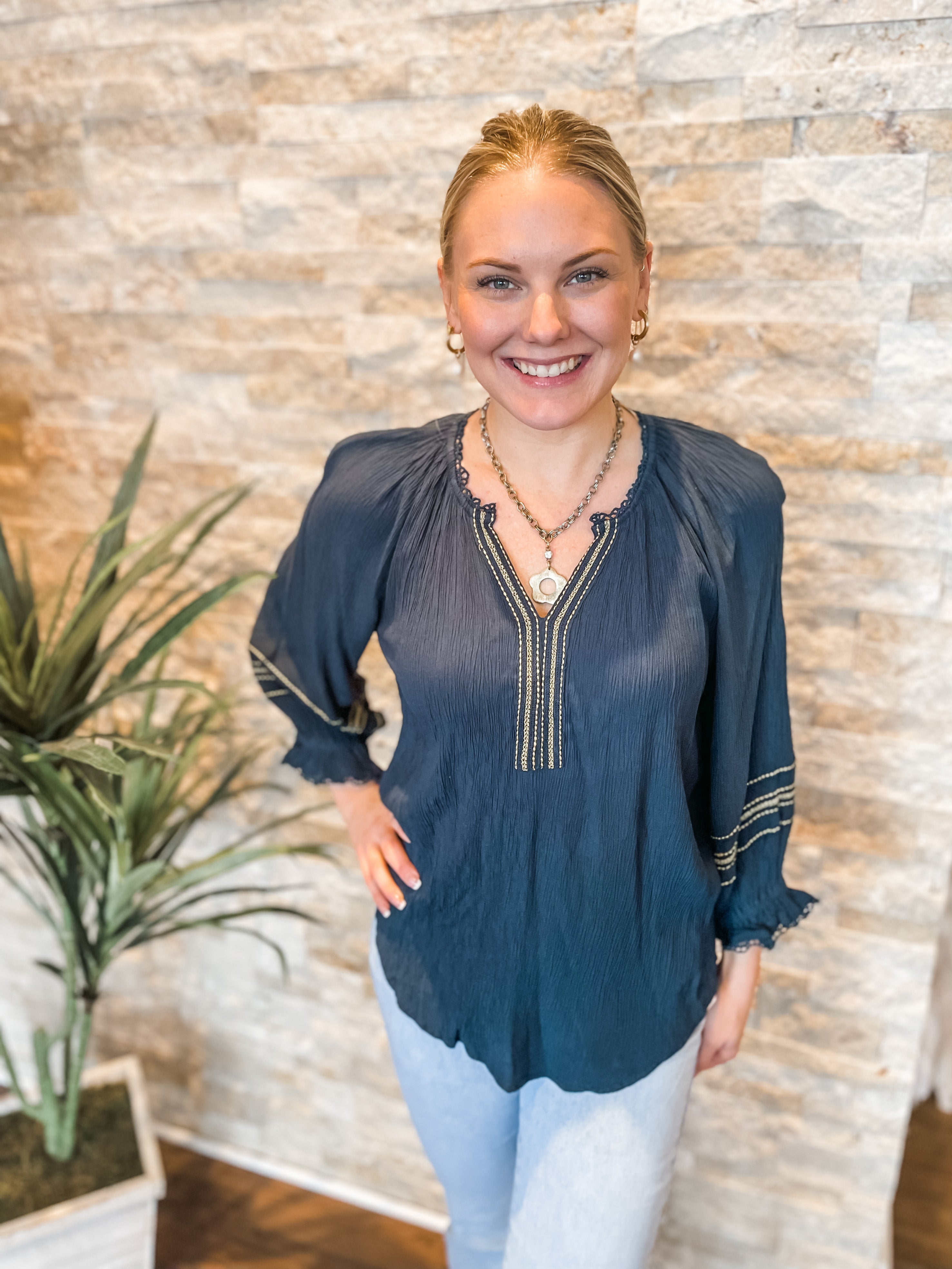 3/4 Blouson Slv Ruffle Edge w/ Emb Detail Top - HQ