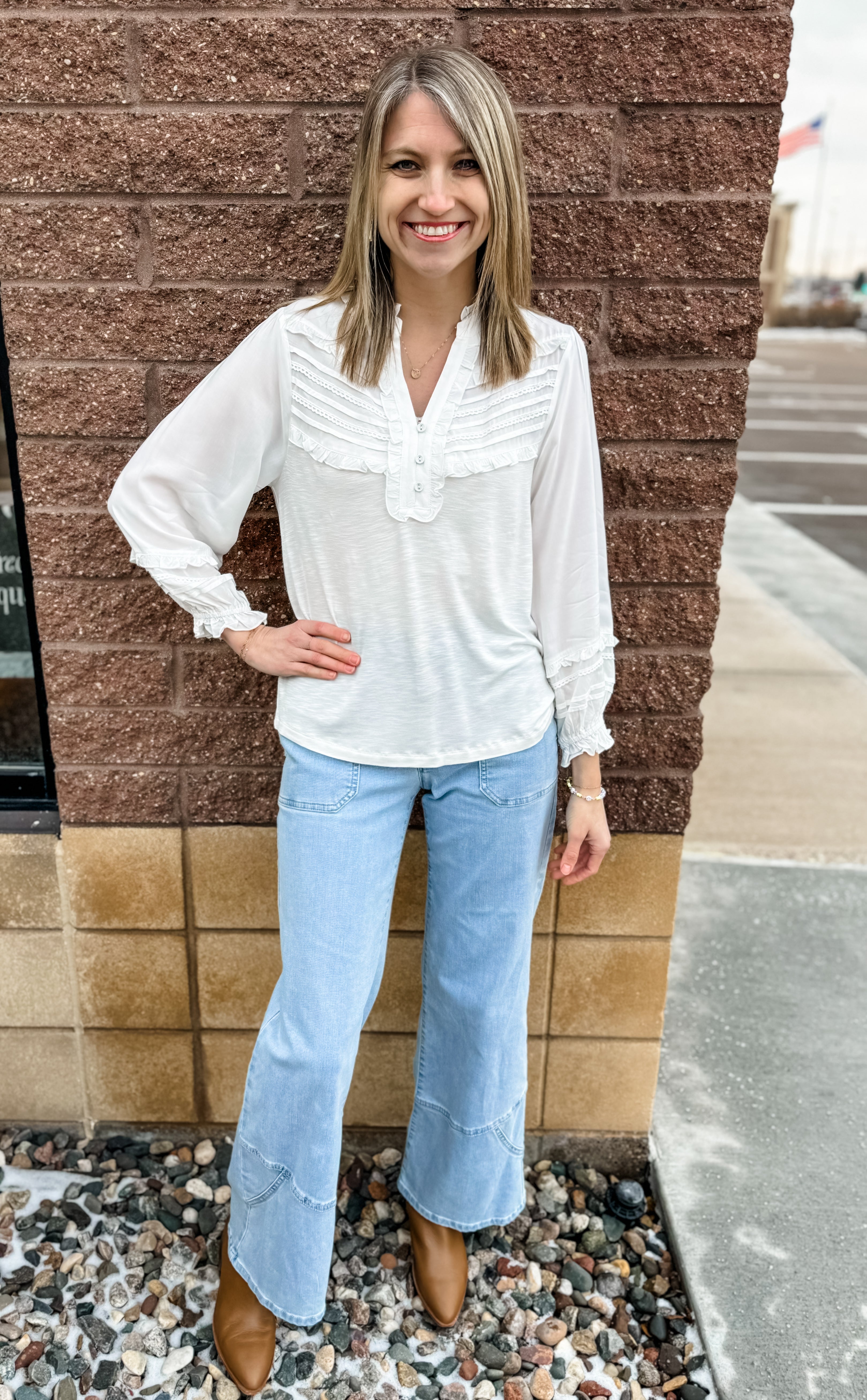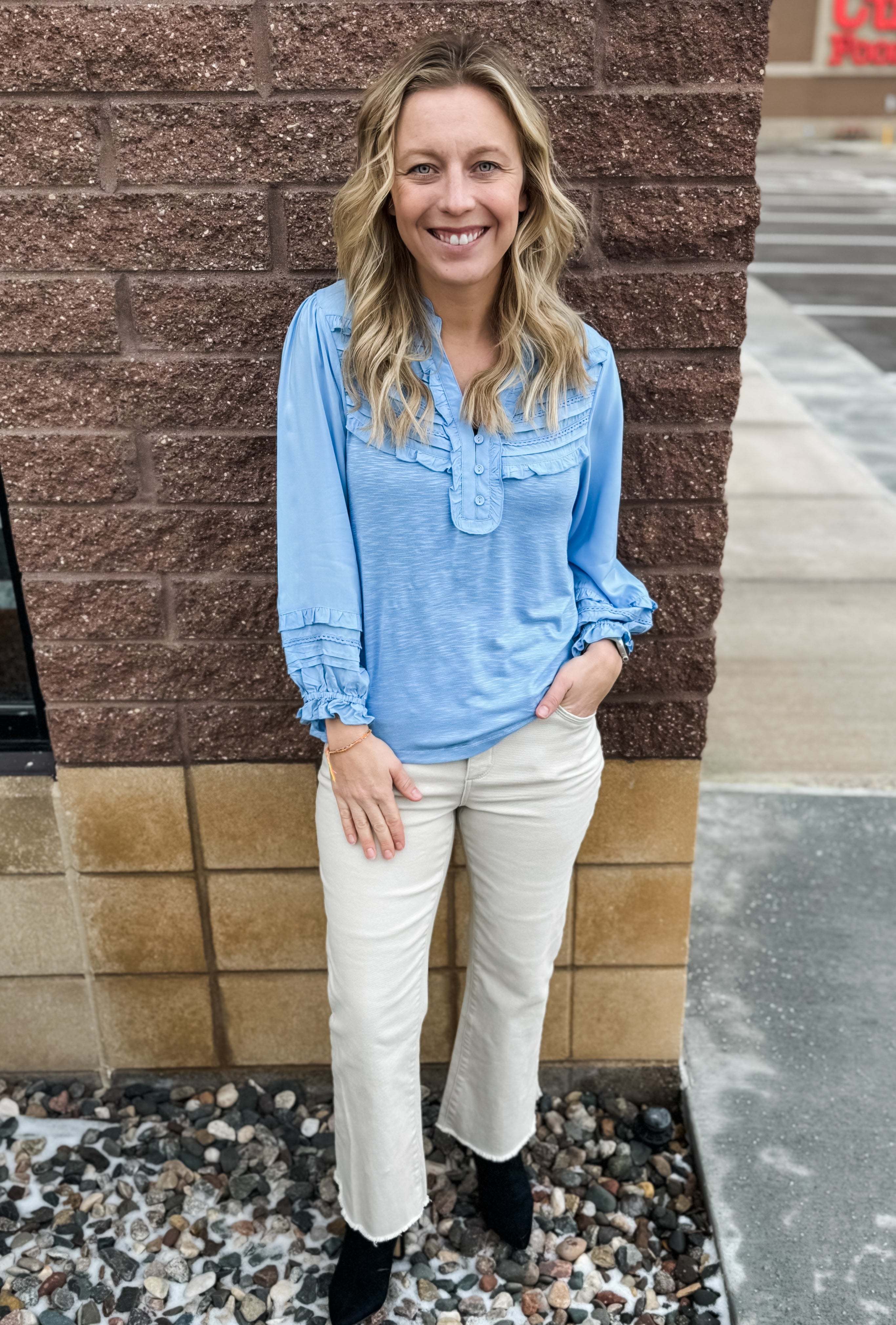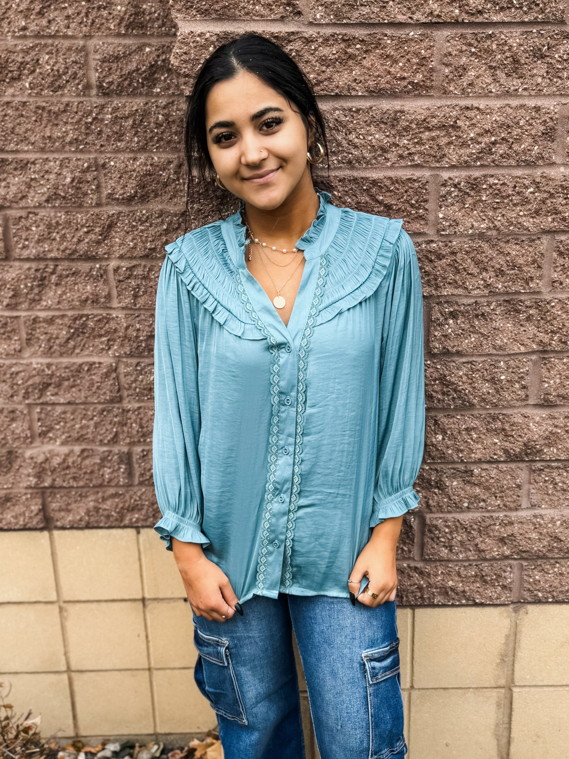 3/4 Blouson Slv Ruffle Edge w/ Emb Detail Top - HQ