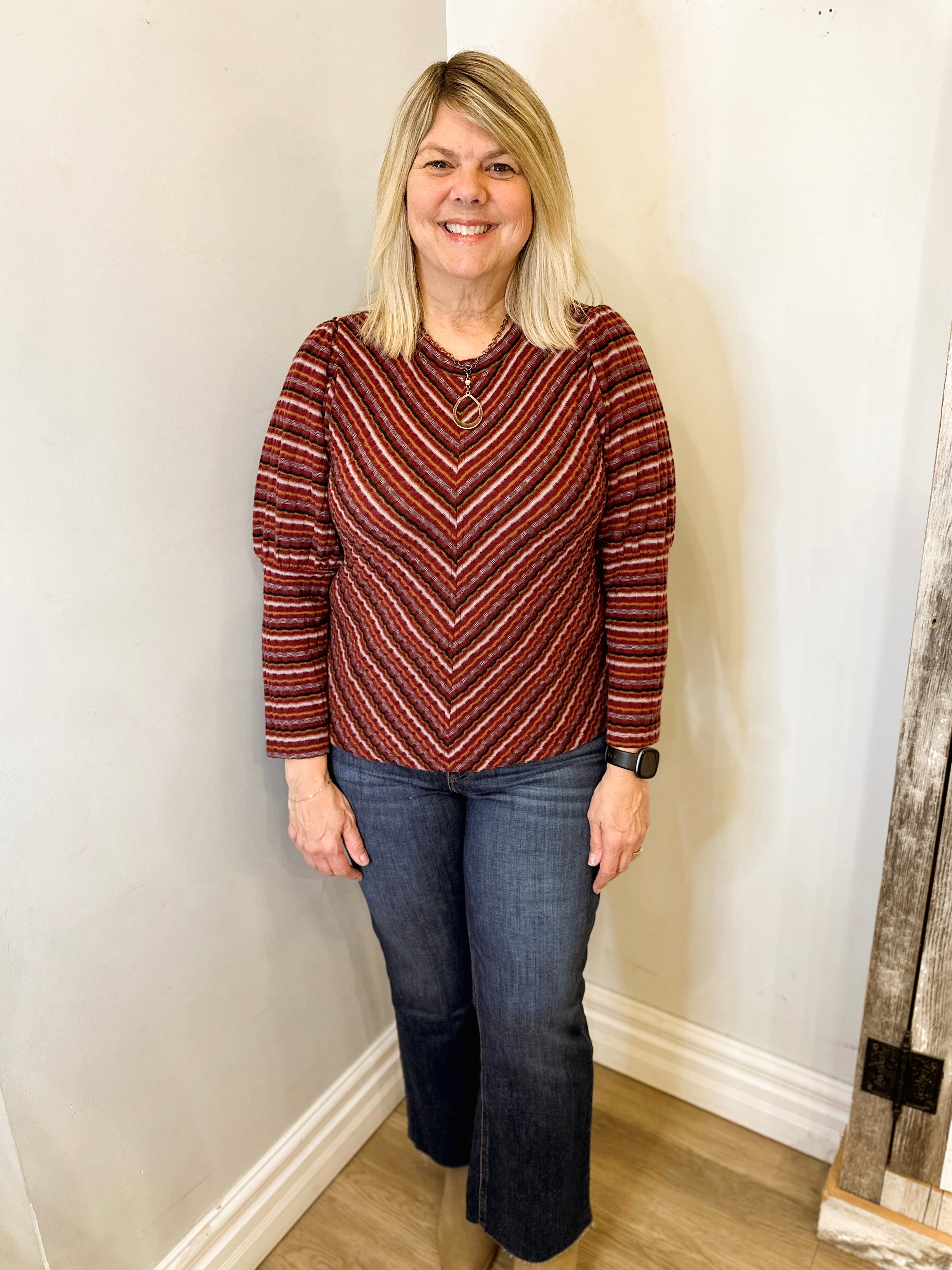 3/4 BLOUSON SLEEVE KNIT TOP WITH JACQUARD BANDS