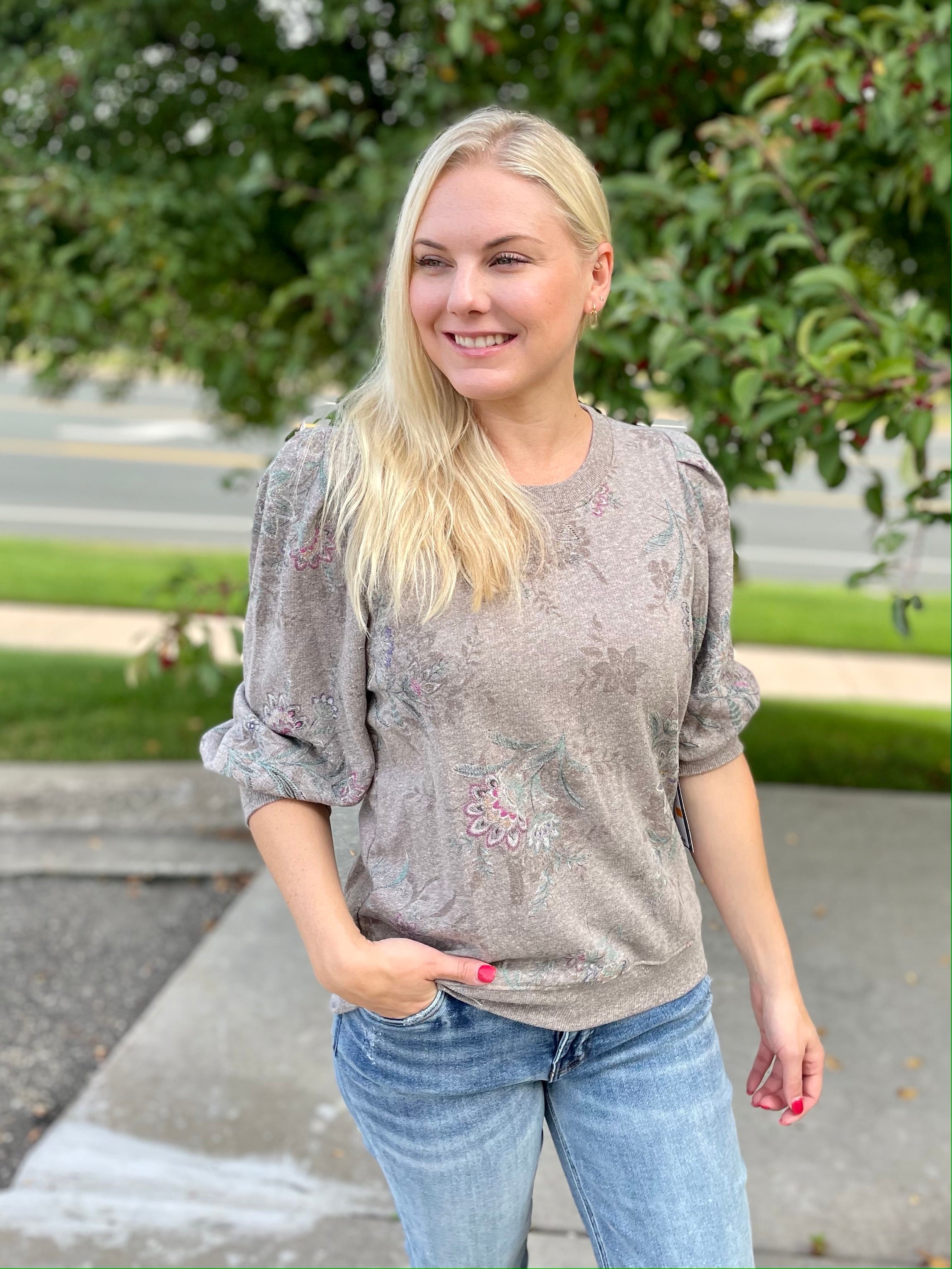 3/4 Blouson Sleeve Scoop Neck Printed Sweatshirt- HQ