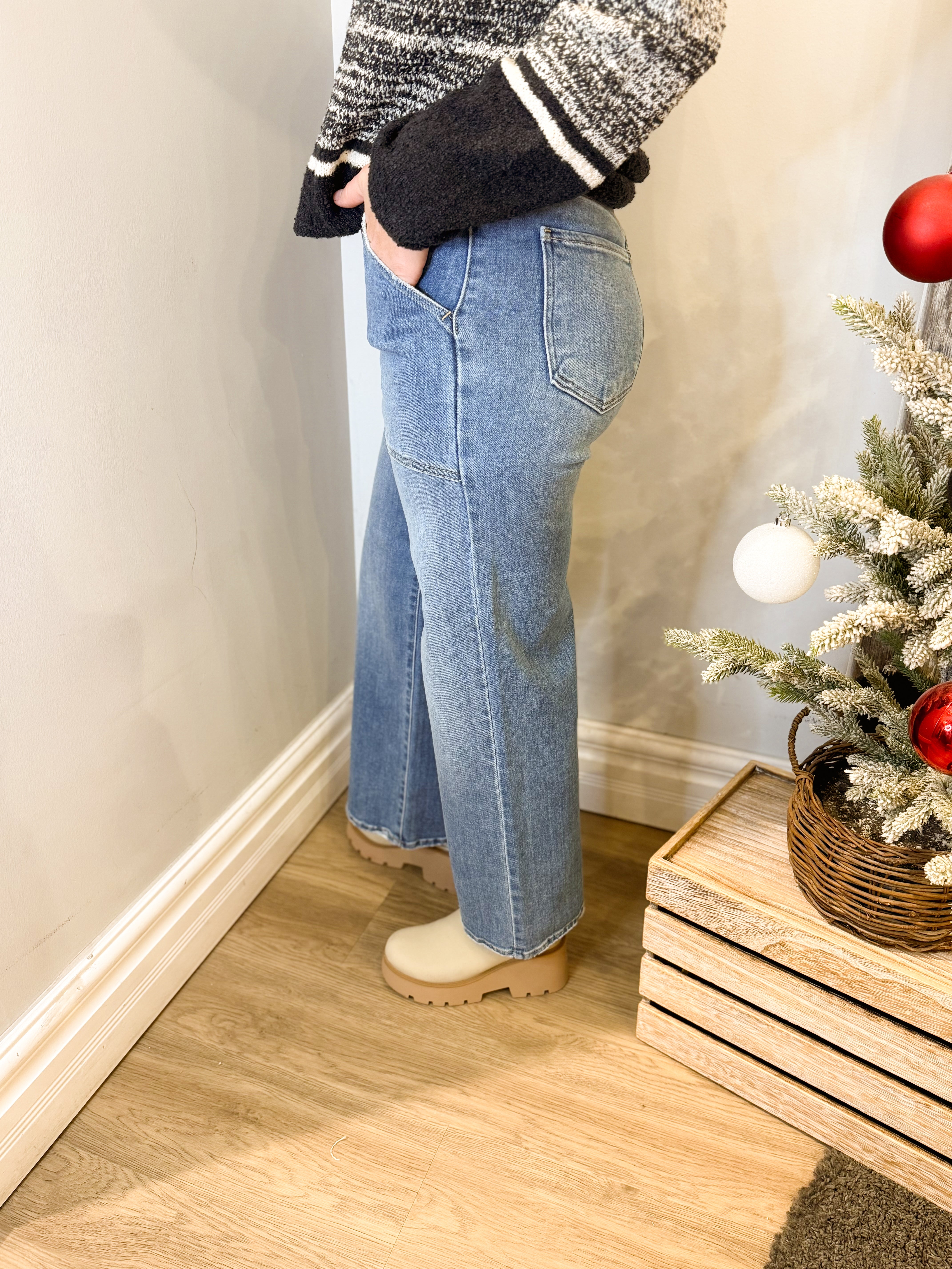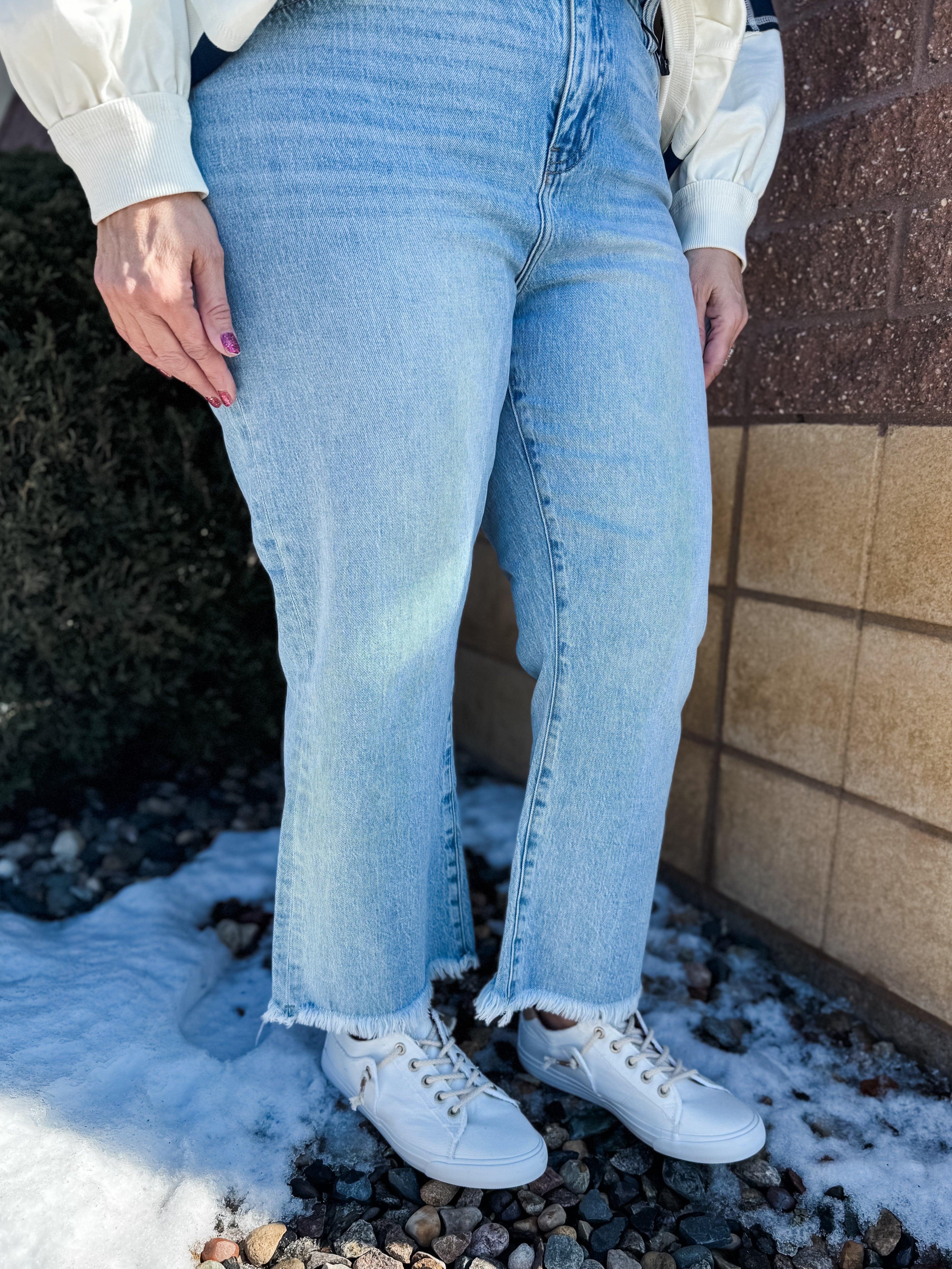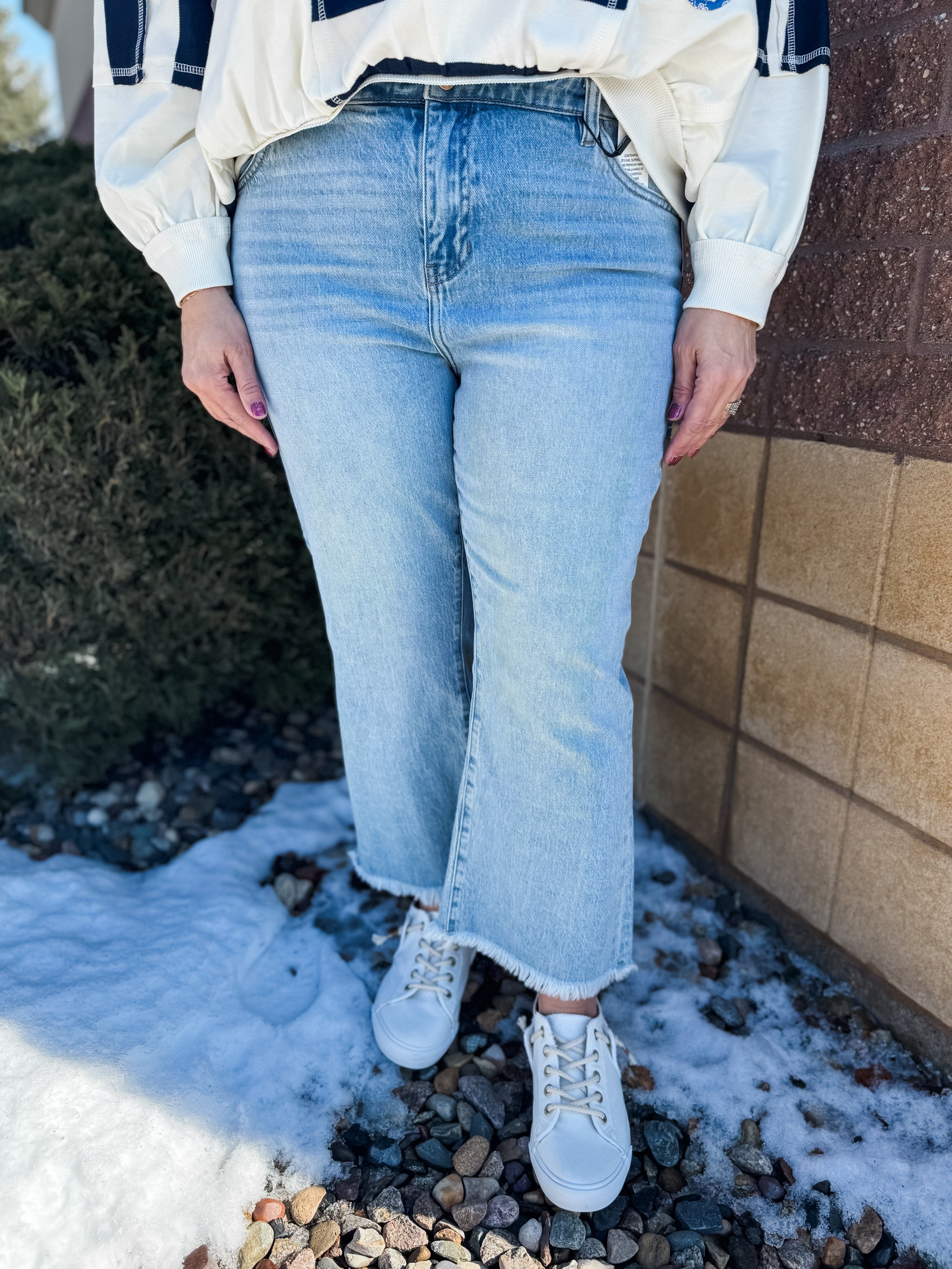 "Ab"solution Skyrise Diagonal Fray Panel Released Hem Wide Leg Jeans