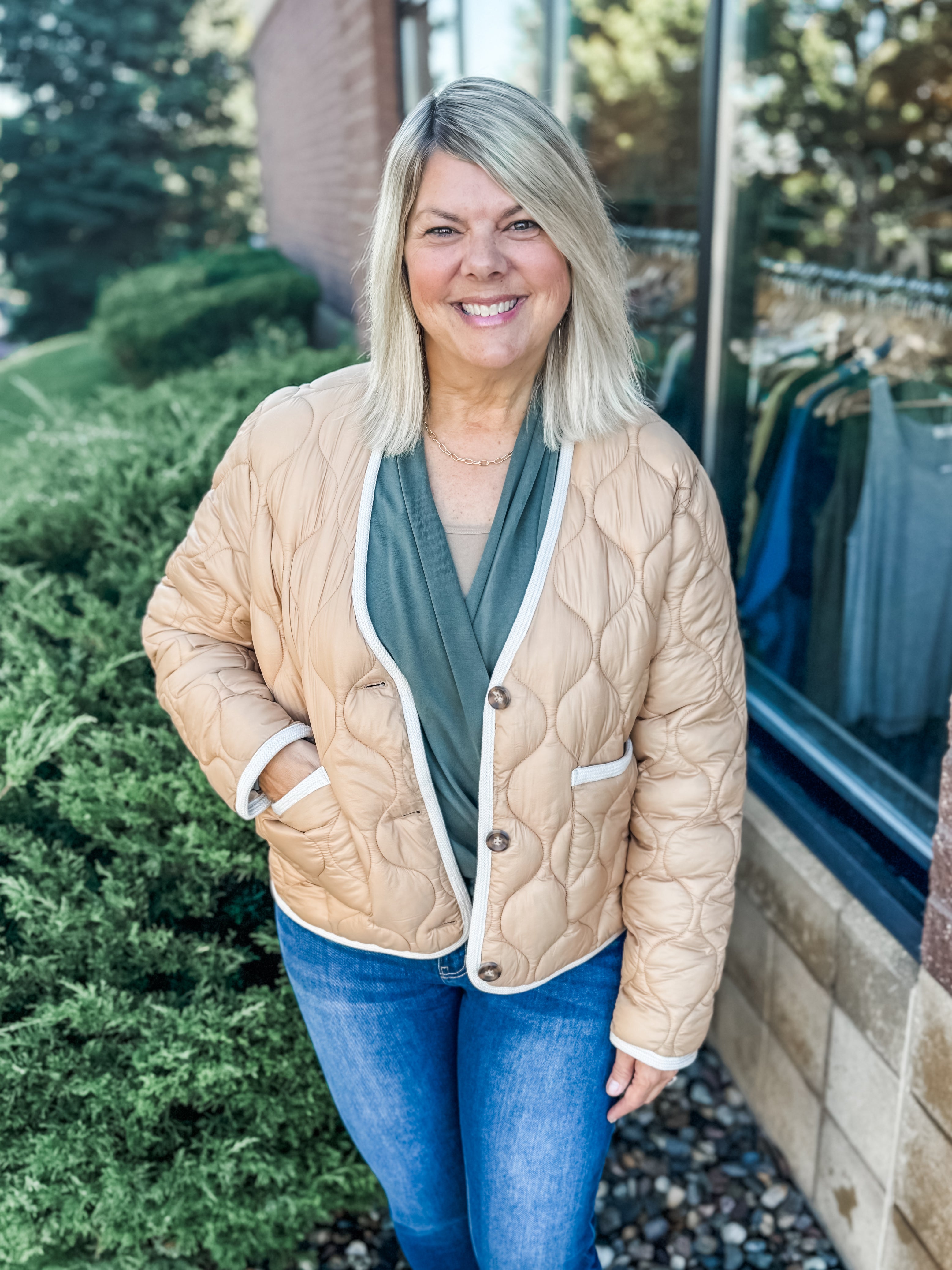 This quilted jacket is a versatile and stylish addition to your outerwear collection. With its classic button-front closure, cozy quilted design, and contrast piping, this jacket provides both warmth and fashion. Perfect for layering, it features a comfortable fit and a timeless look that pairs effortlessly with any outfit.