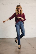 Designed with a 10" rise, these jeans sit comfortably at the waist, providing both style and support. The dark bronze stitching adds a touch of sophistication and contrast, enhancing the rich denim fabric.