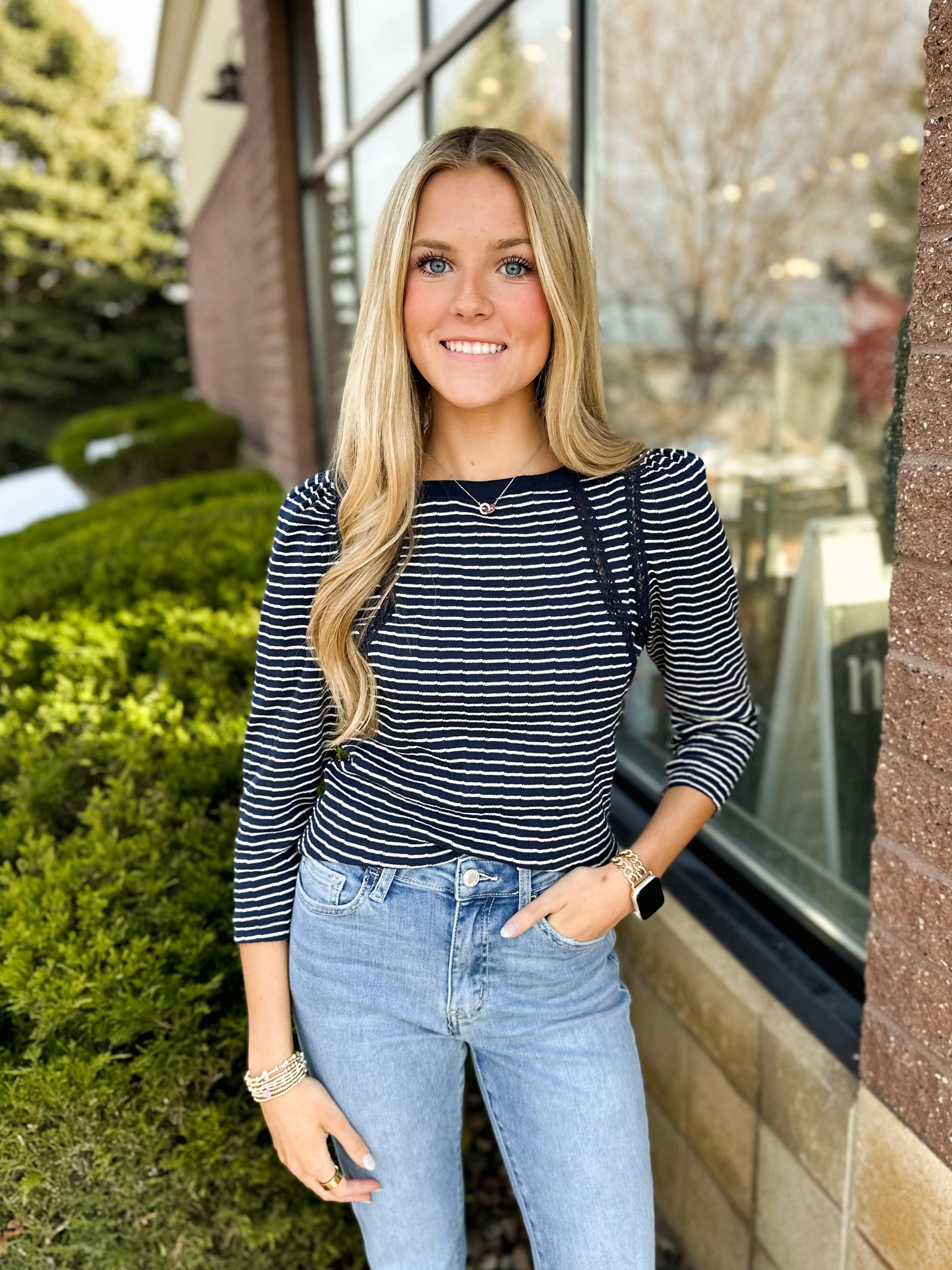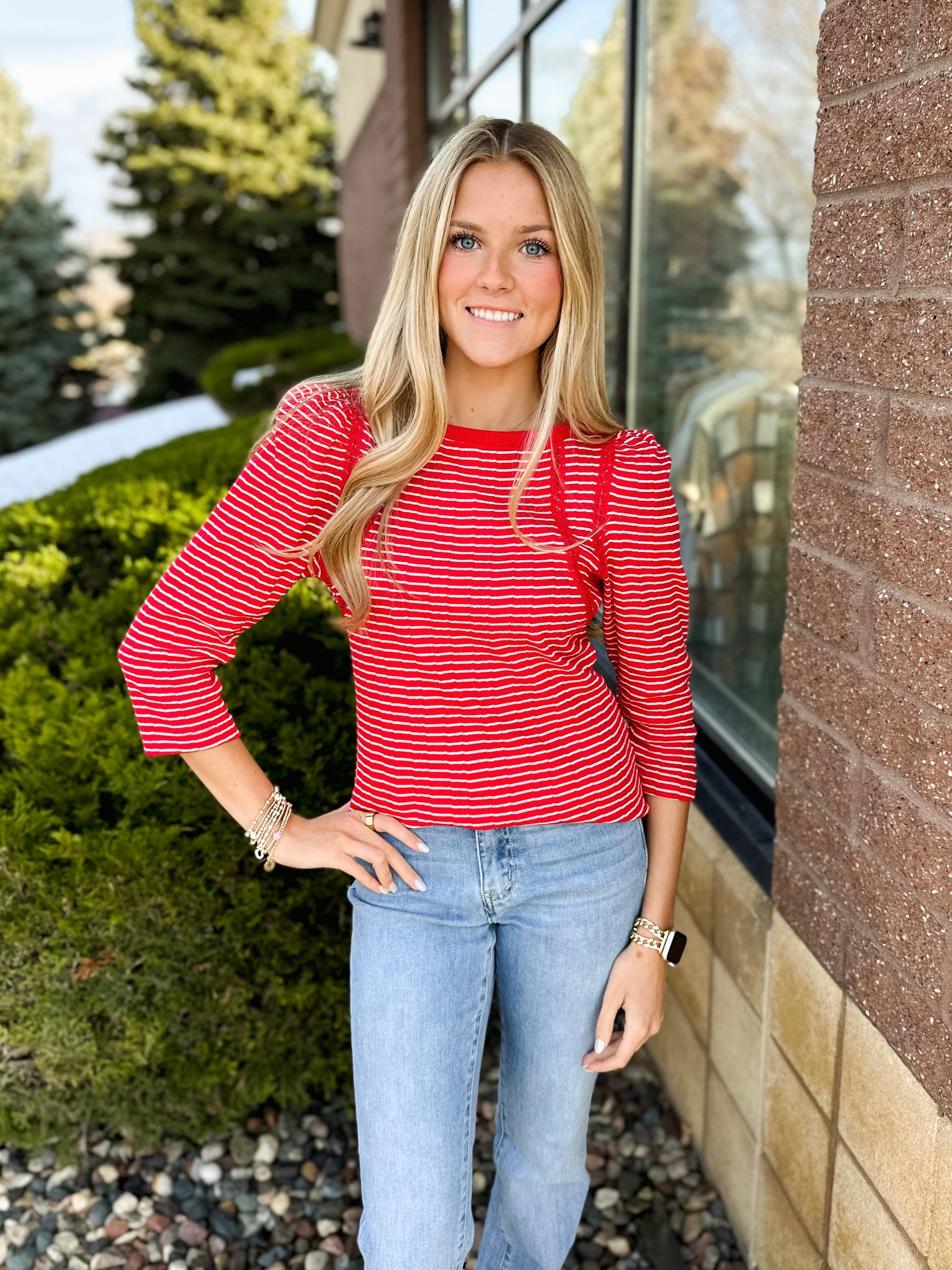 3/4 Sleeve Boat Neck Knit Top with Crochet Detail