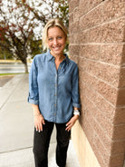 Chambray Collared 3/4 Tab Sleeve Button Down Shirt