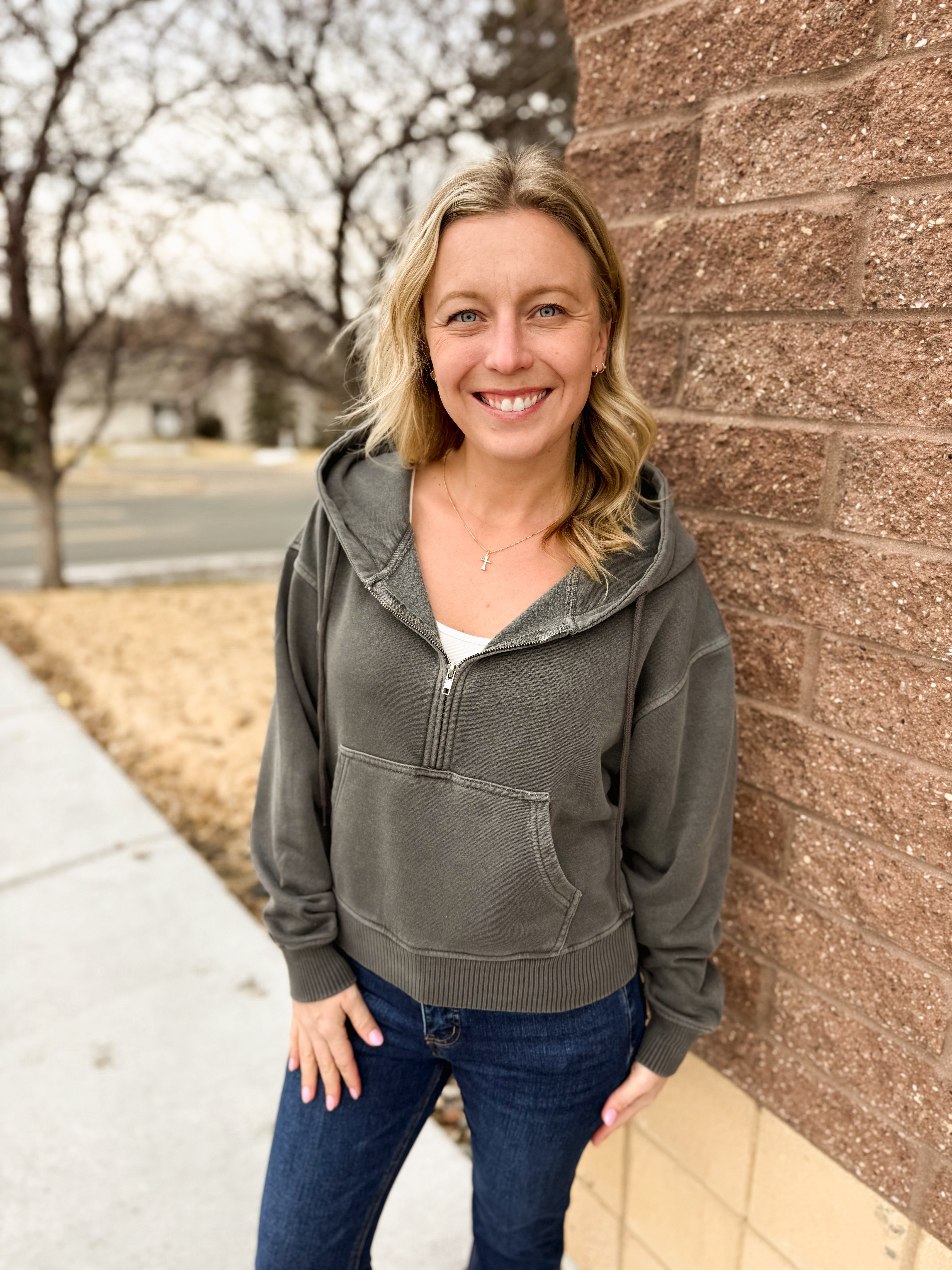 Fleece Pigment Dye Half Zip Kangaroo Pocket Hoodie