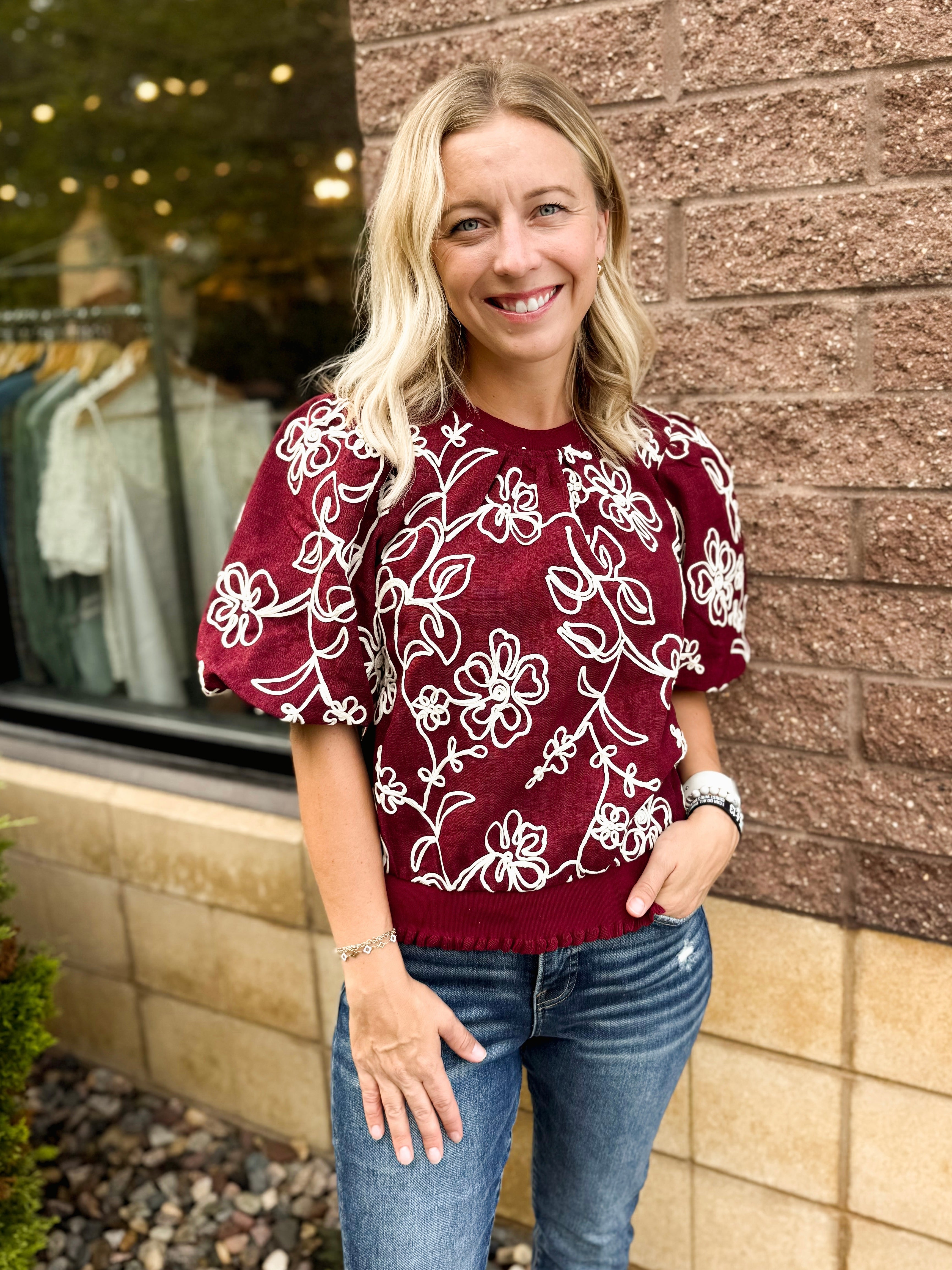 Floral Embroidered Short Bubble Sleeve Top