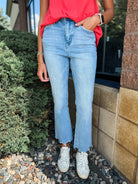 High Rise Uneven Raw Hem Kick Flare Jeans
