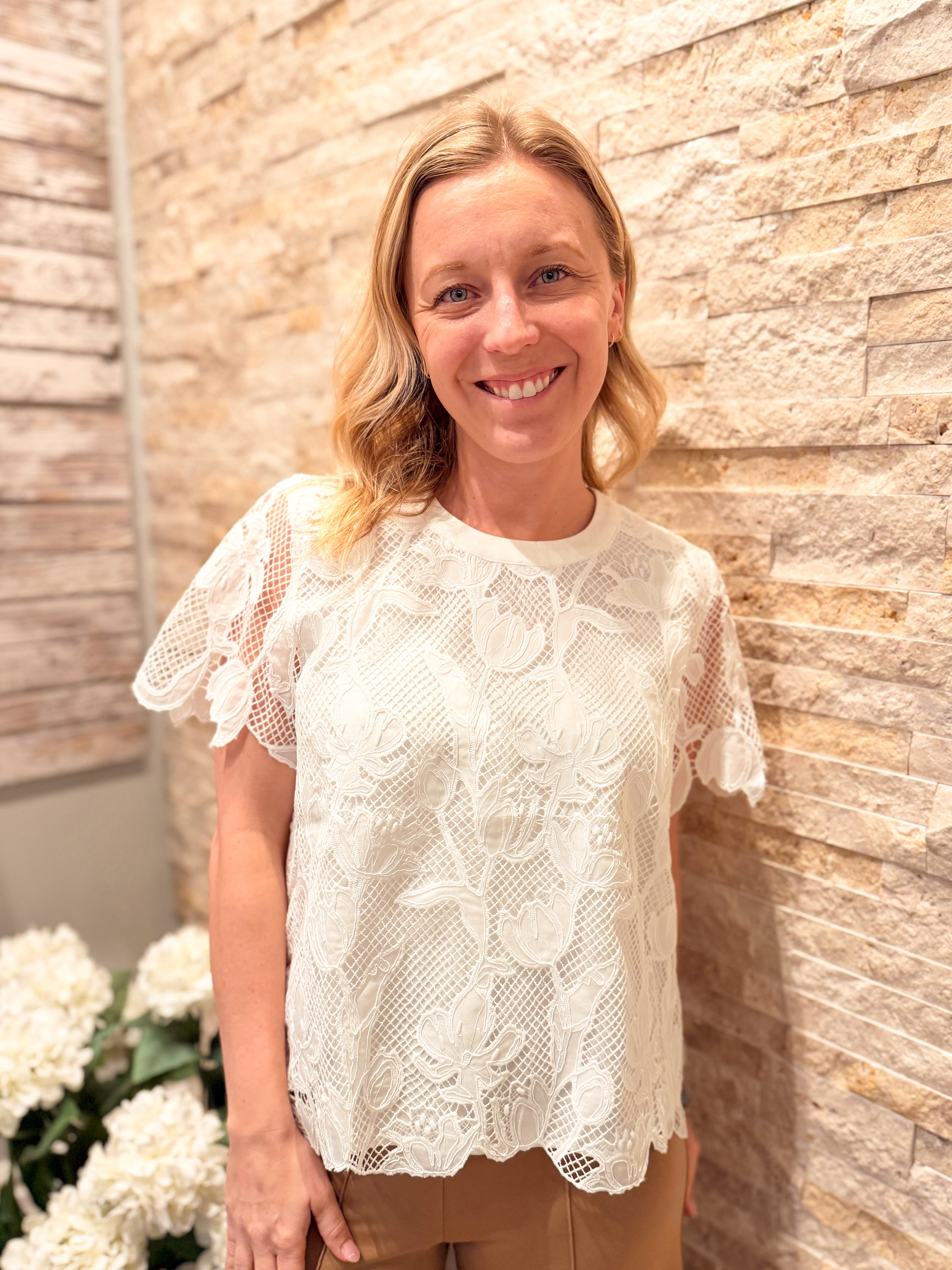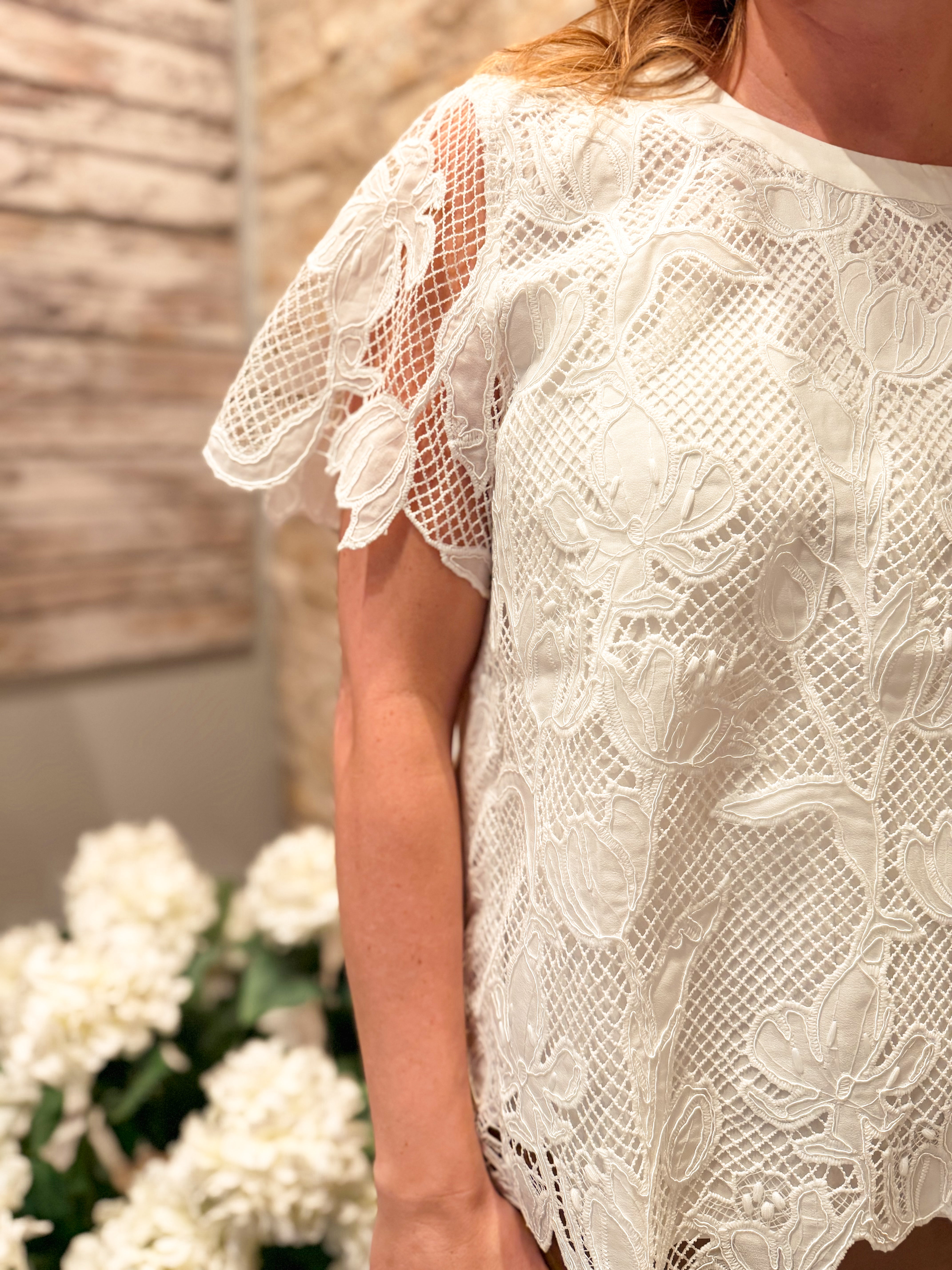 Lace Overlay Round Neck Short Sleeve Top