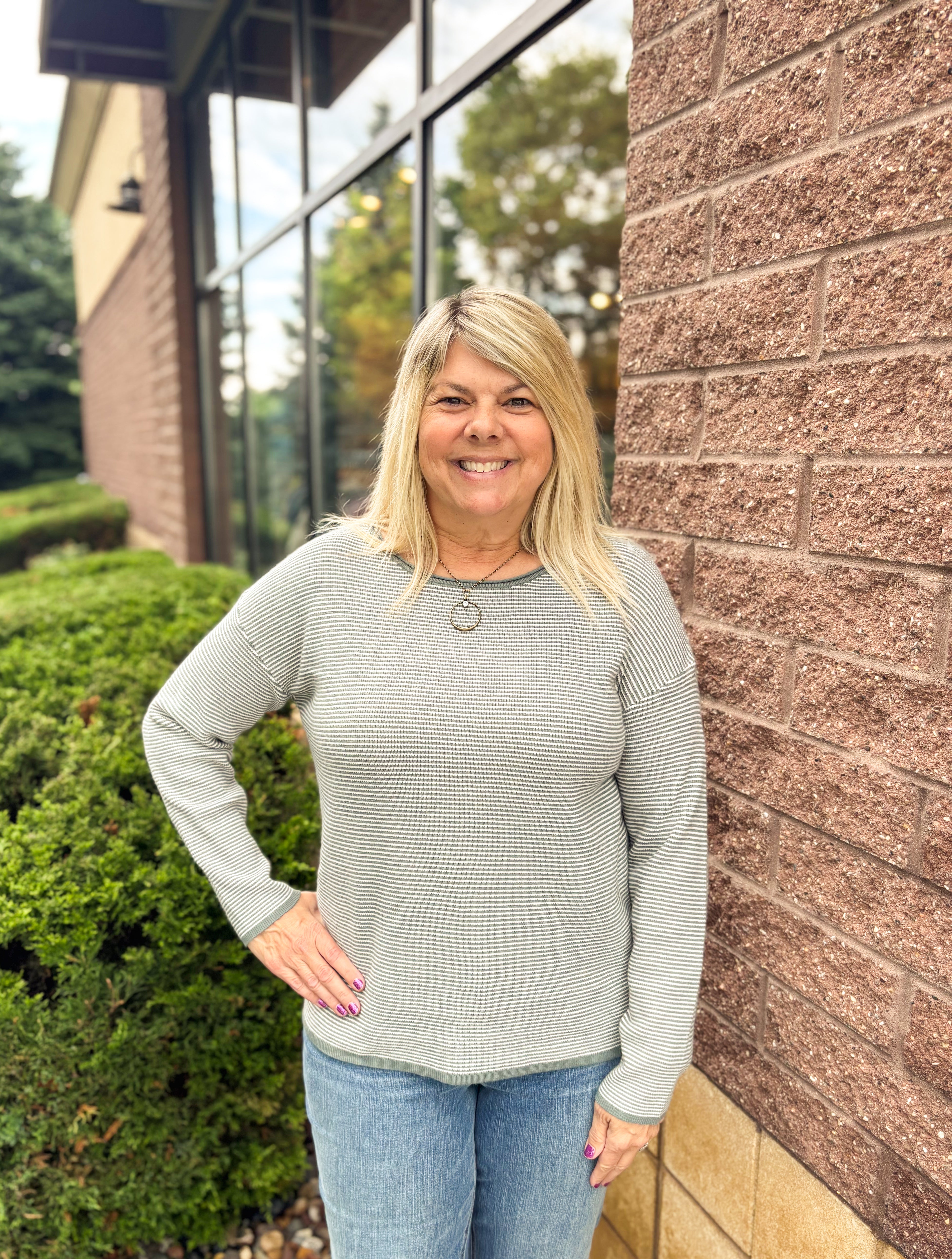 Pinstriped Waffle Wide Crew Neck Long Sleeve