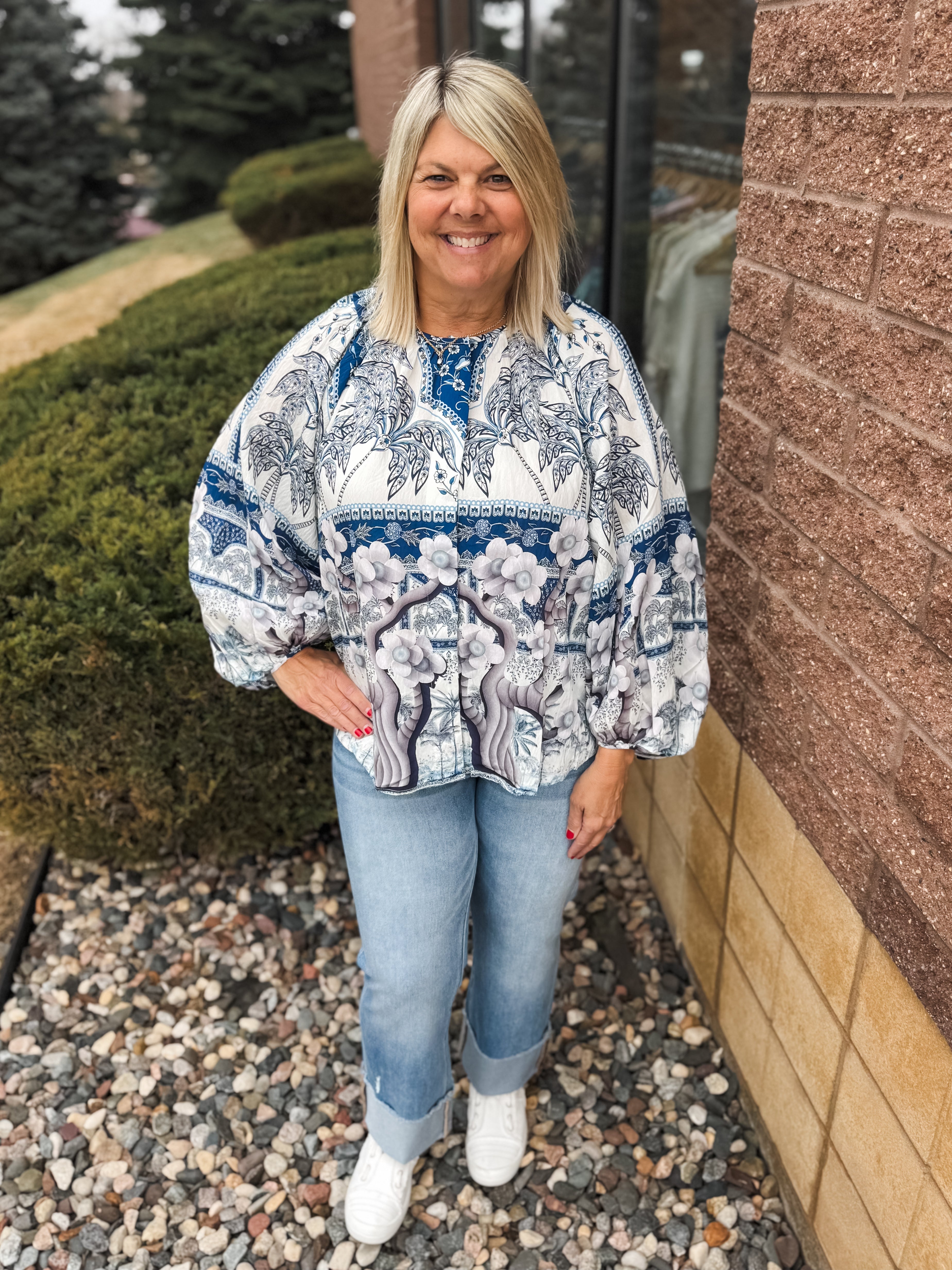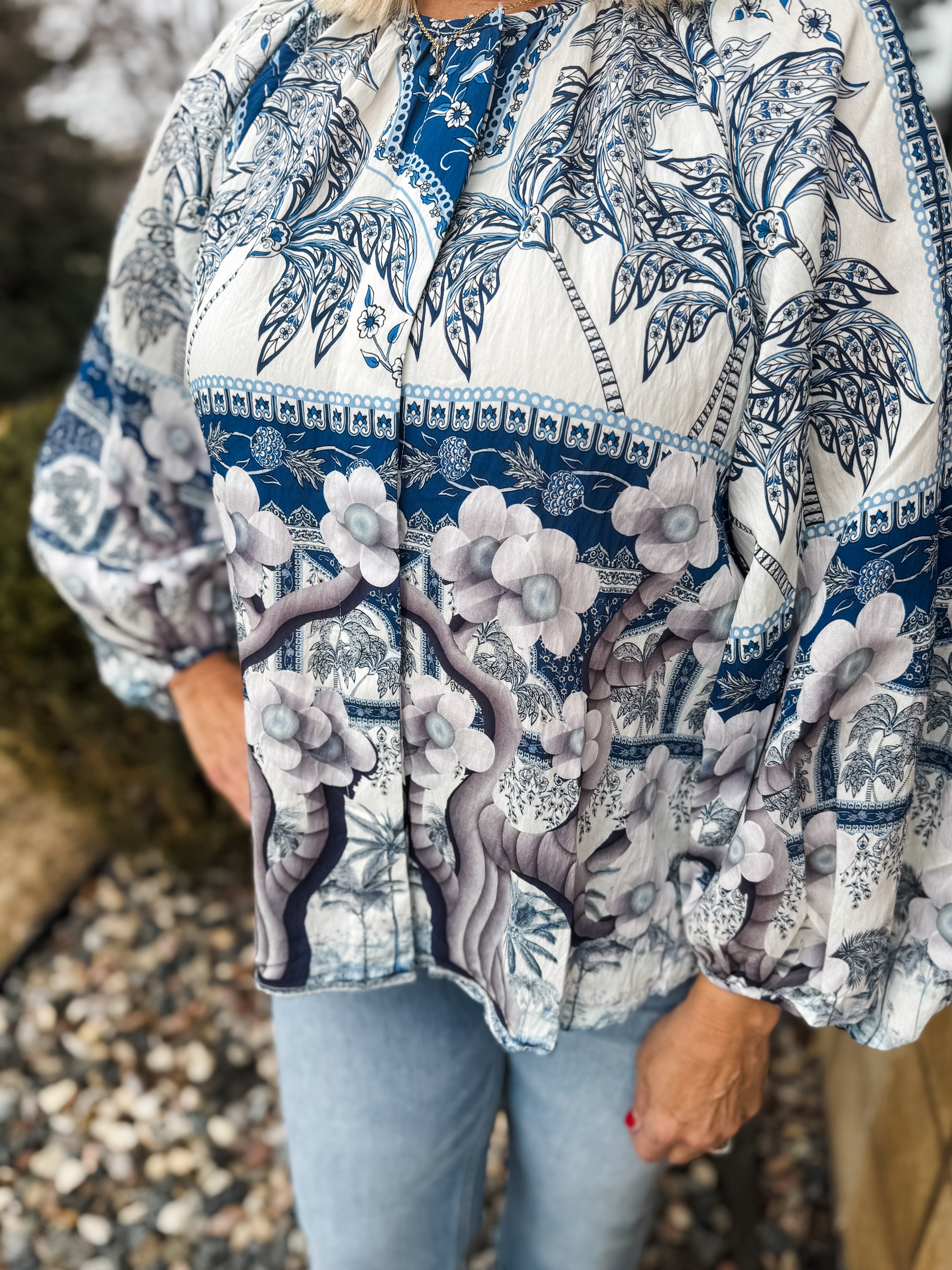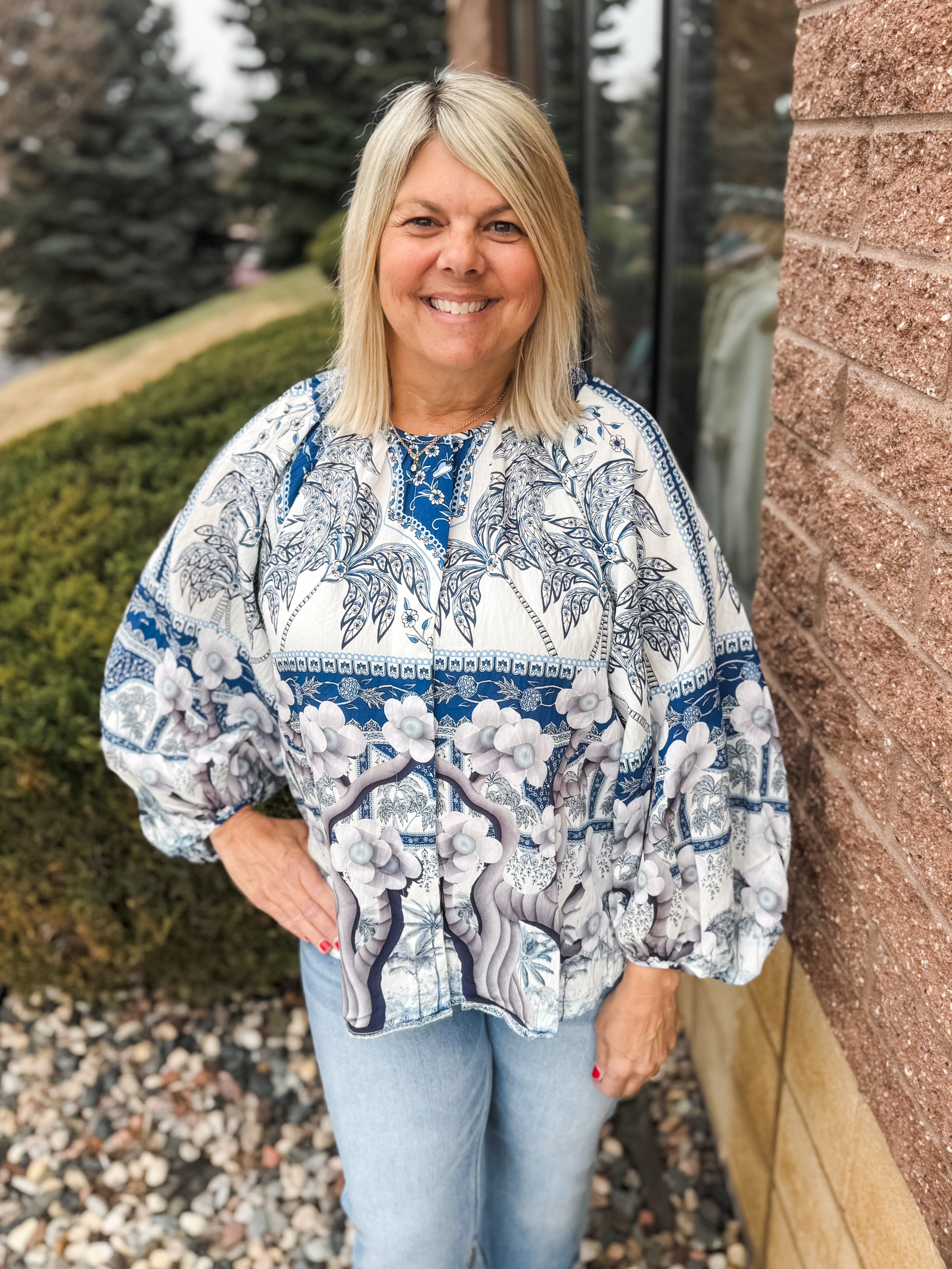Printed Long Sleeve Top With Split Neckline And Tie Detail
