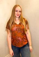 SHORT SLEEVE V NECK PRINTED BOYFRIEND TEE WITH EMBROIDERED DETAIL