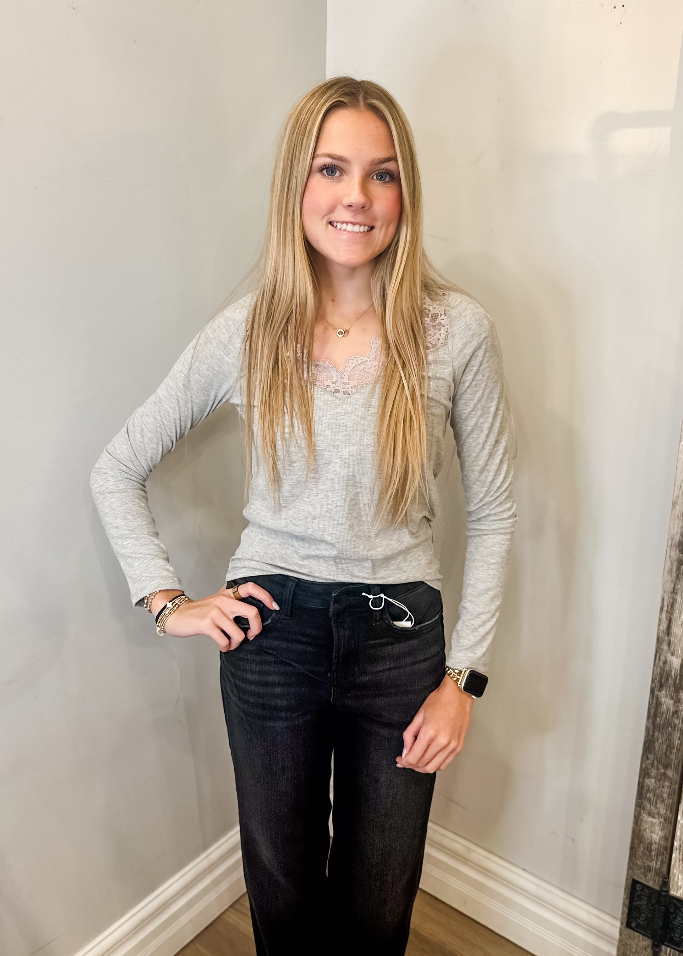 V-neck Lace Trim Ribbed Knit Long Sleeve Top