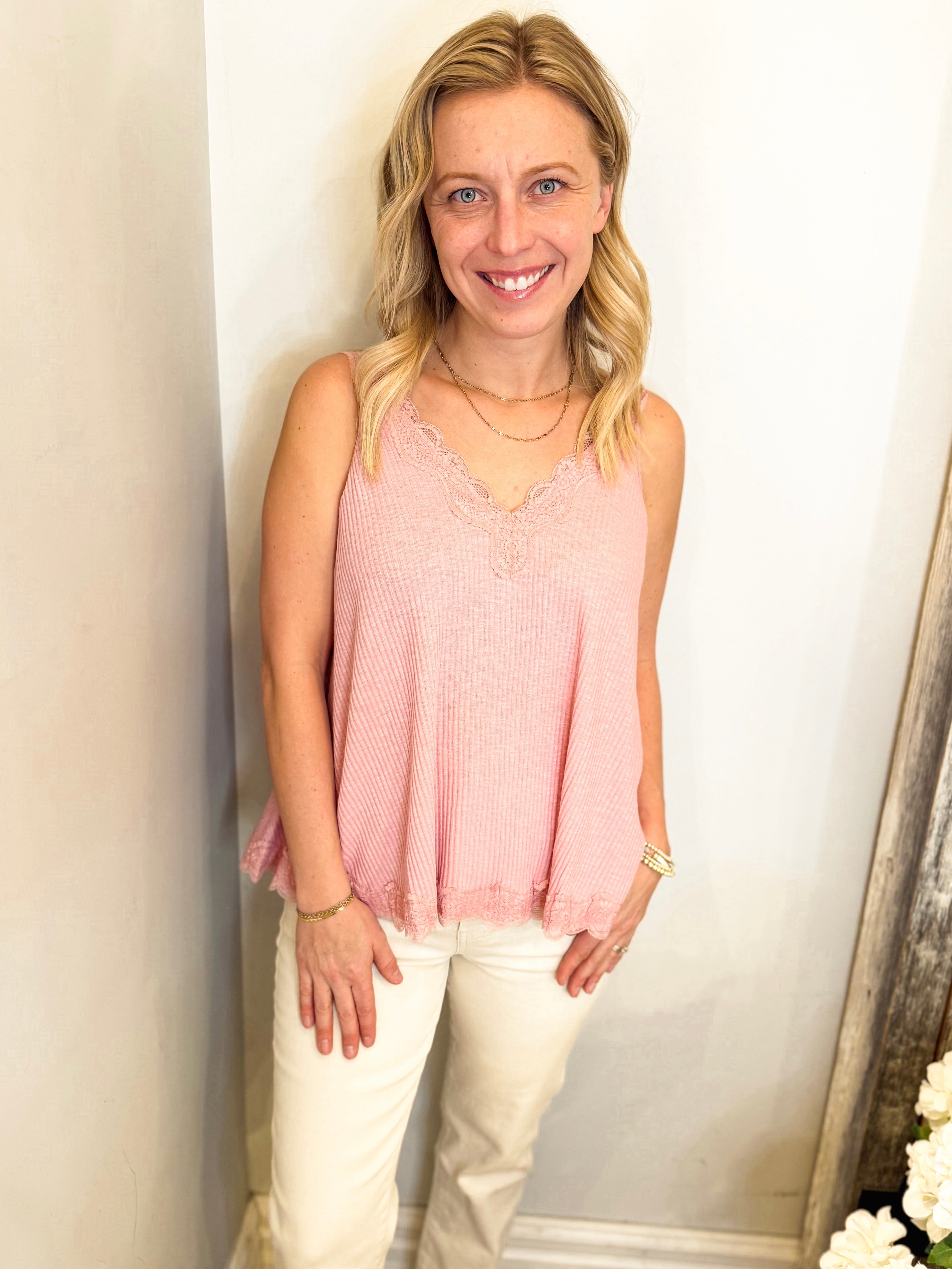 V-Neck Sleevless Lace Trim Solid Tank Top