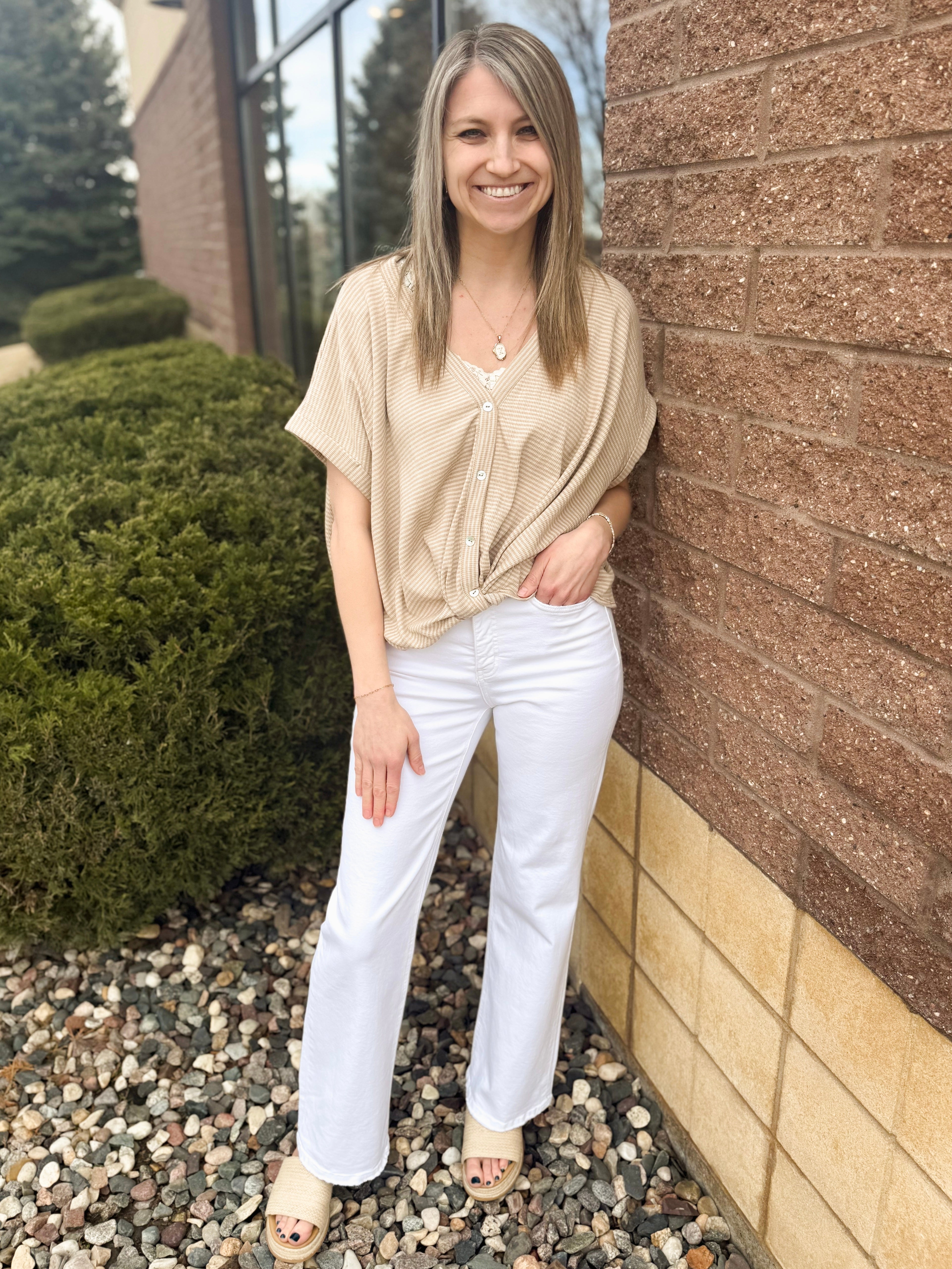 V-Neck Button Up Short Sleeve Stripe Top