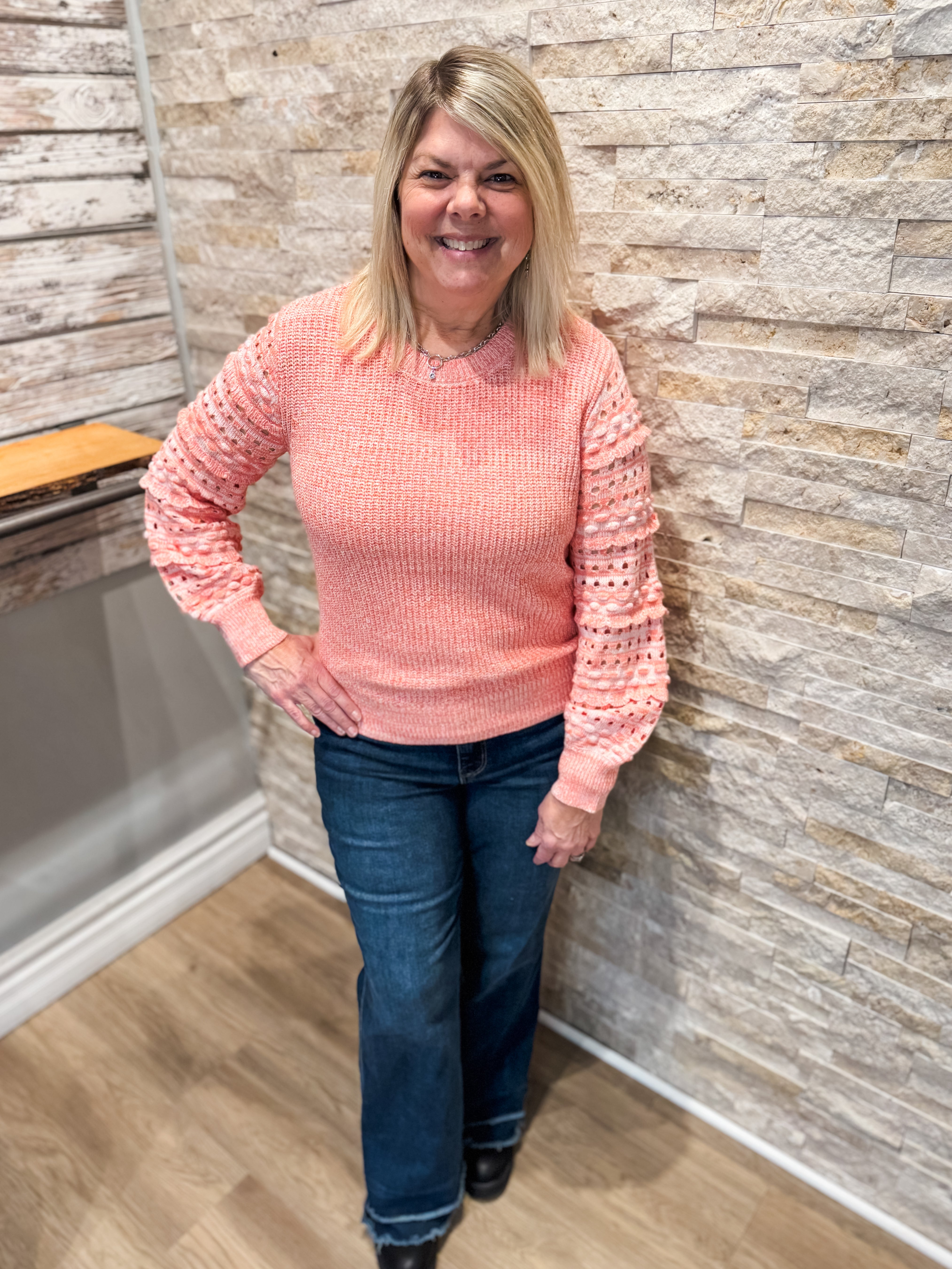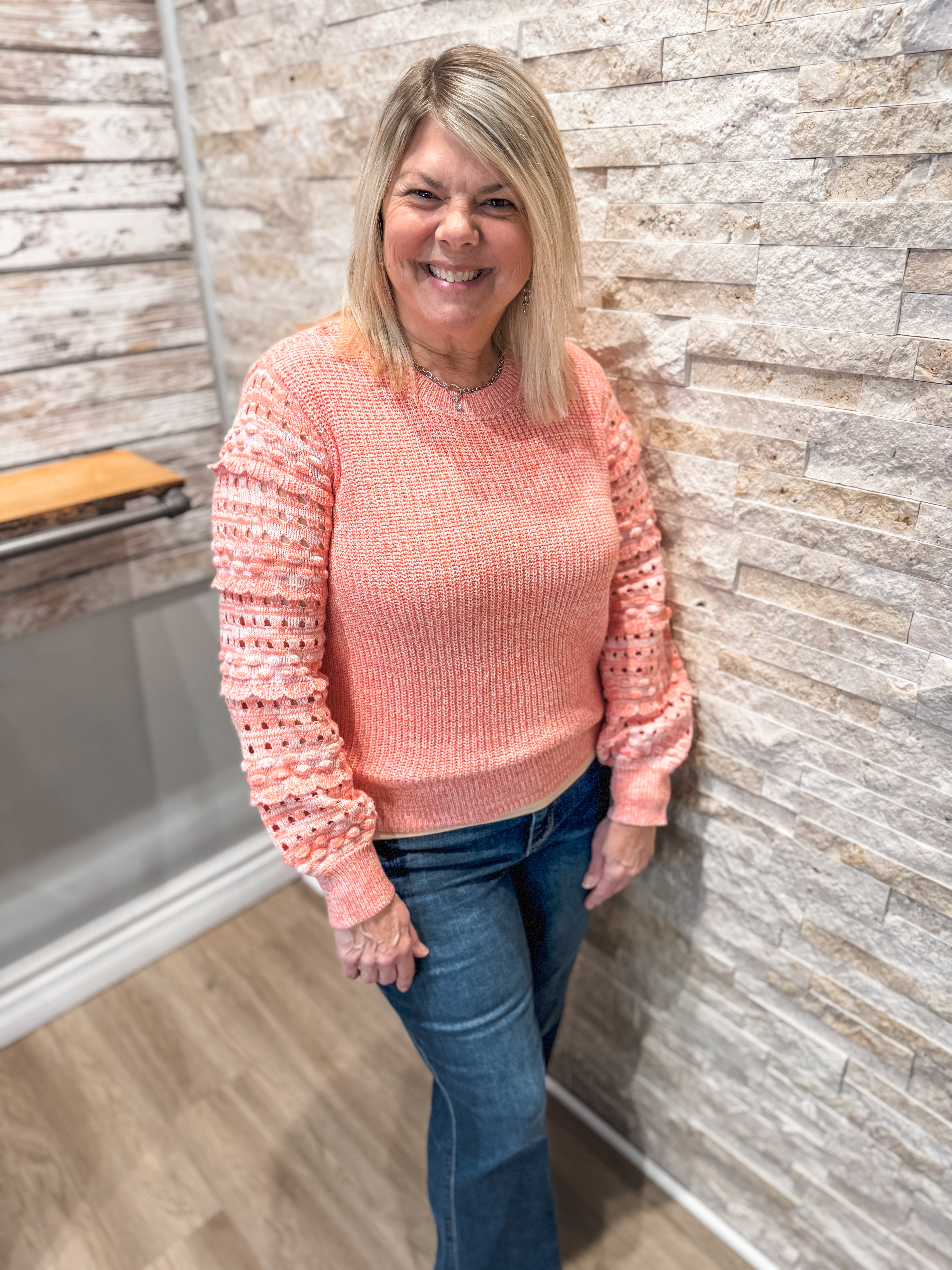 Crew Neck Sweater With Textured Sleeve