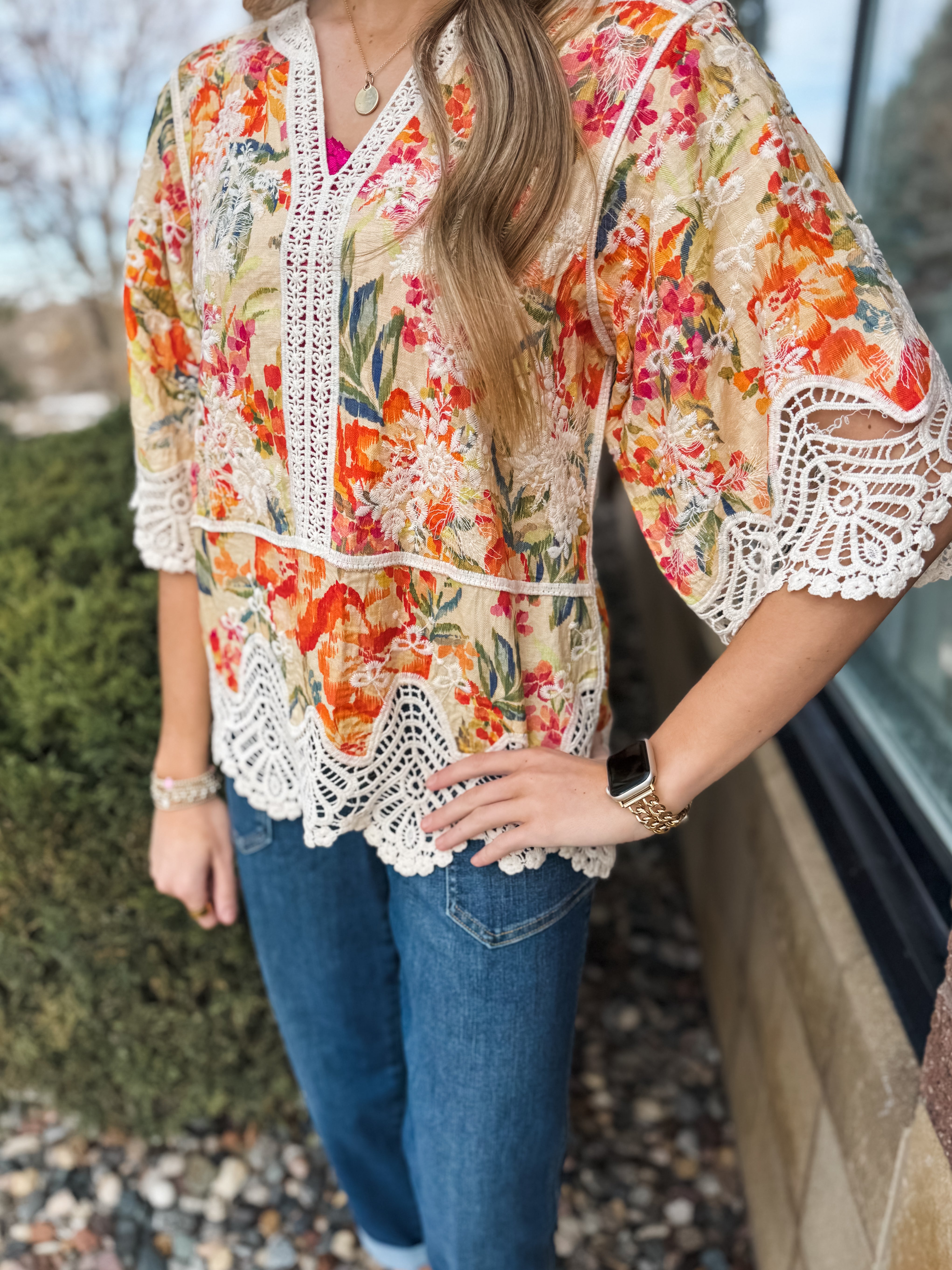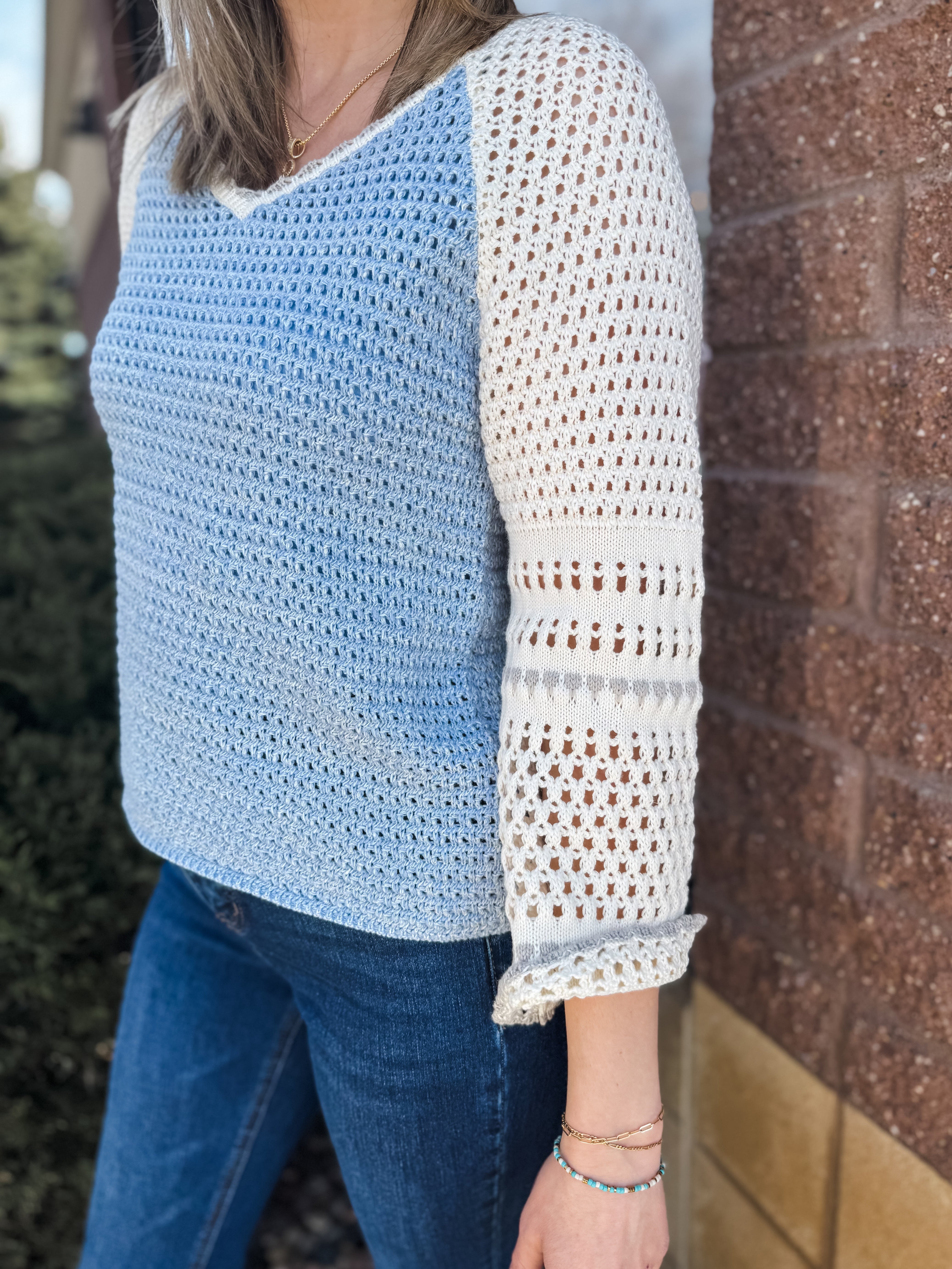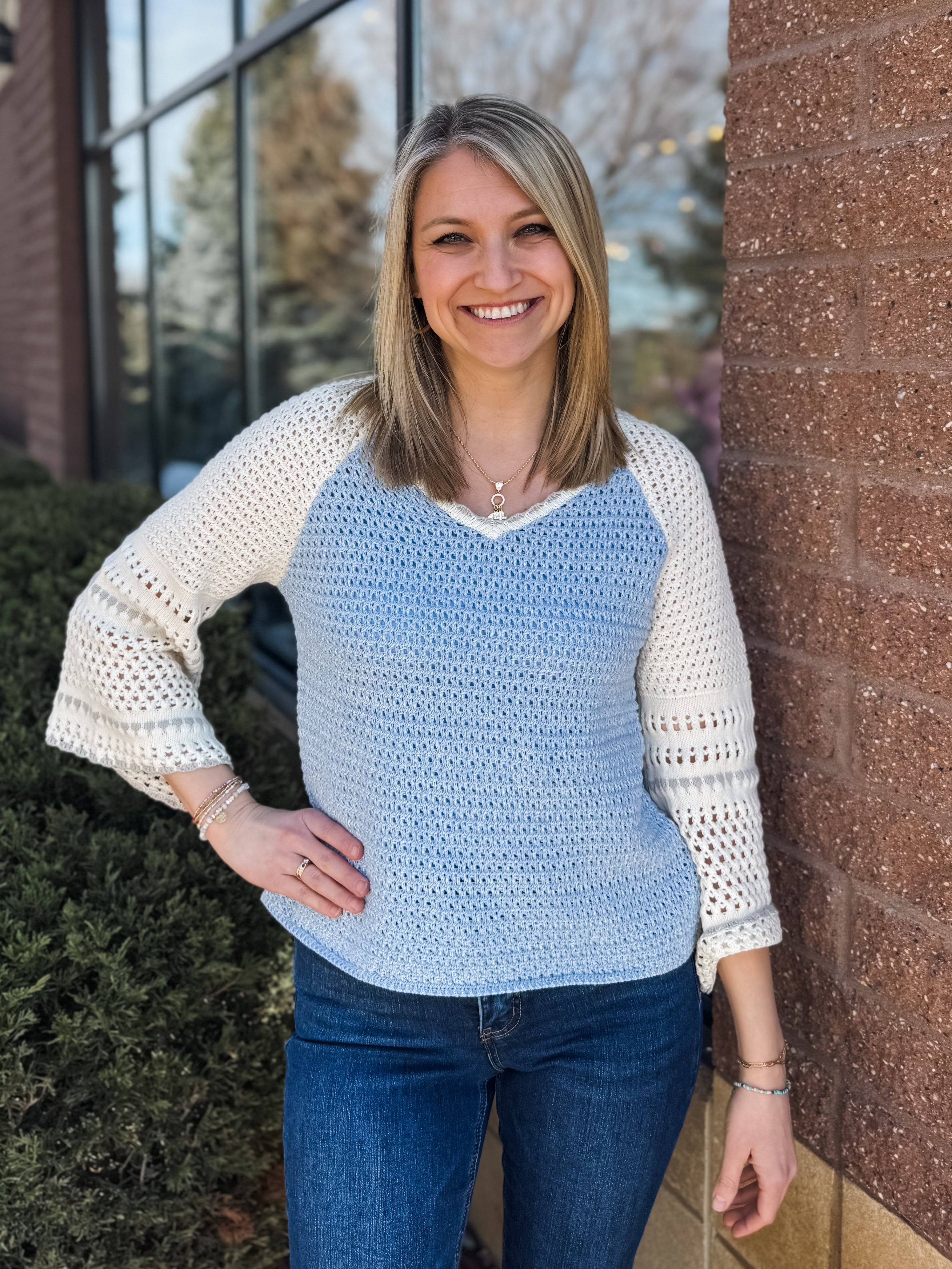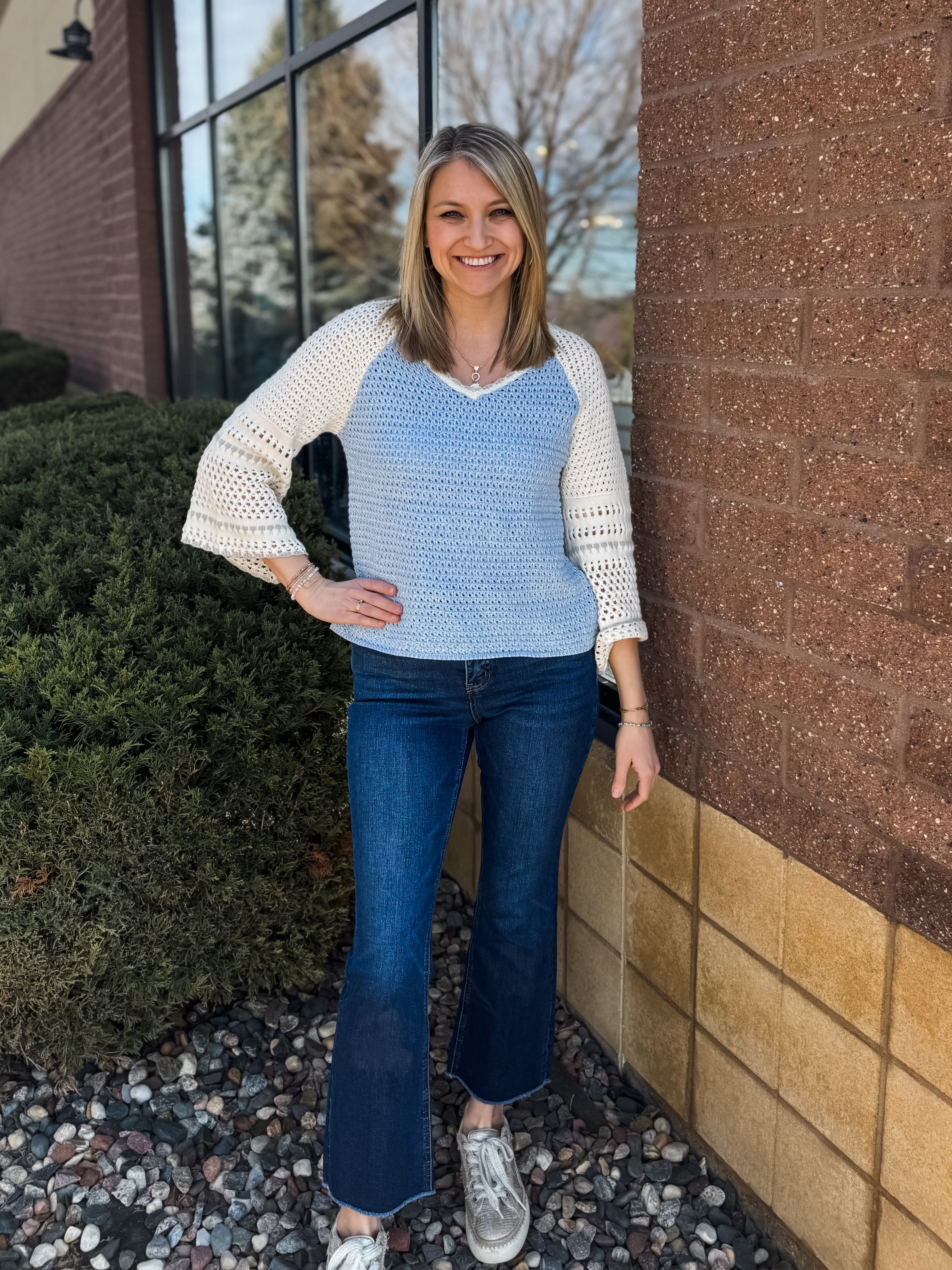Below Elbow Sleeve V-Notch Neck Scallop Edge Peplum Crochet Top