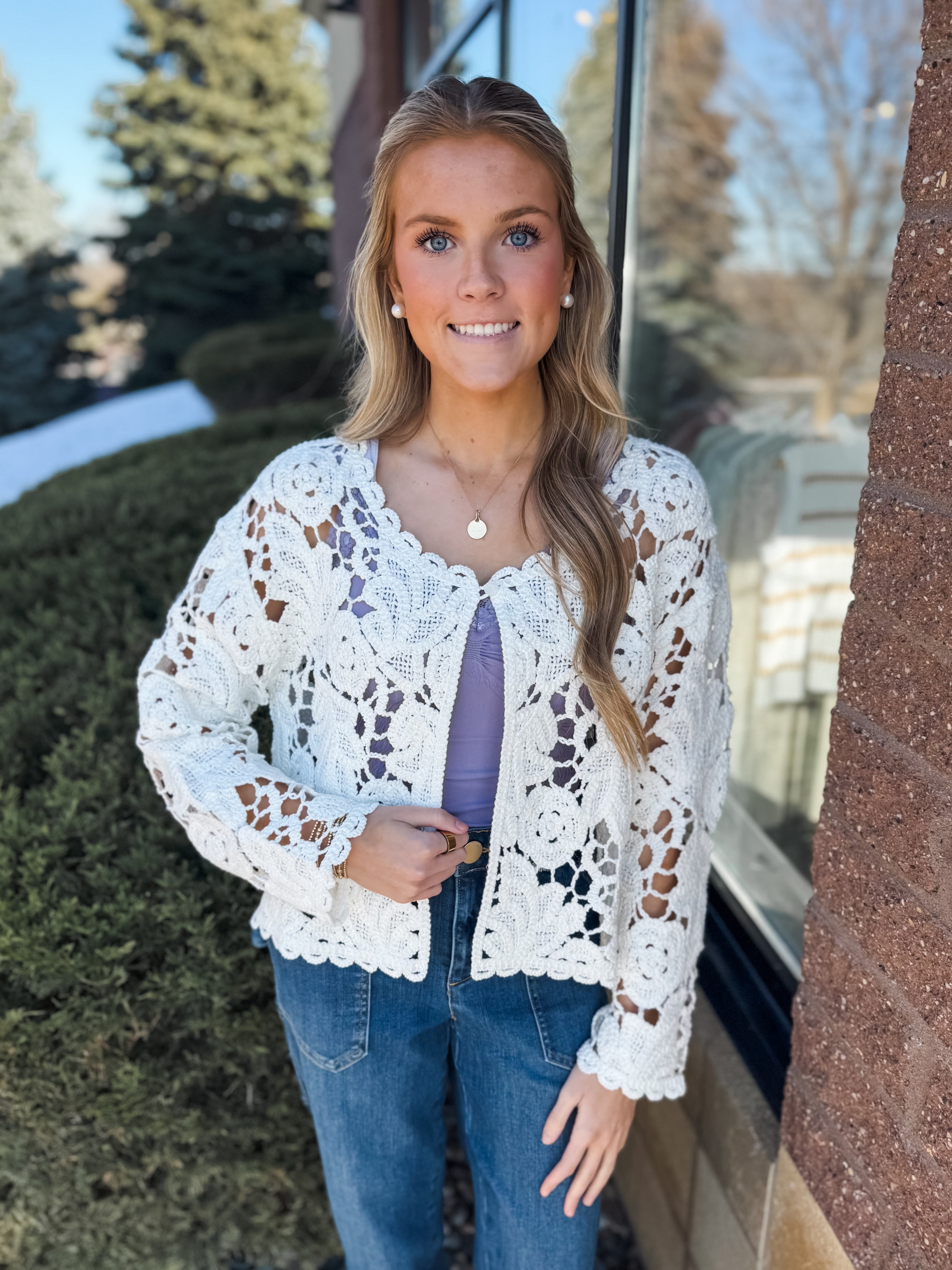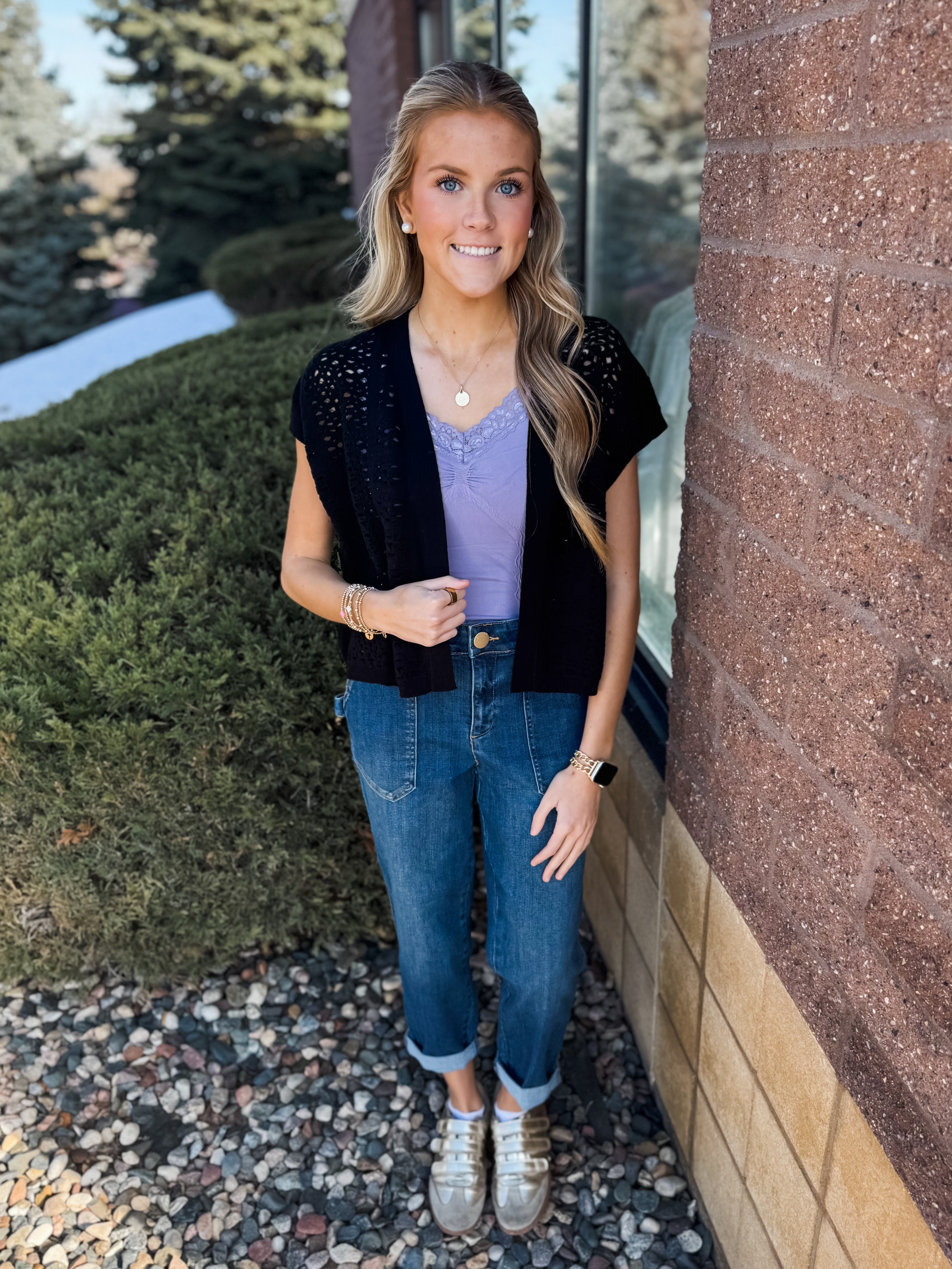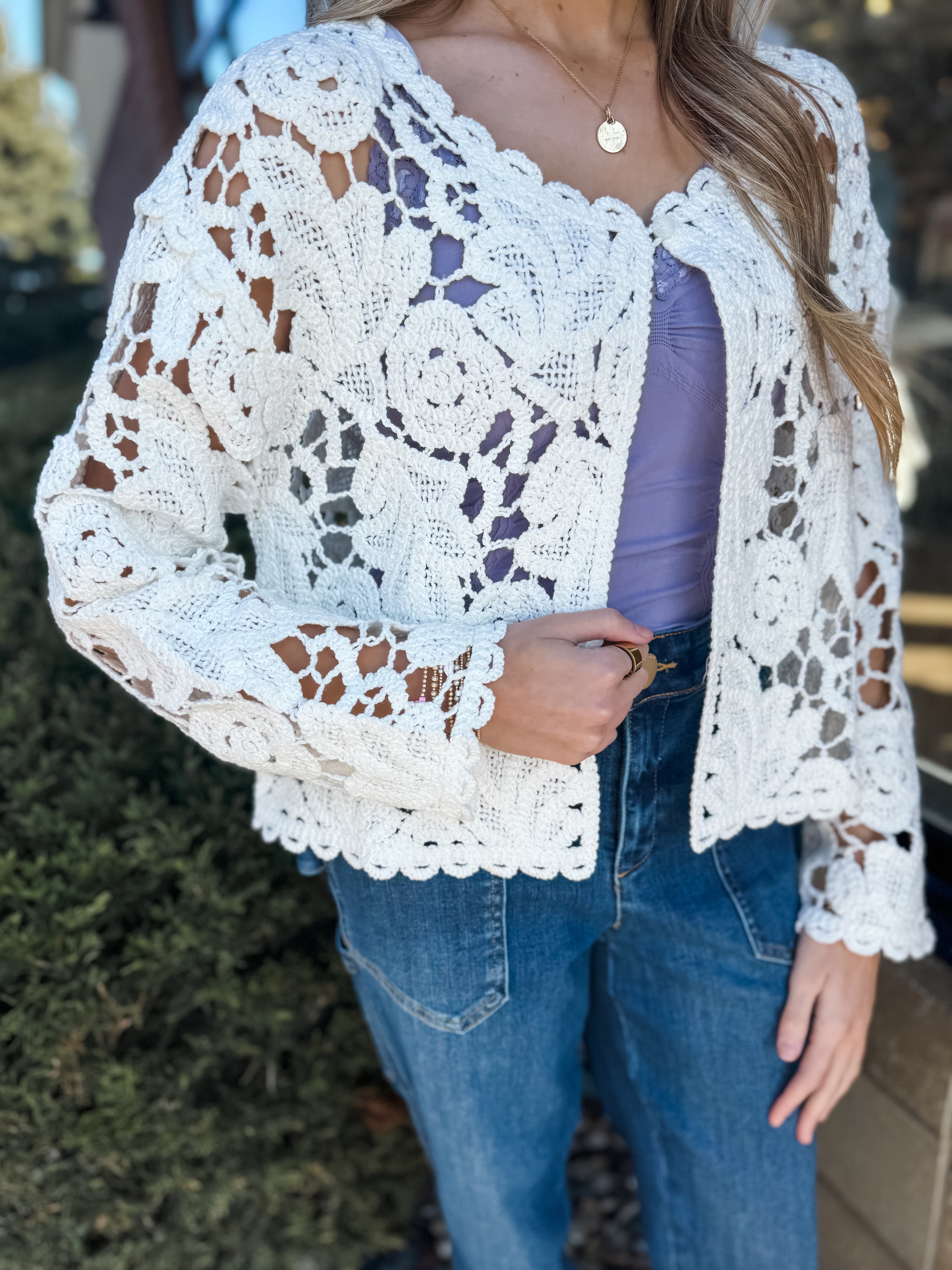 Below Elbow Sleeve V-Notch Neck Scallop Edge Peplum Crochet Top