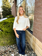 3/4 Dolman Sleeve Surplus Crew Neck Knit Top with Banded Hem and Mitered Details