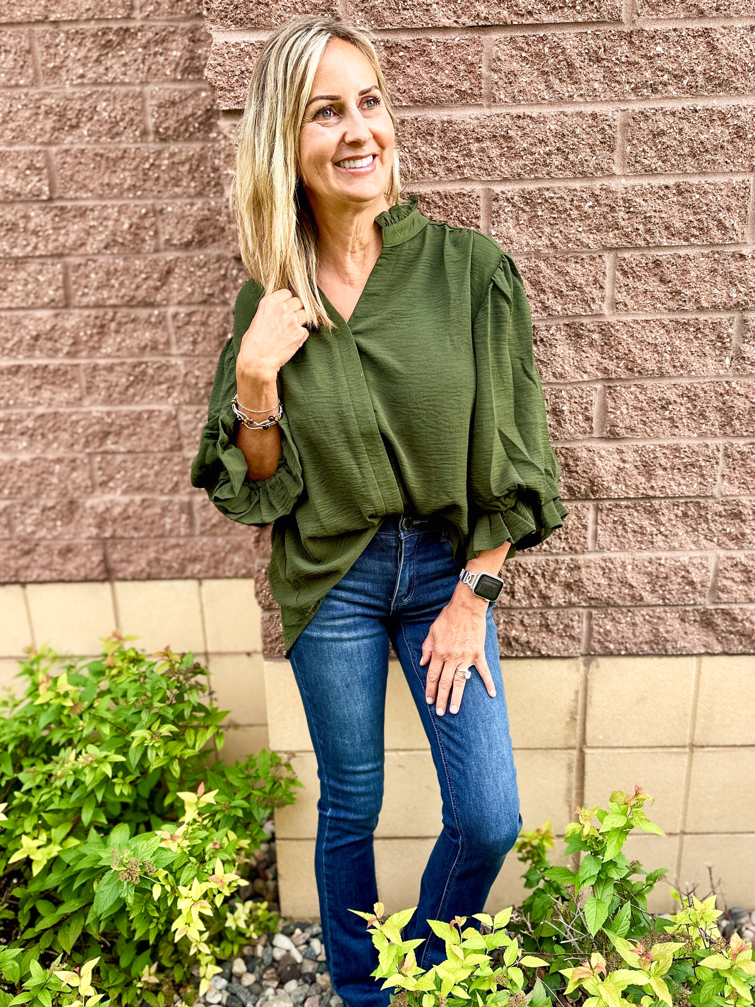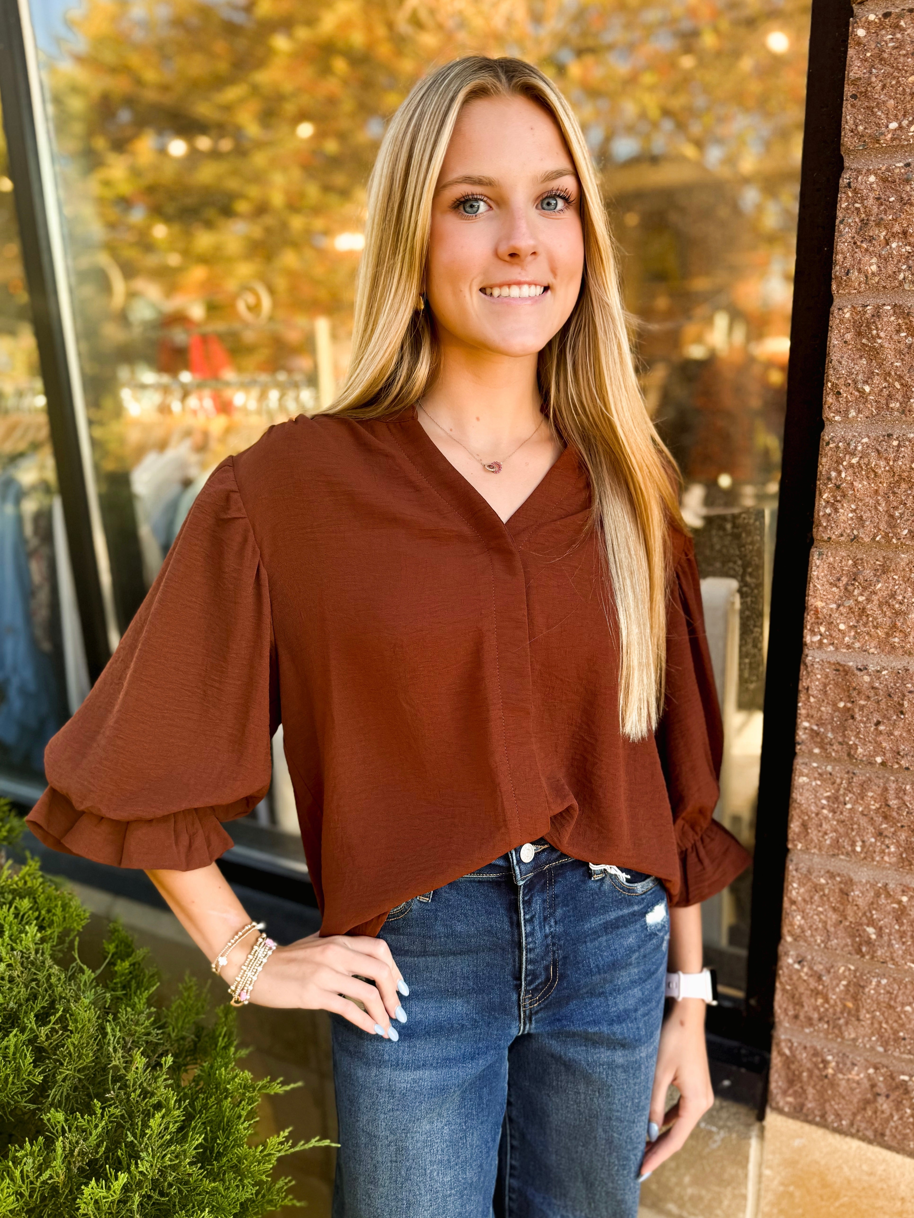 3/4 Length Gathered Balloon Sleeve Blouse