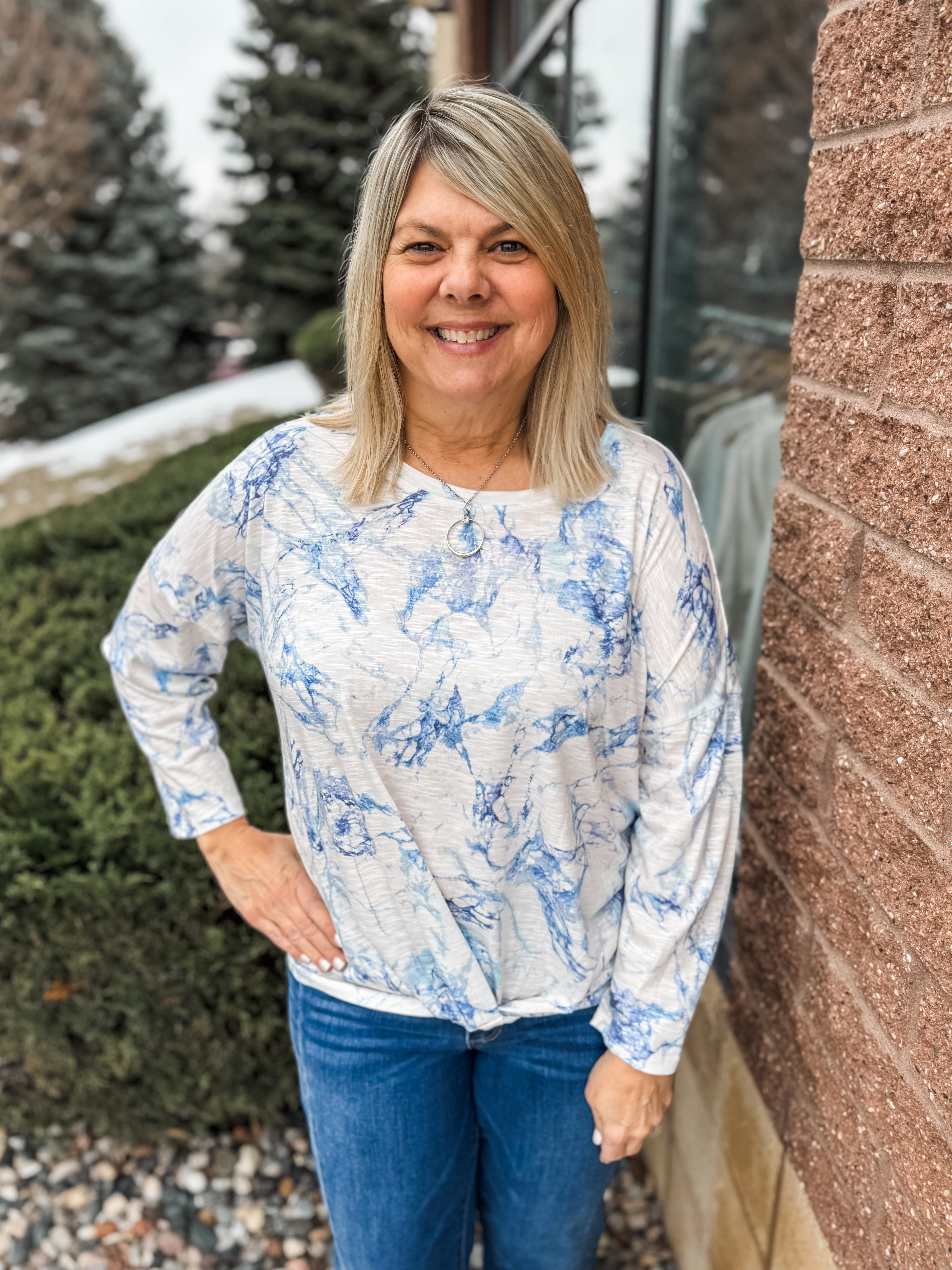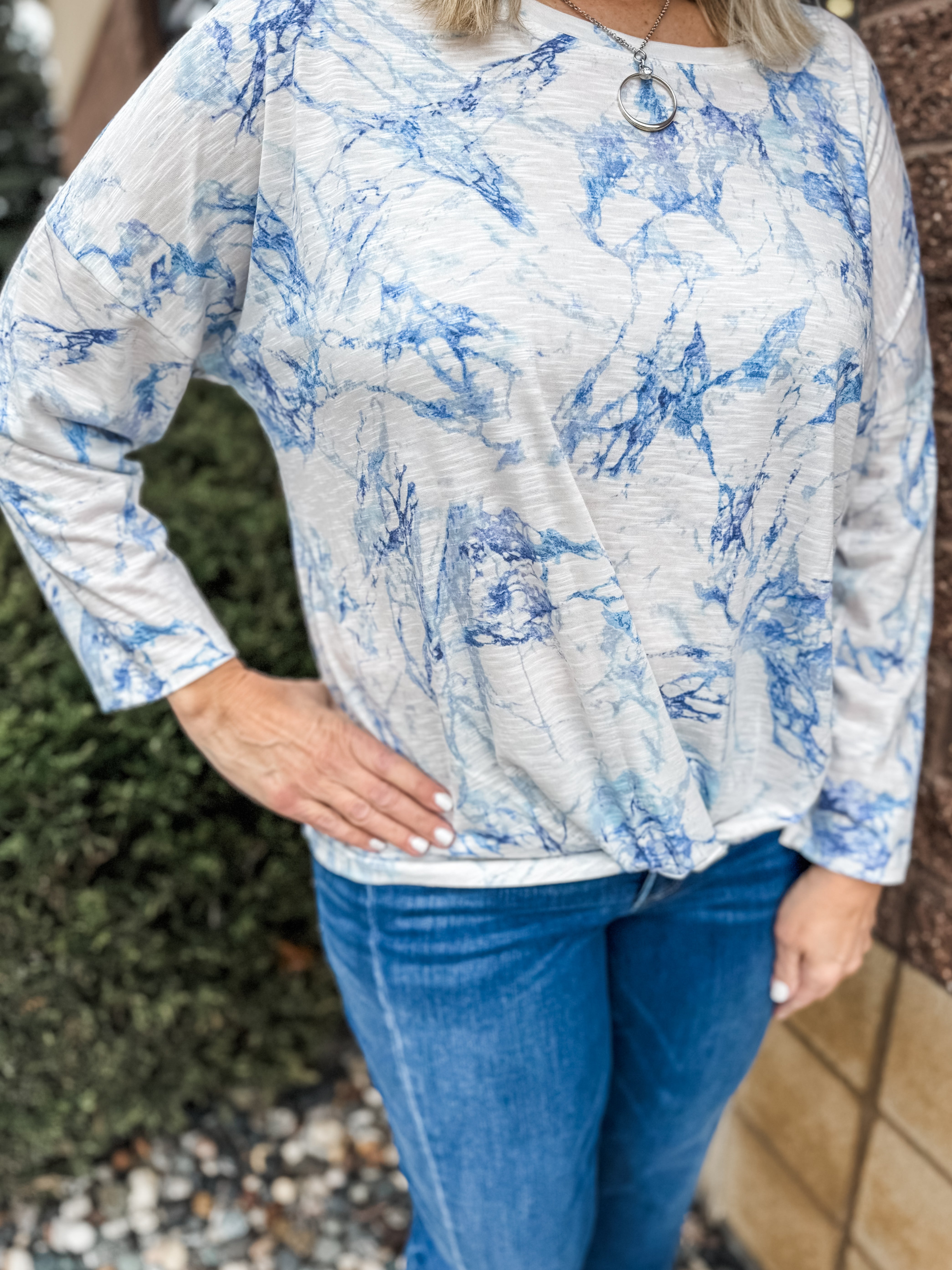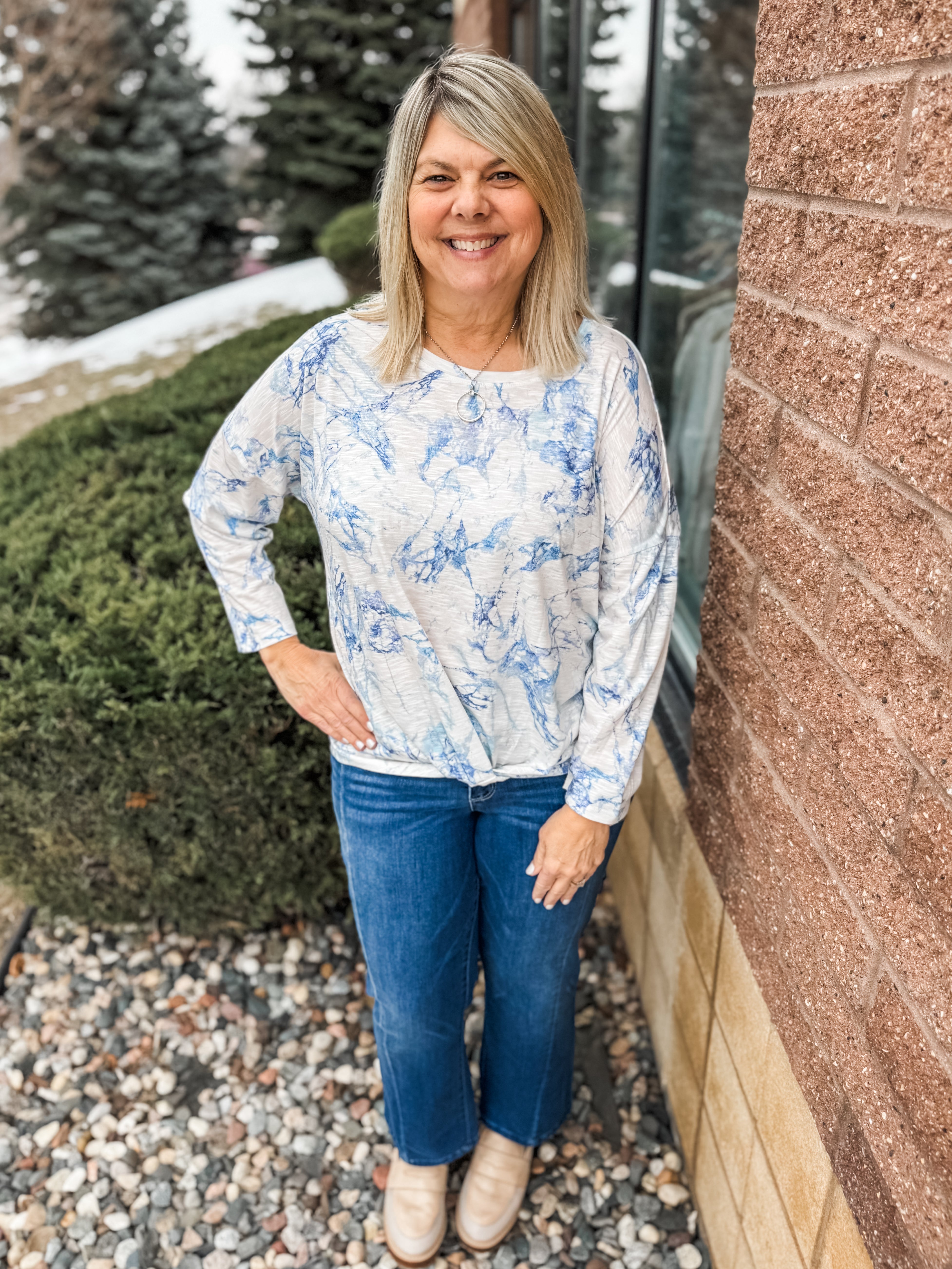 3/4 Sleeve Scoop Neck Twist Hem Printed Knit Top