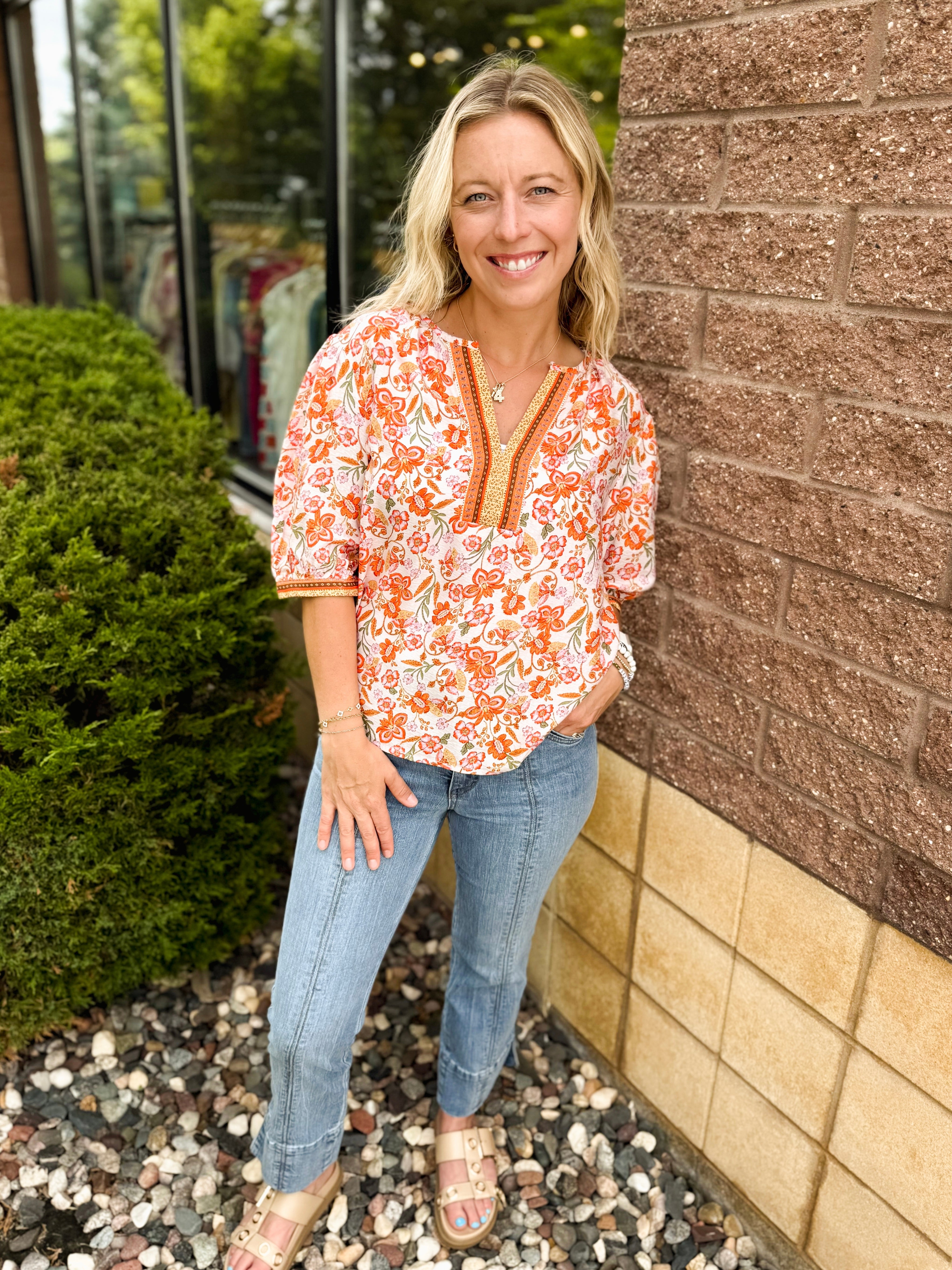 ELBOW BLOUSON SLEEVE NOTCH NECK PLACEMENT PRINT WOVEN TOP