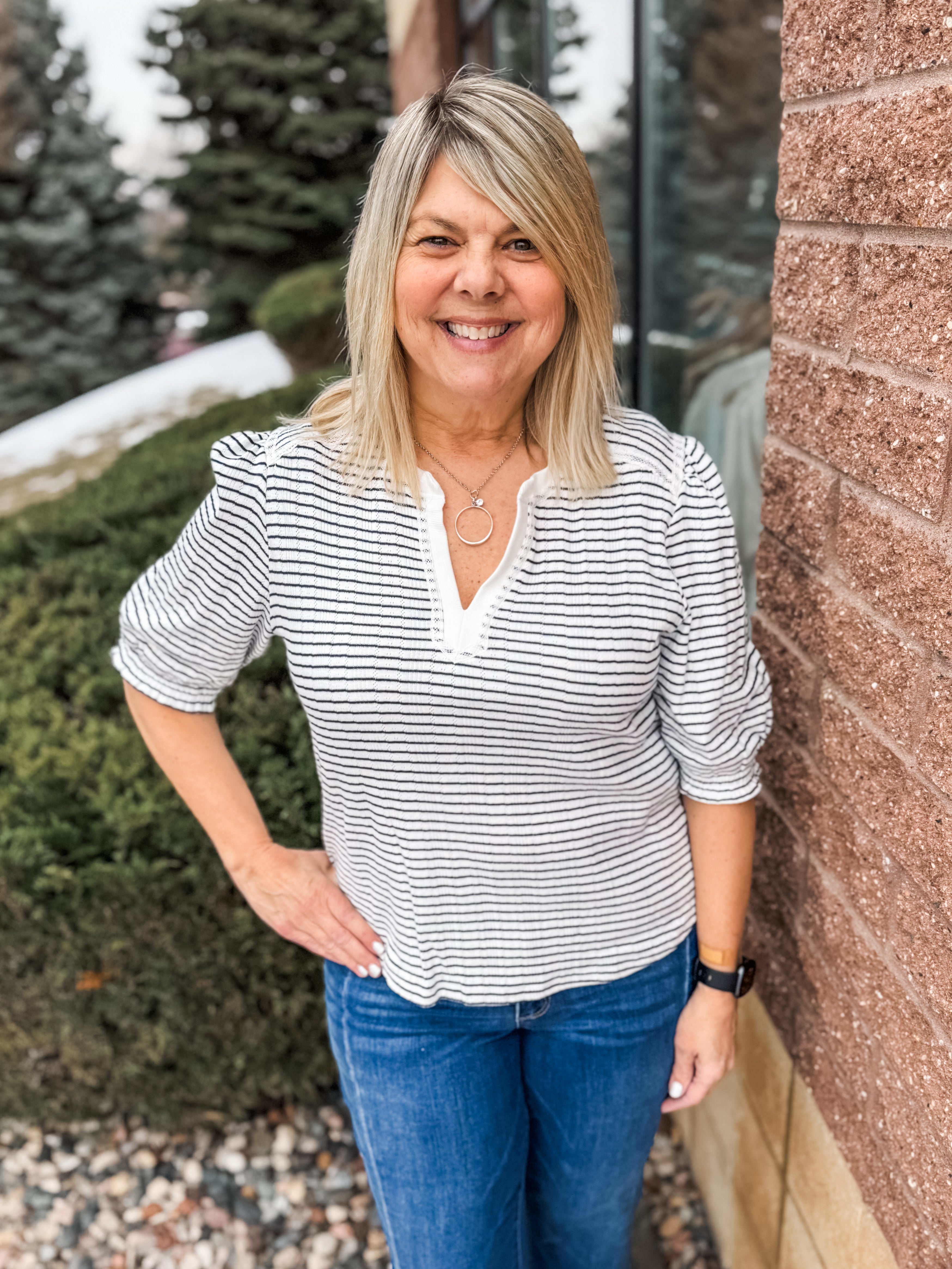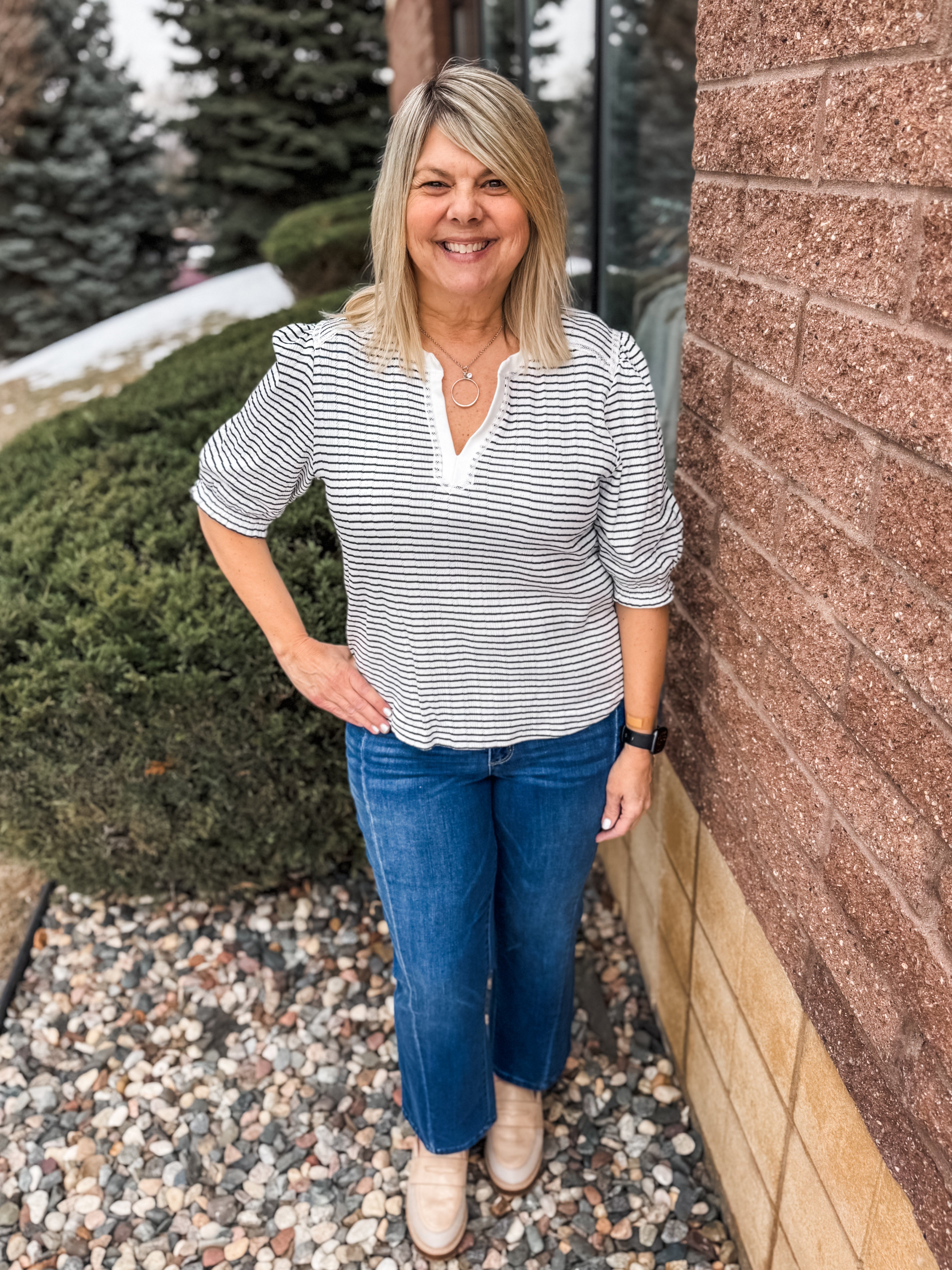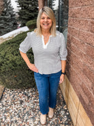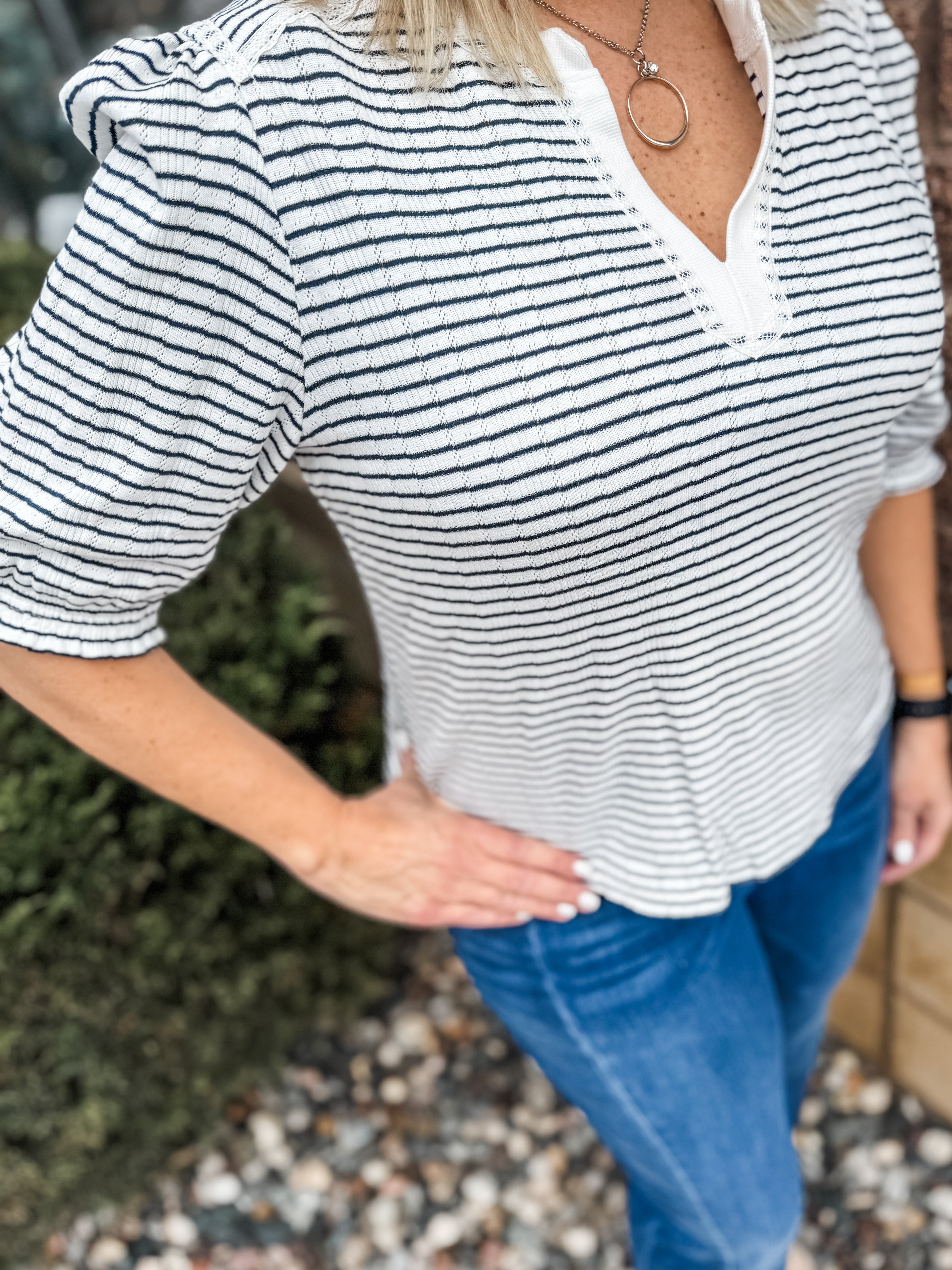 Elbow Puff Mandarin Collar Placket Knit Top