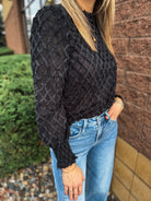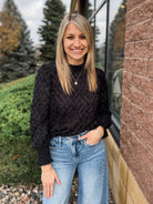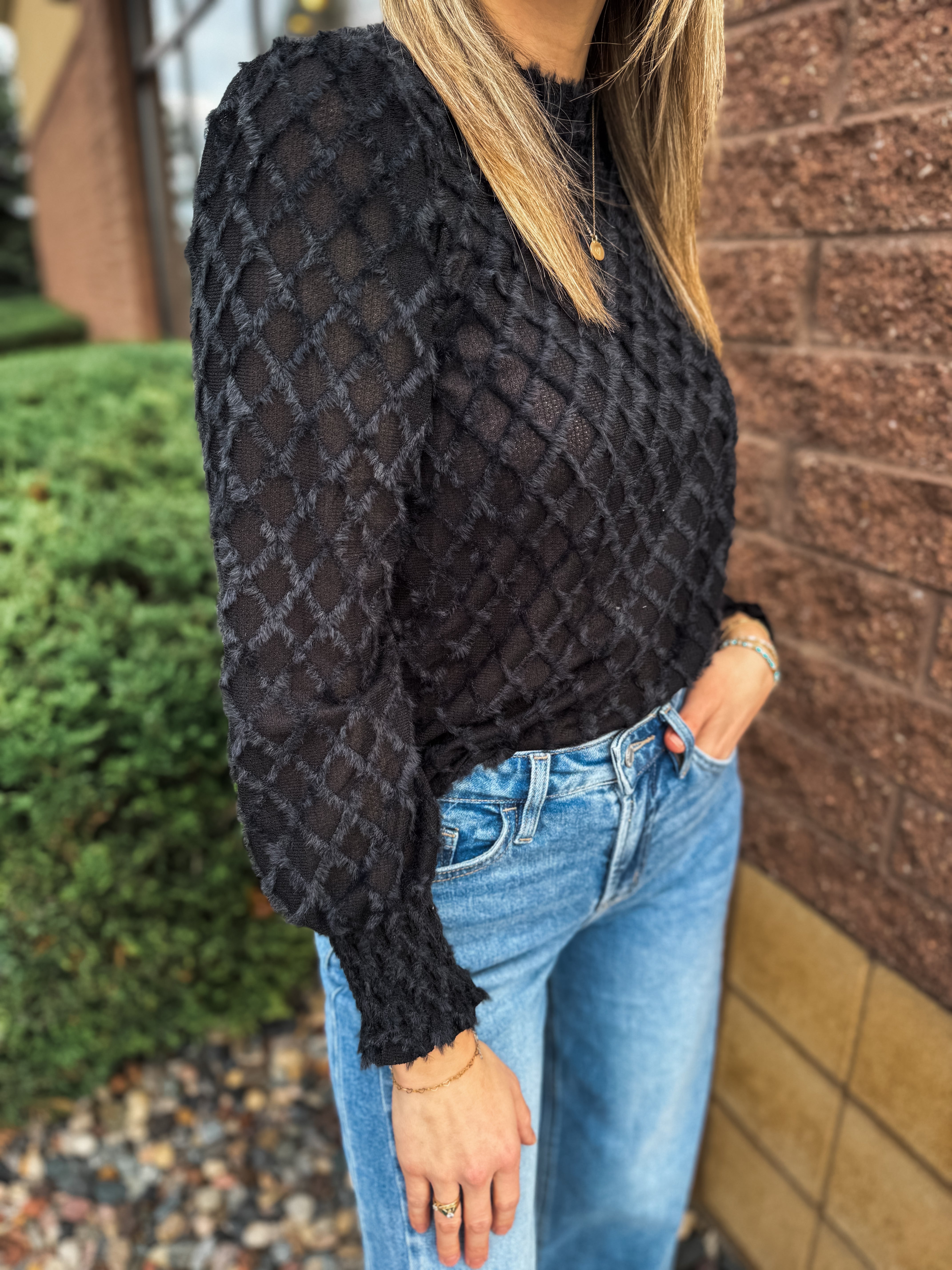 Fuzzy Grid Mock Neck Keyhole Button Back Top