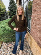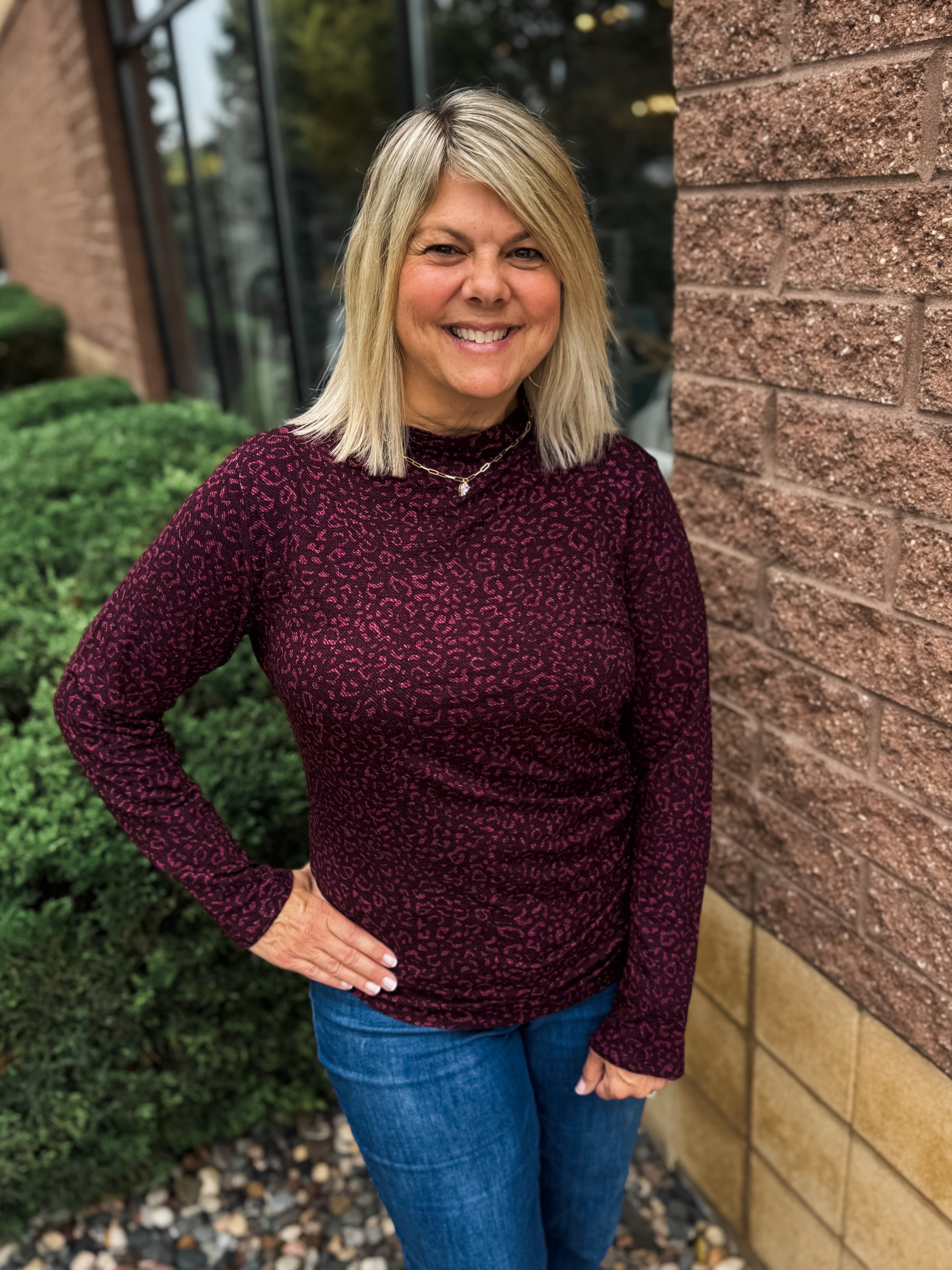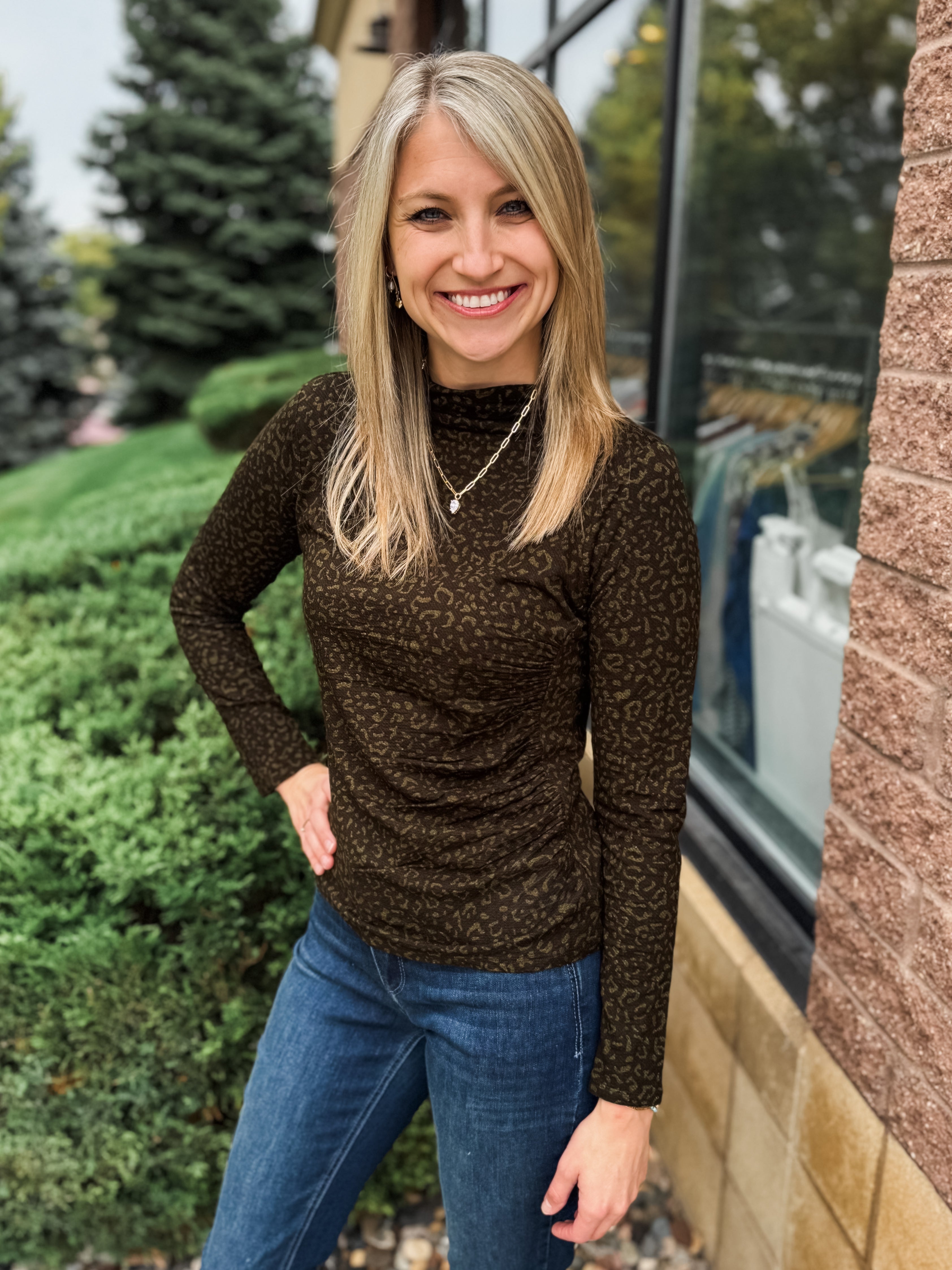 LONG SLEEVE MOCK NECK ASYMMETRICAL SIDE RUCHING PRINTED KNIT TOP