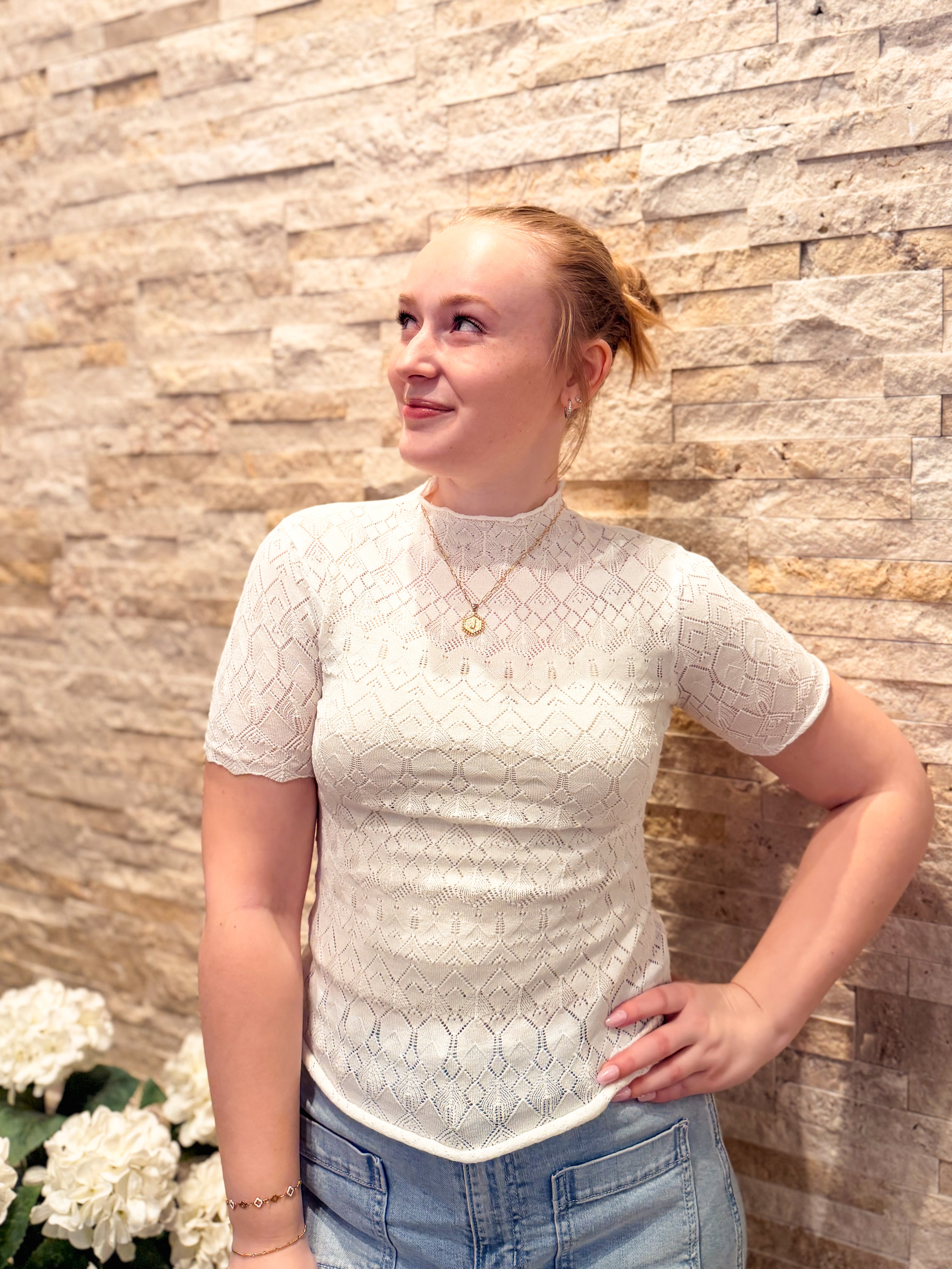 Mock Neck Short Sleeve Pointelle Knit Sweater