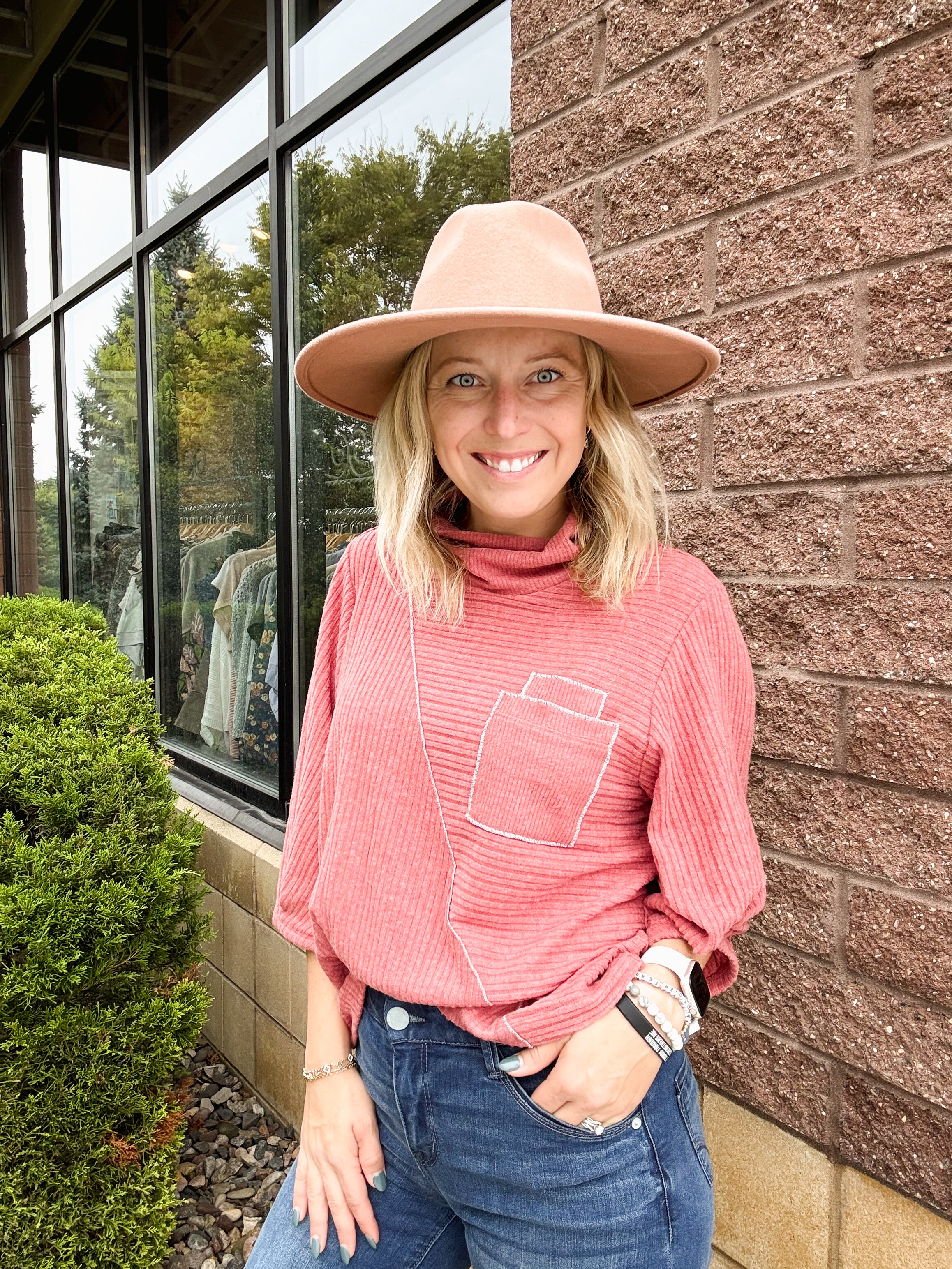PLEATED ELBOW SLEEVE MOCK NECK KNIT TOP WITH LUREX SEAMING AND POCKET