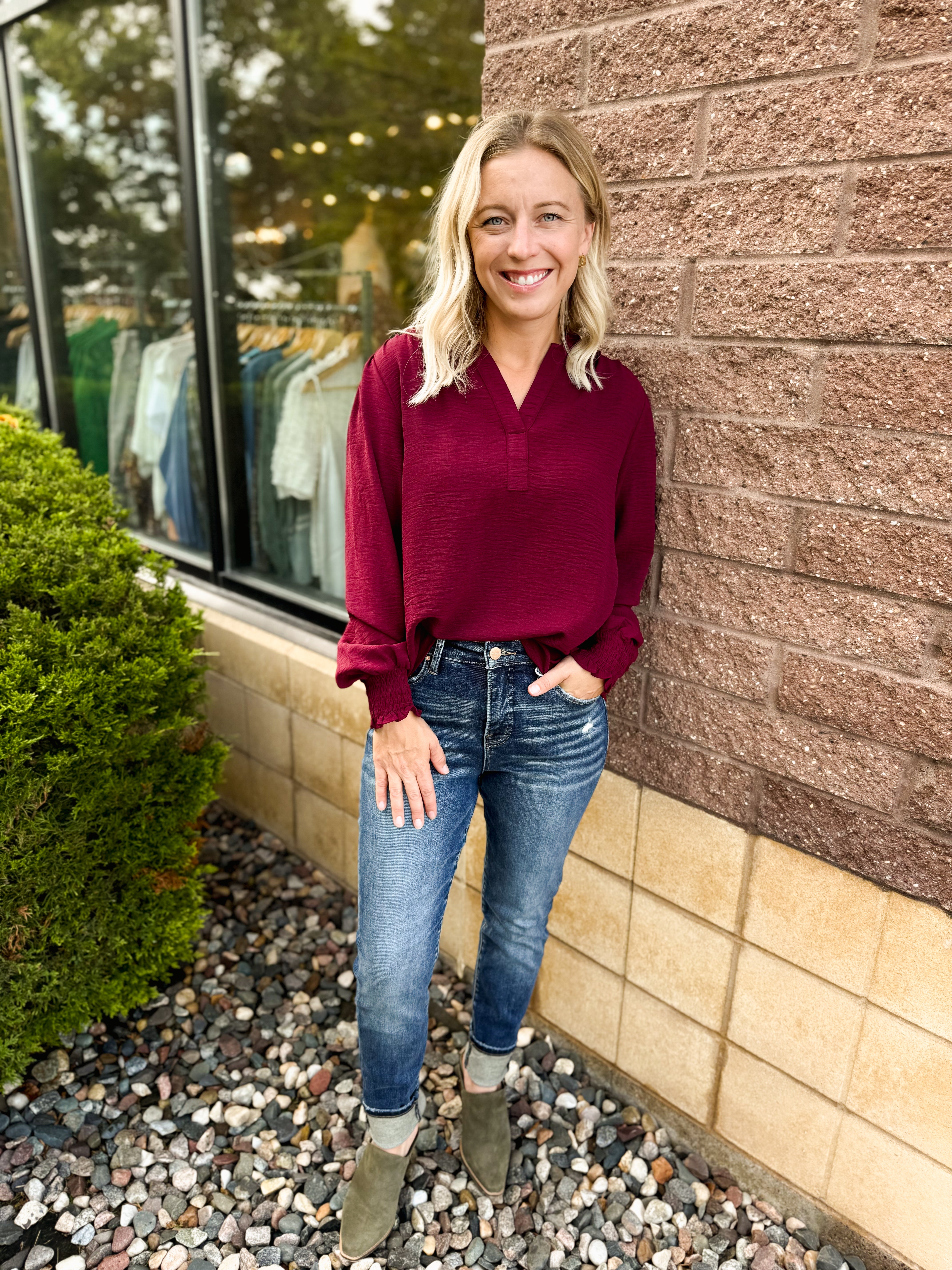 V Neck Long Sleeve Smocked Cuff Solid Blouse