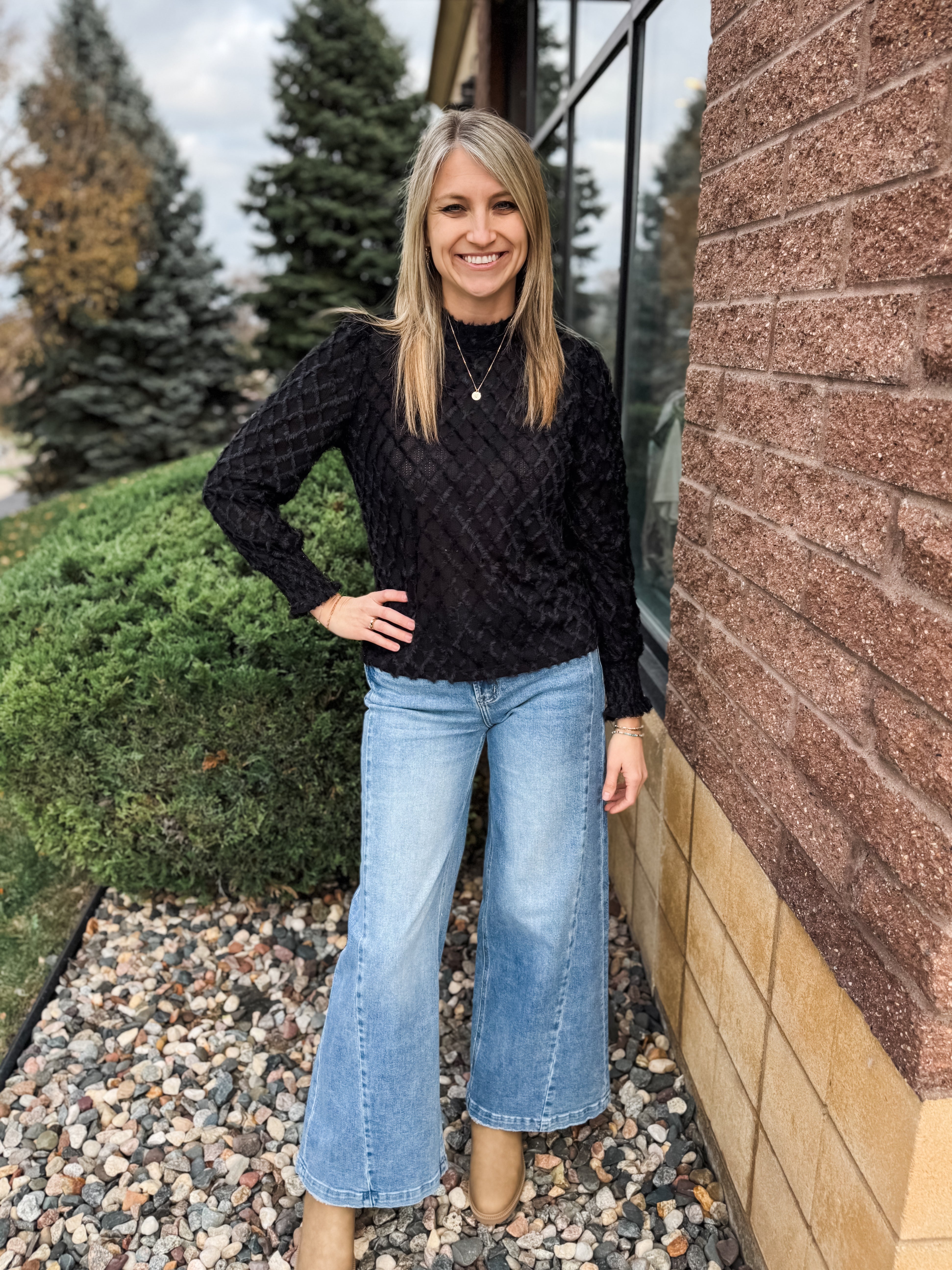 Fuzzy Grid Mock Neck Keyhole Button Back Top