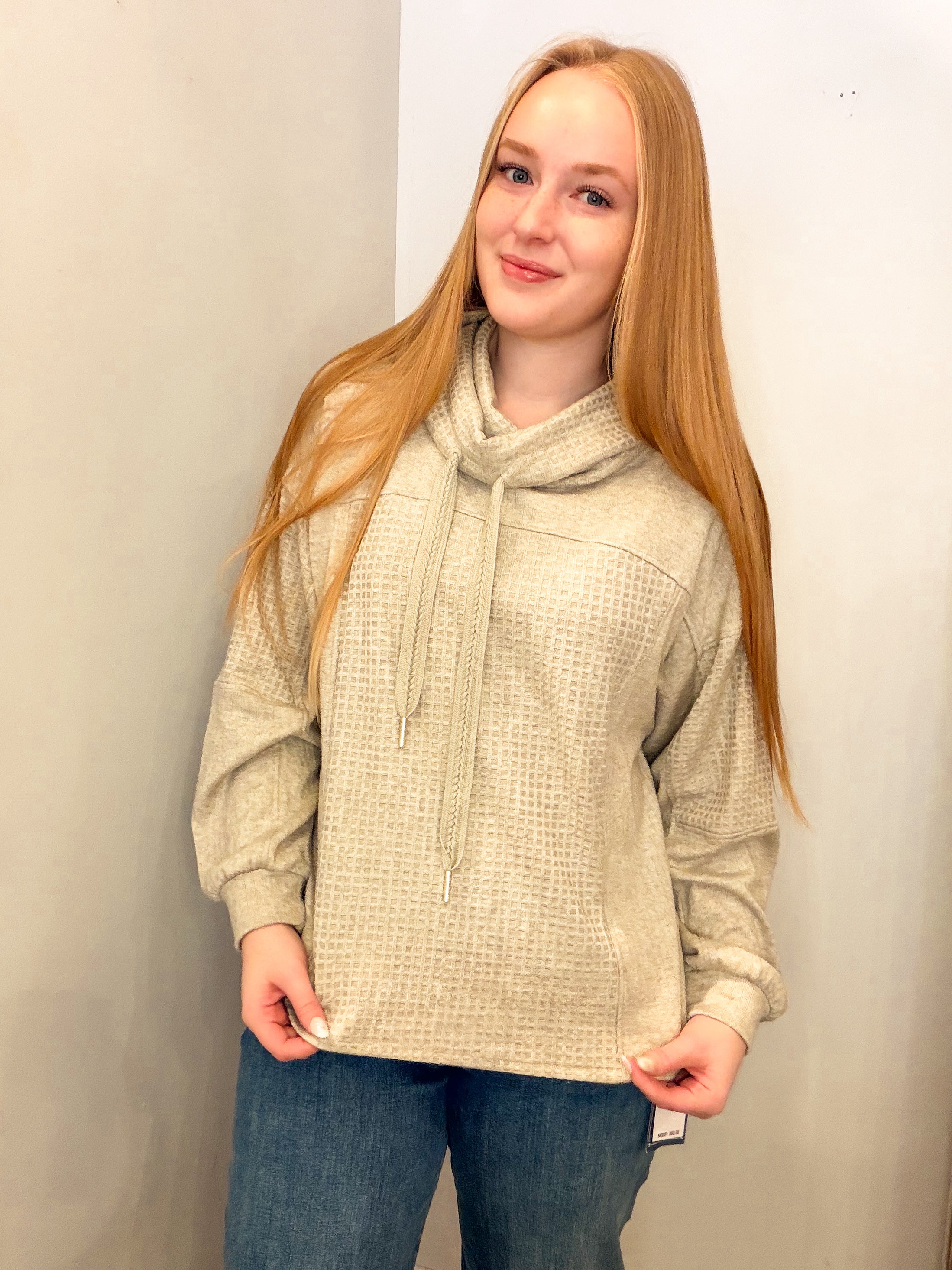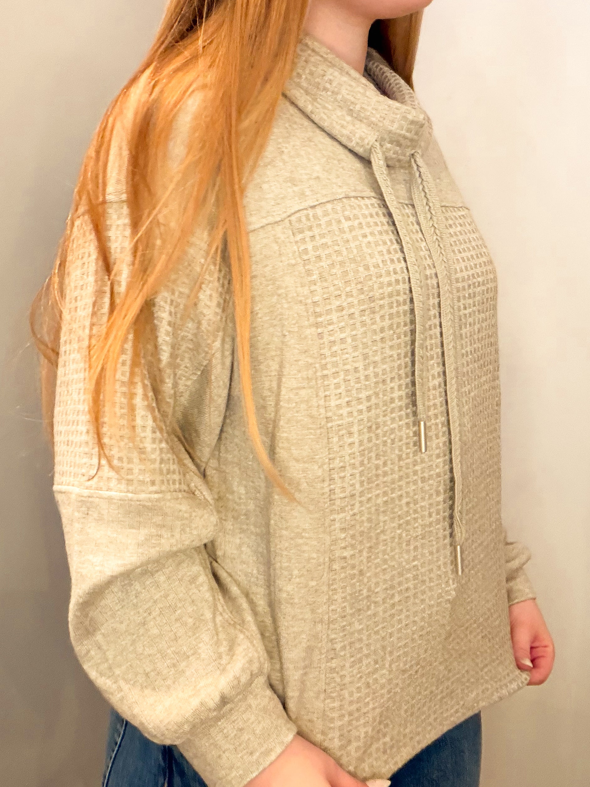 LONG BLOUSE SLEEVE COWL NECK WITH TIES MIX MEDIA KNIT TOP