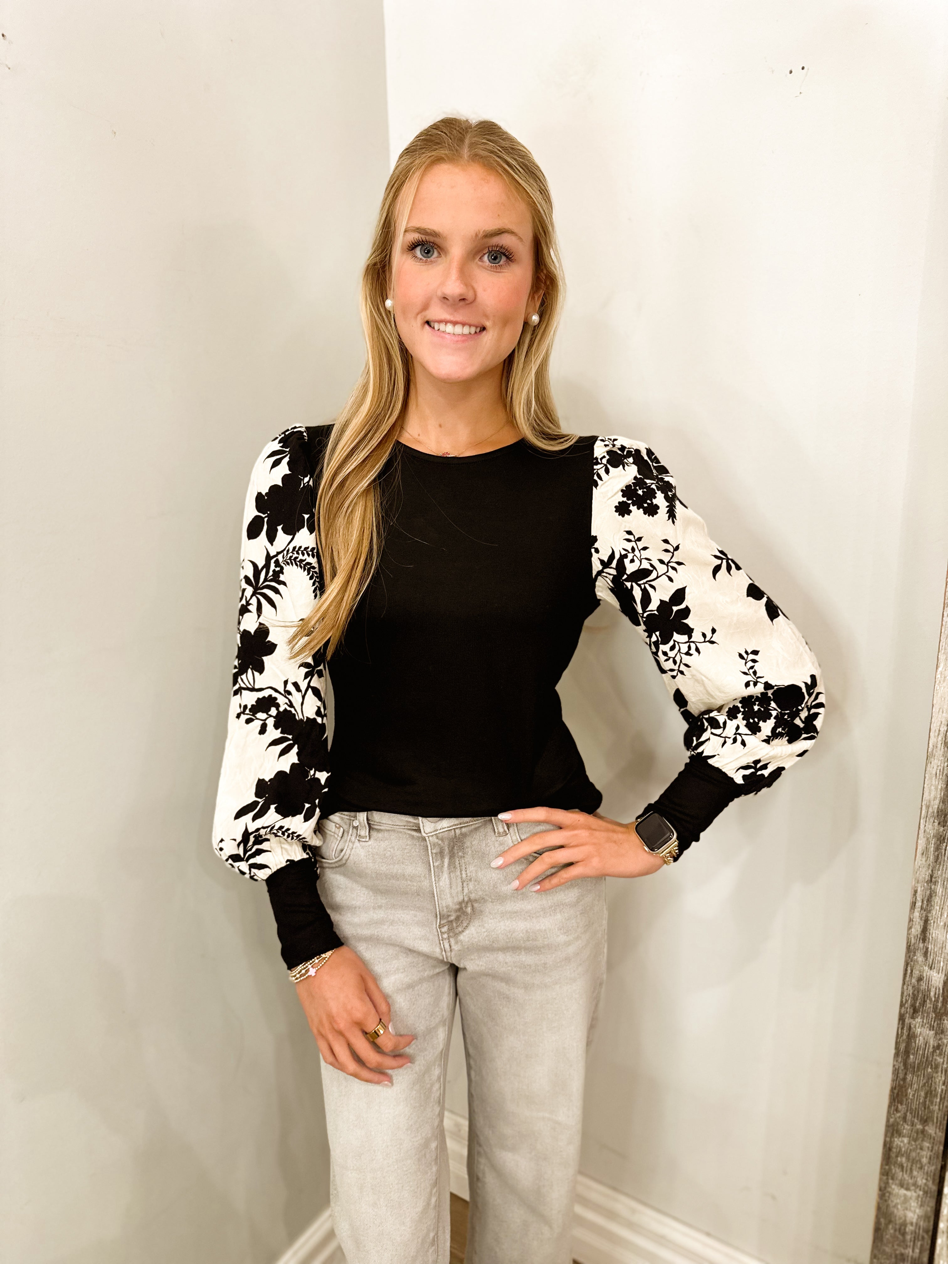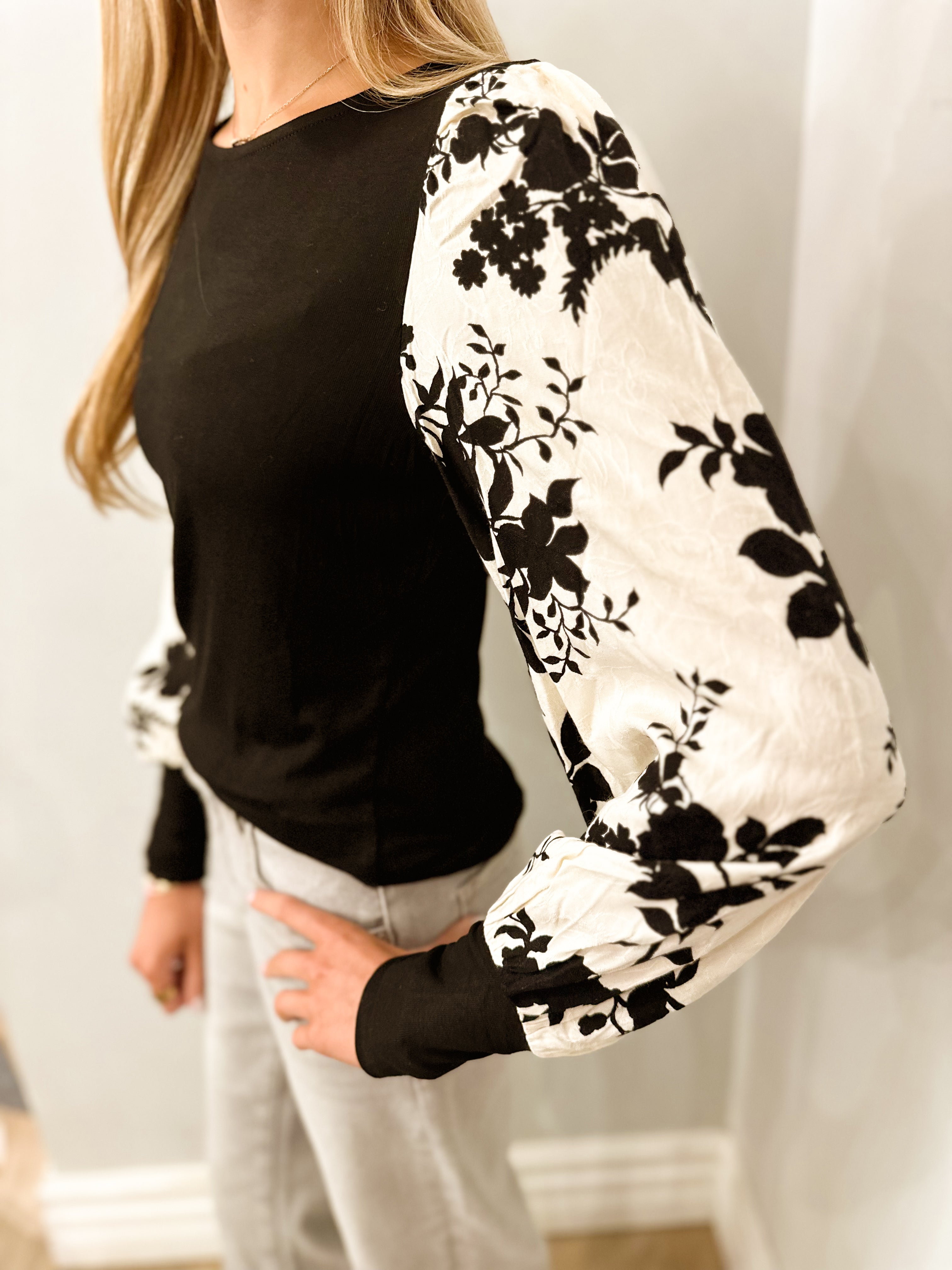 Floral Jacquard Contrast Sleeve Knit Top