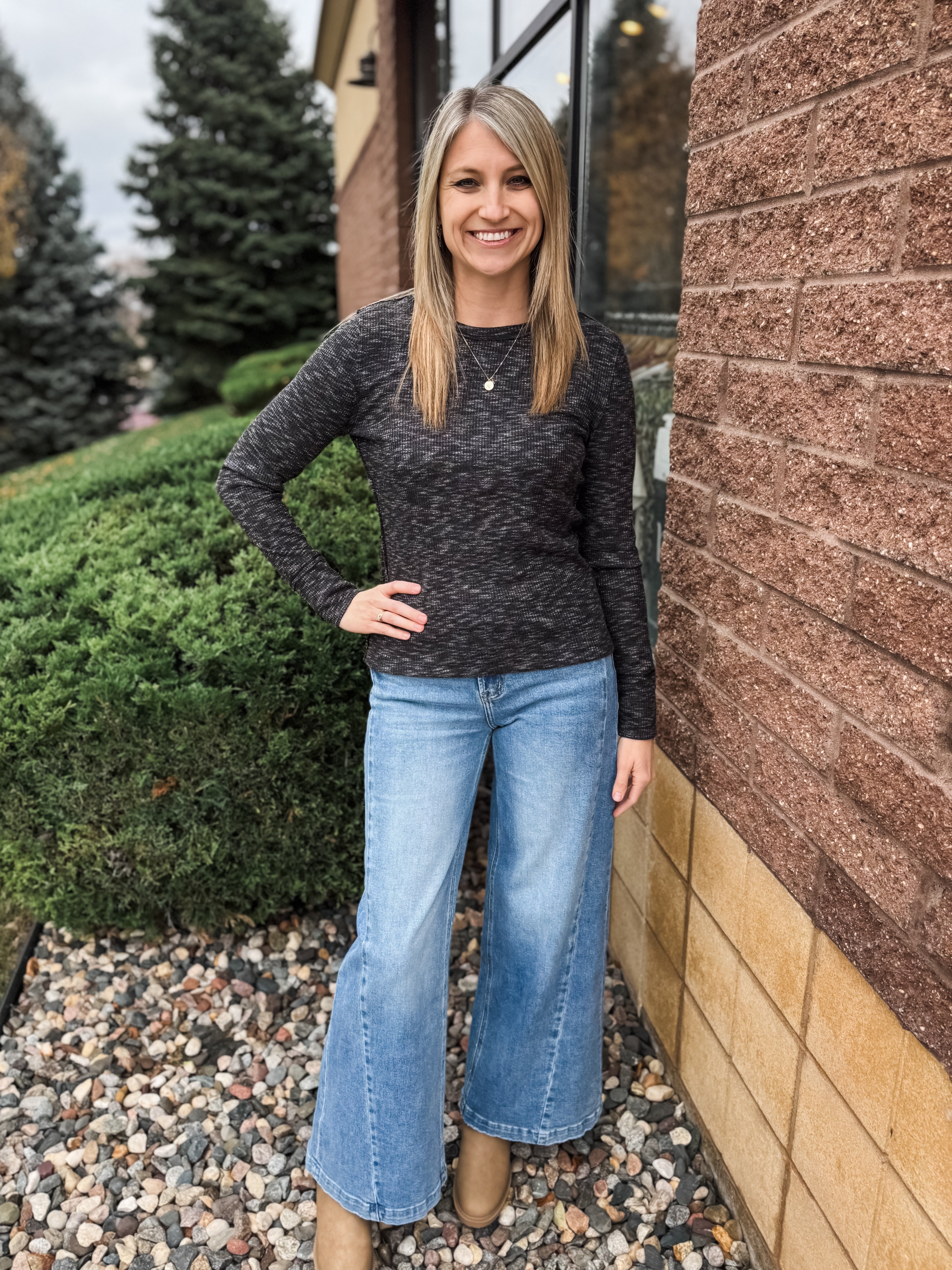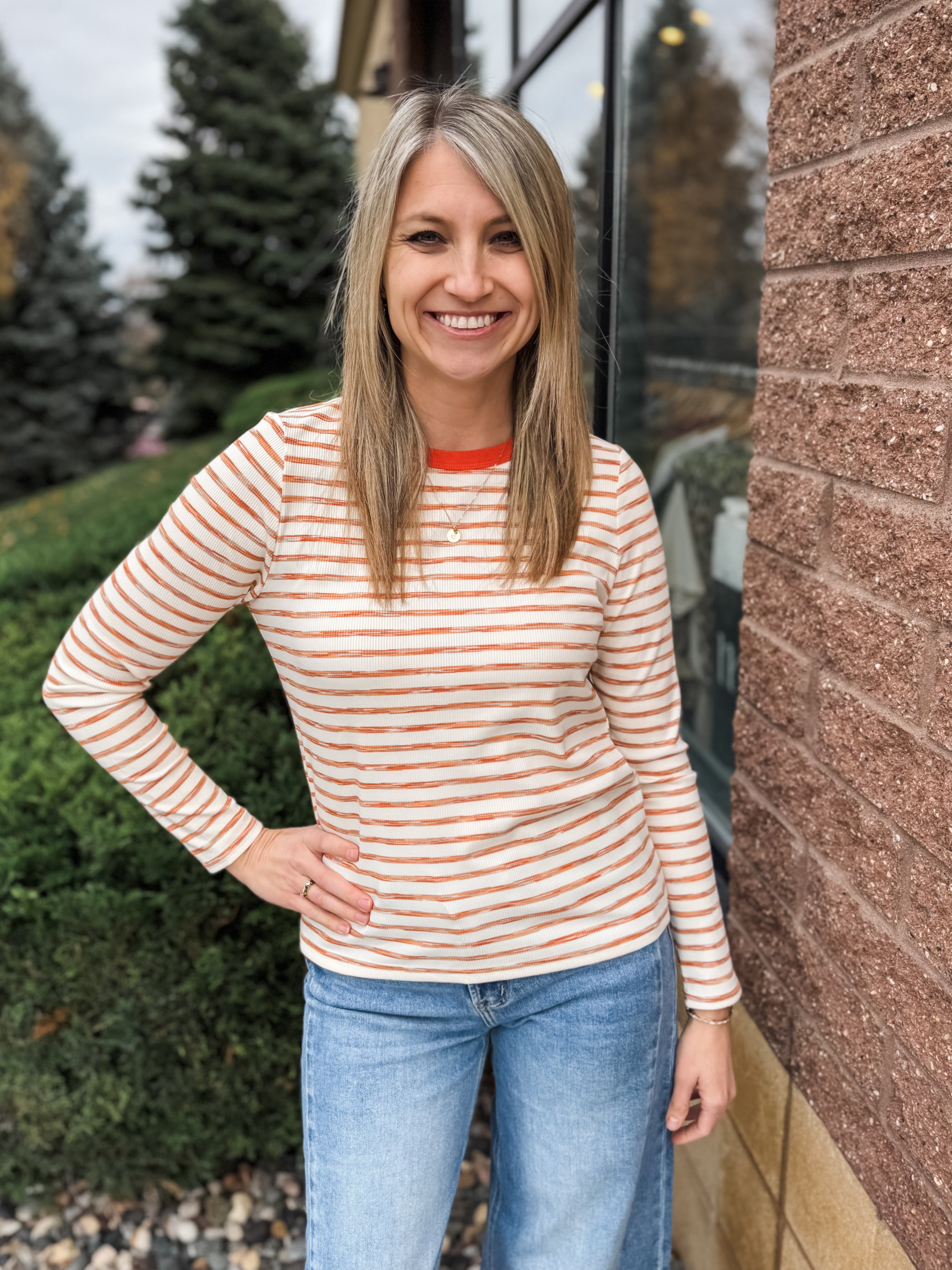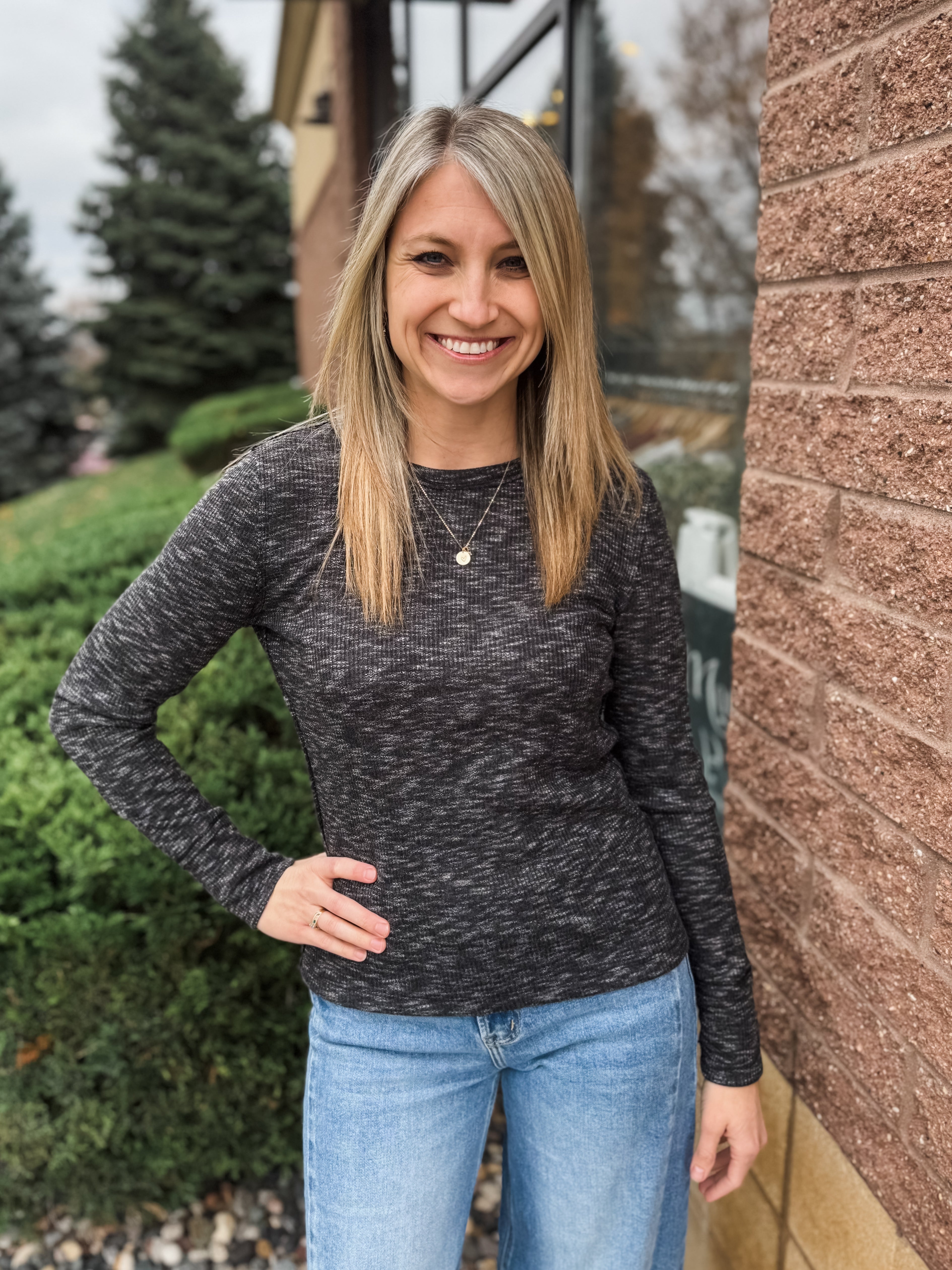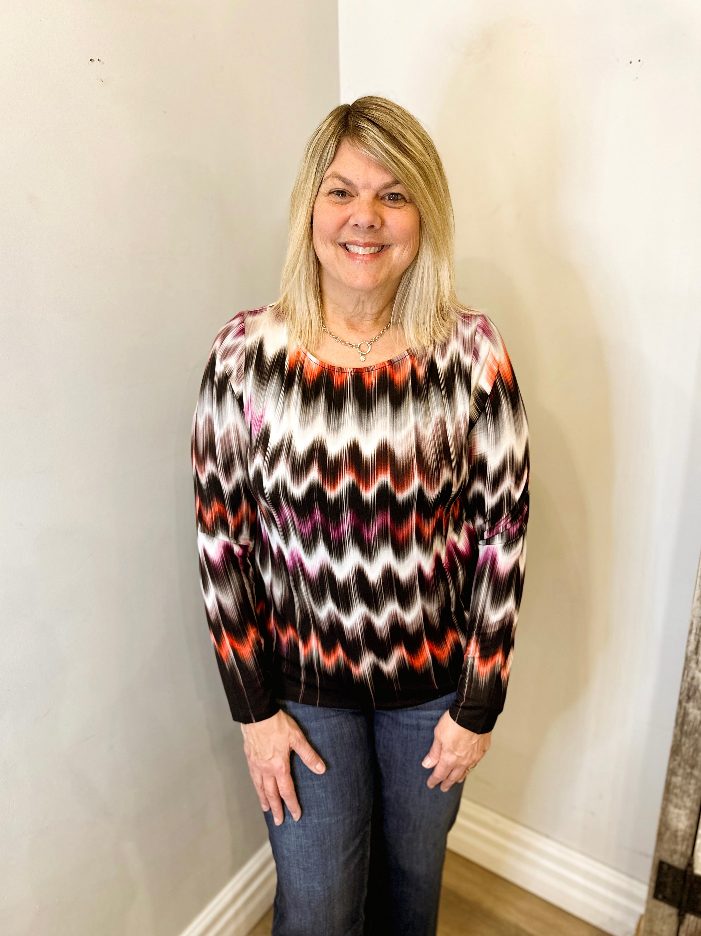 Contrast Color Trimmed Neck Long Sleeve Space Dye Top
