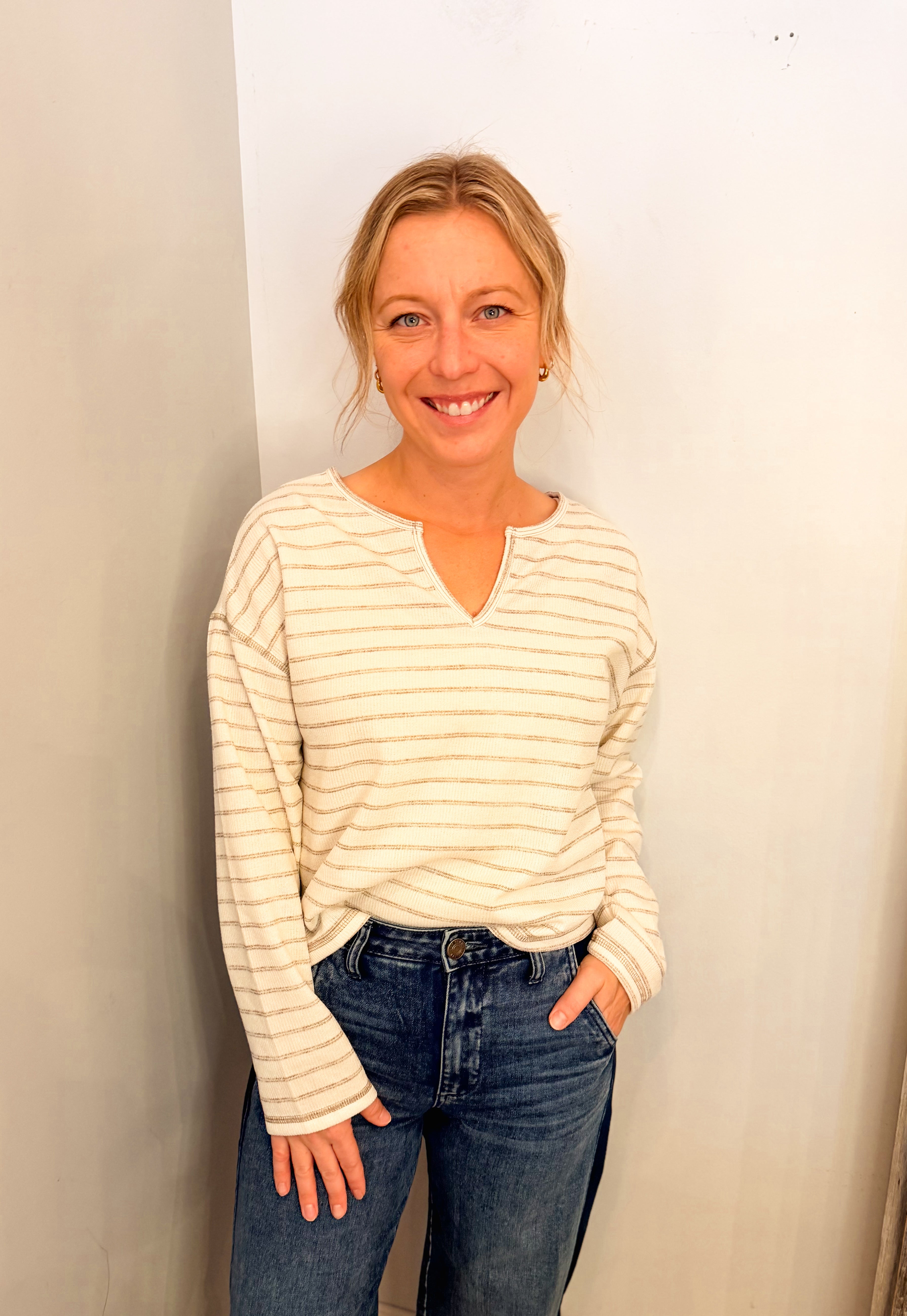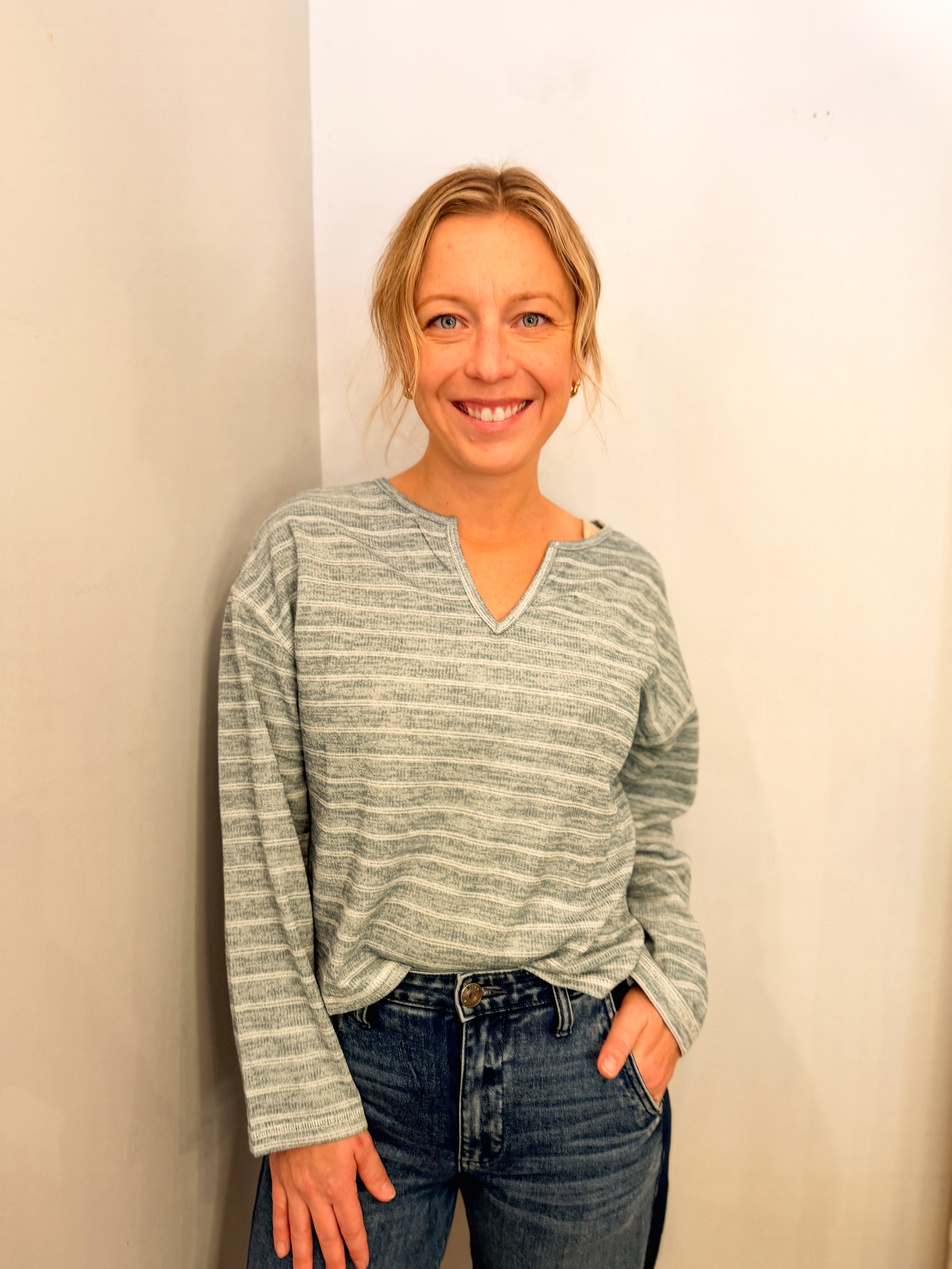 Stripe Split Neck Long Sleeve Marled Knit Top