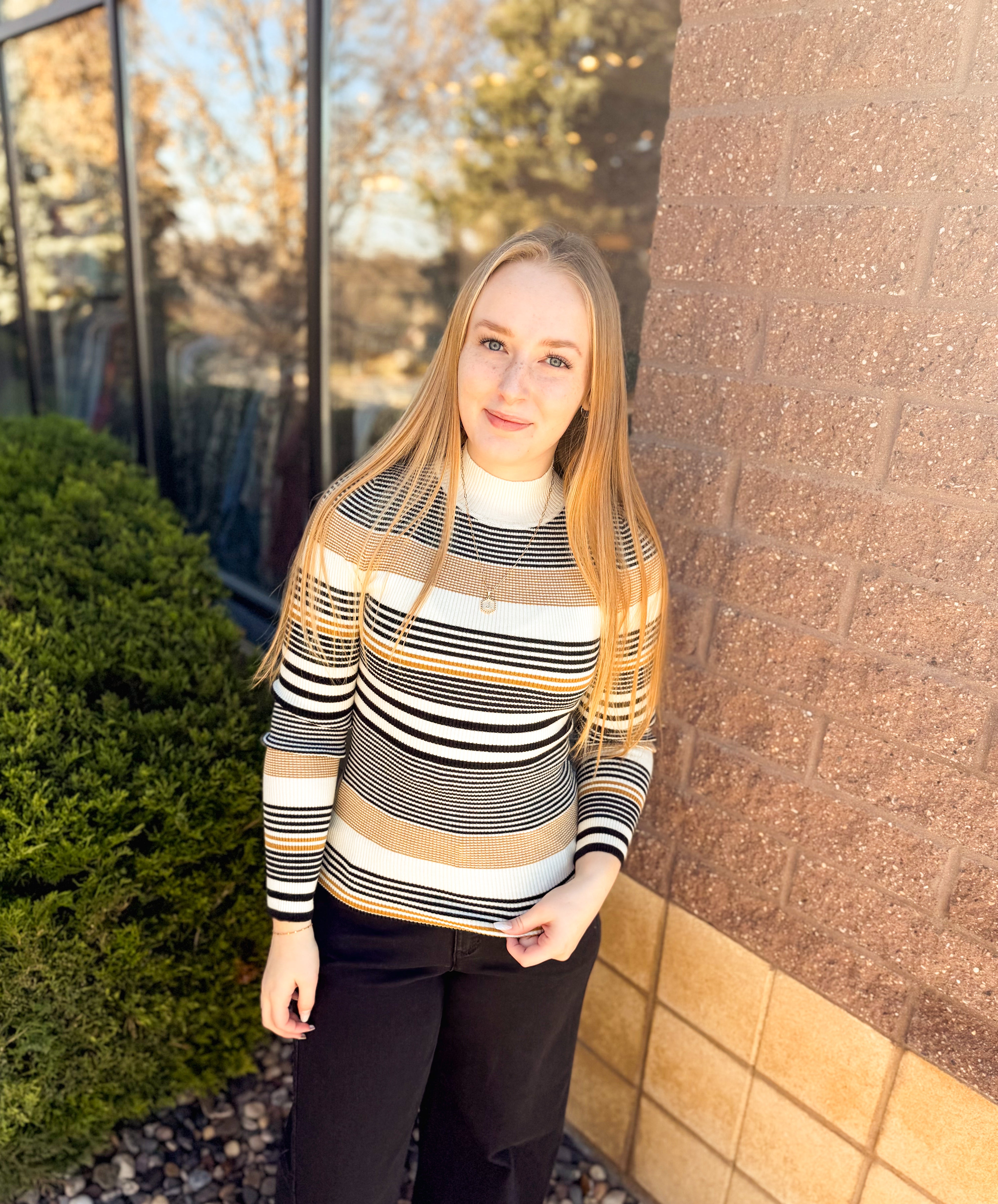 Variegated Stripe Mock Neck Long Sleeve Rib Sweater