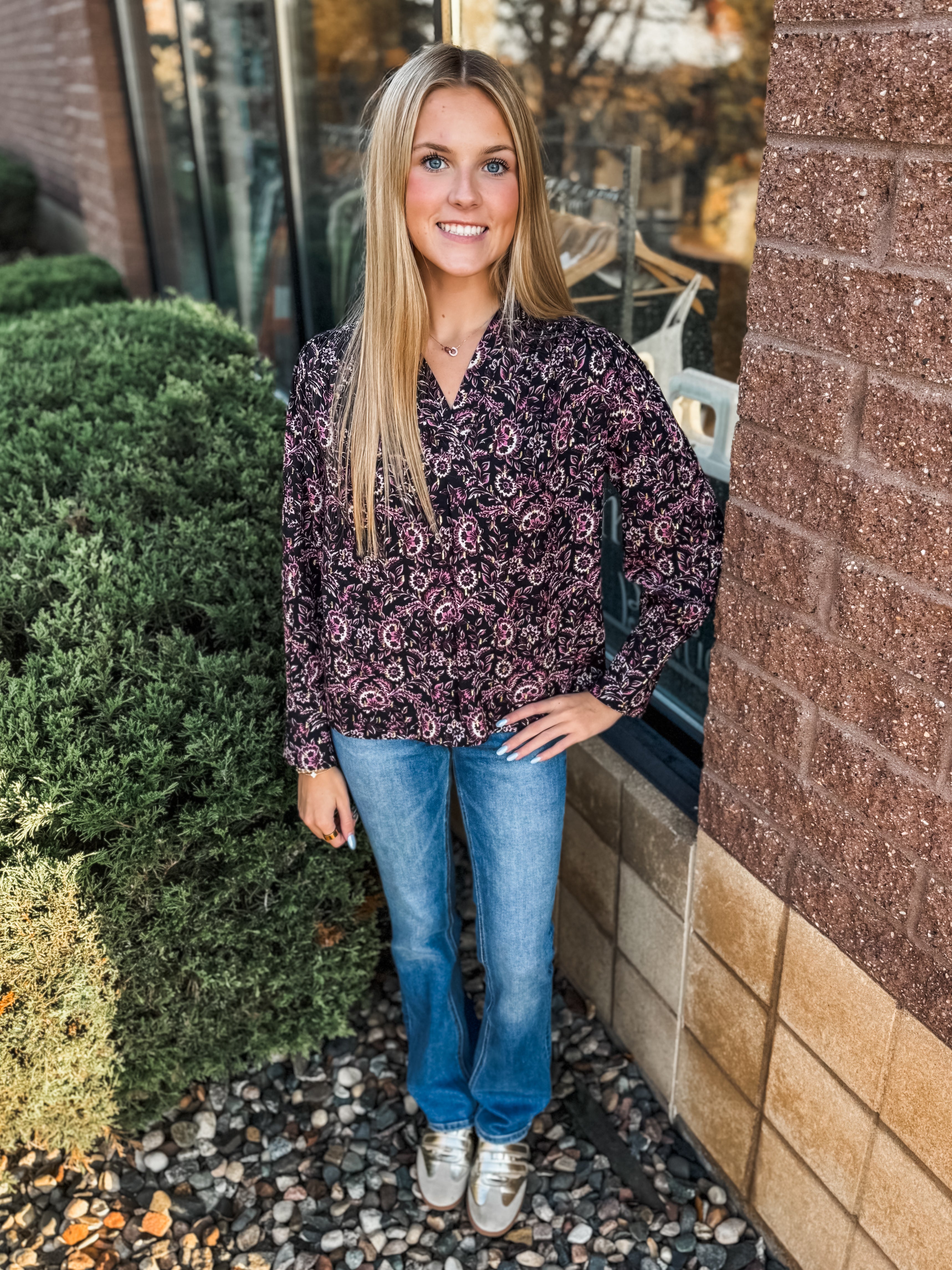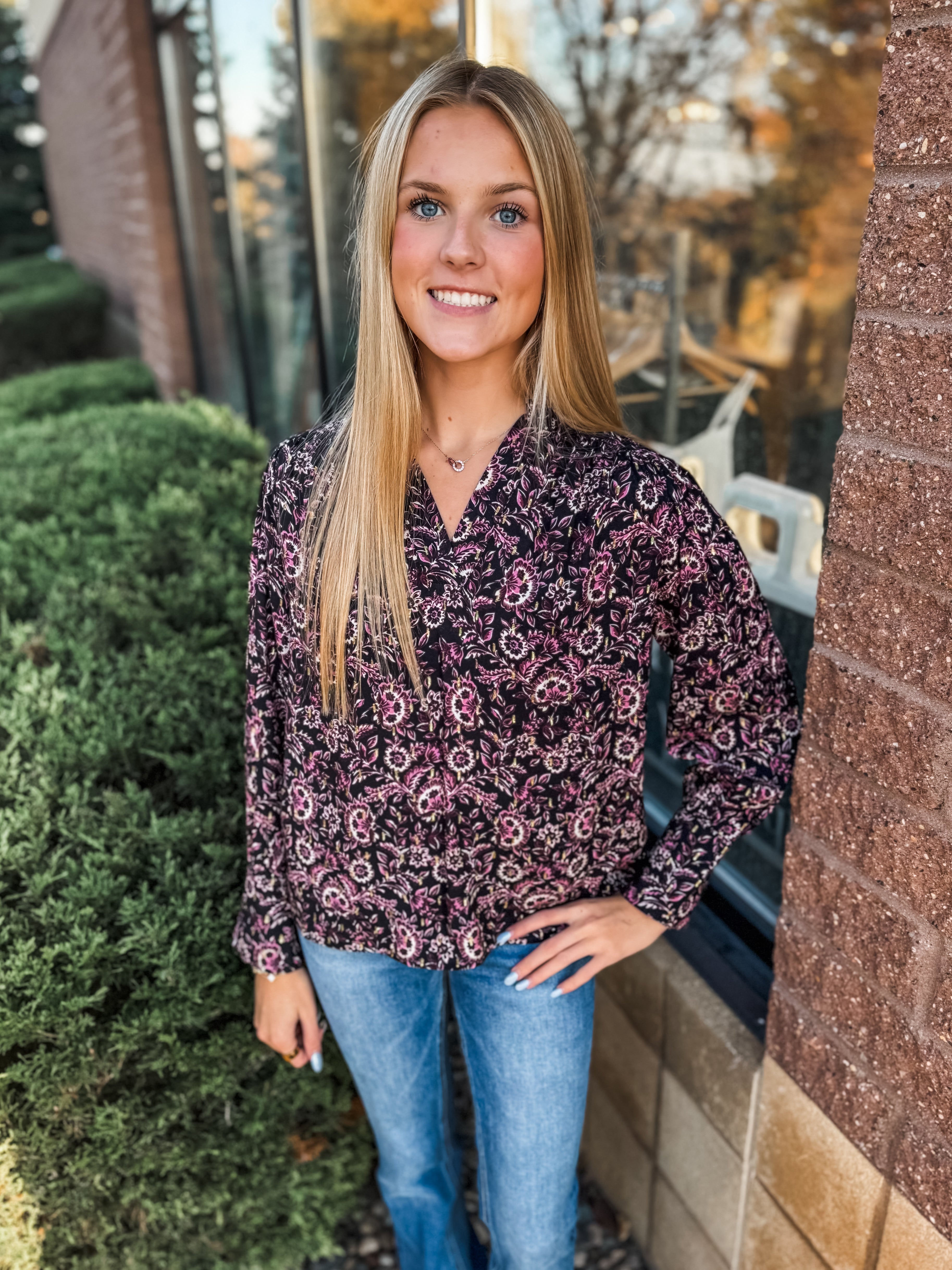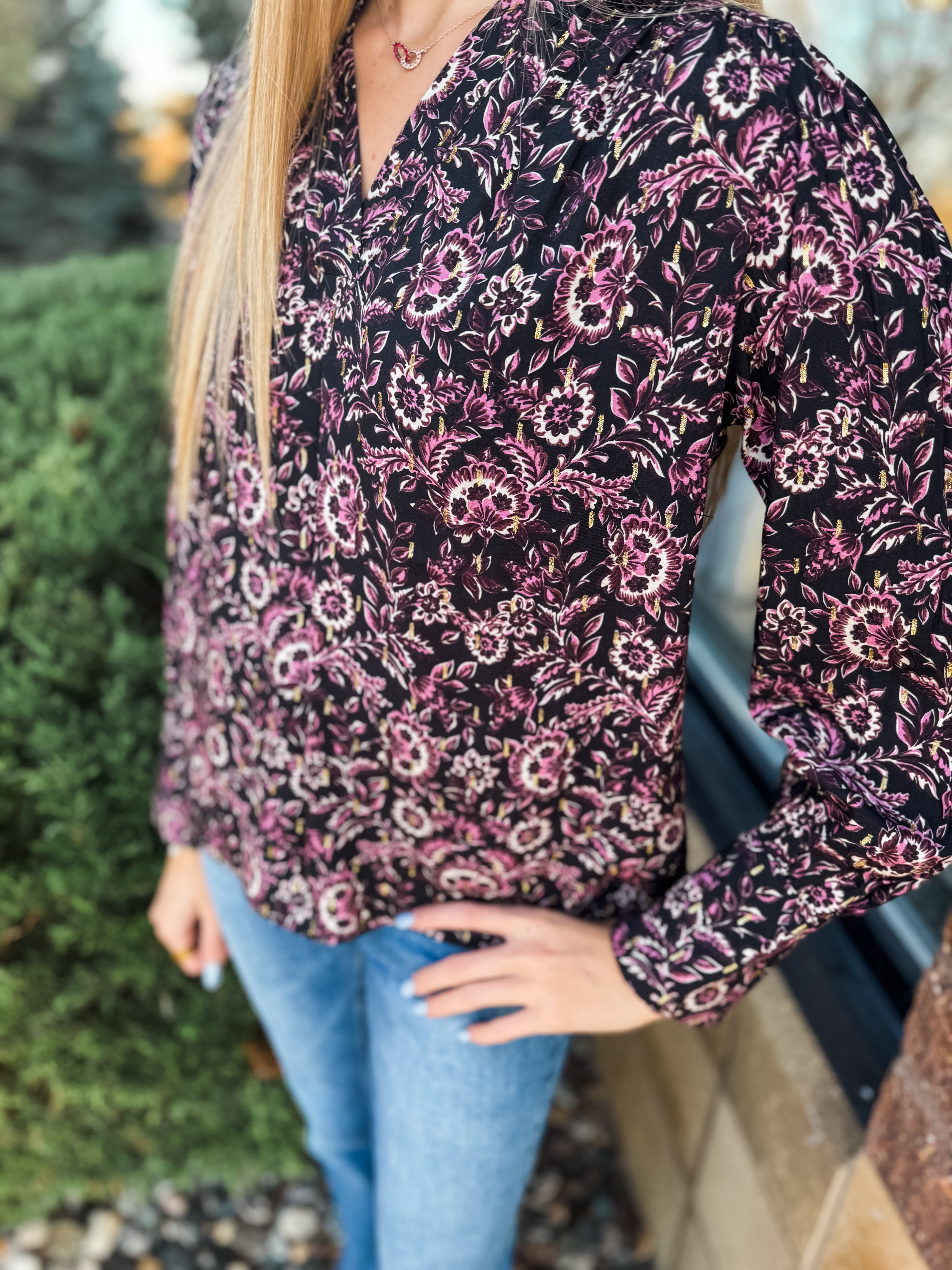 Notched Neck Shoulder Long Sleeve Floral Top