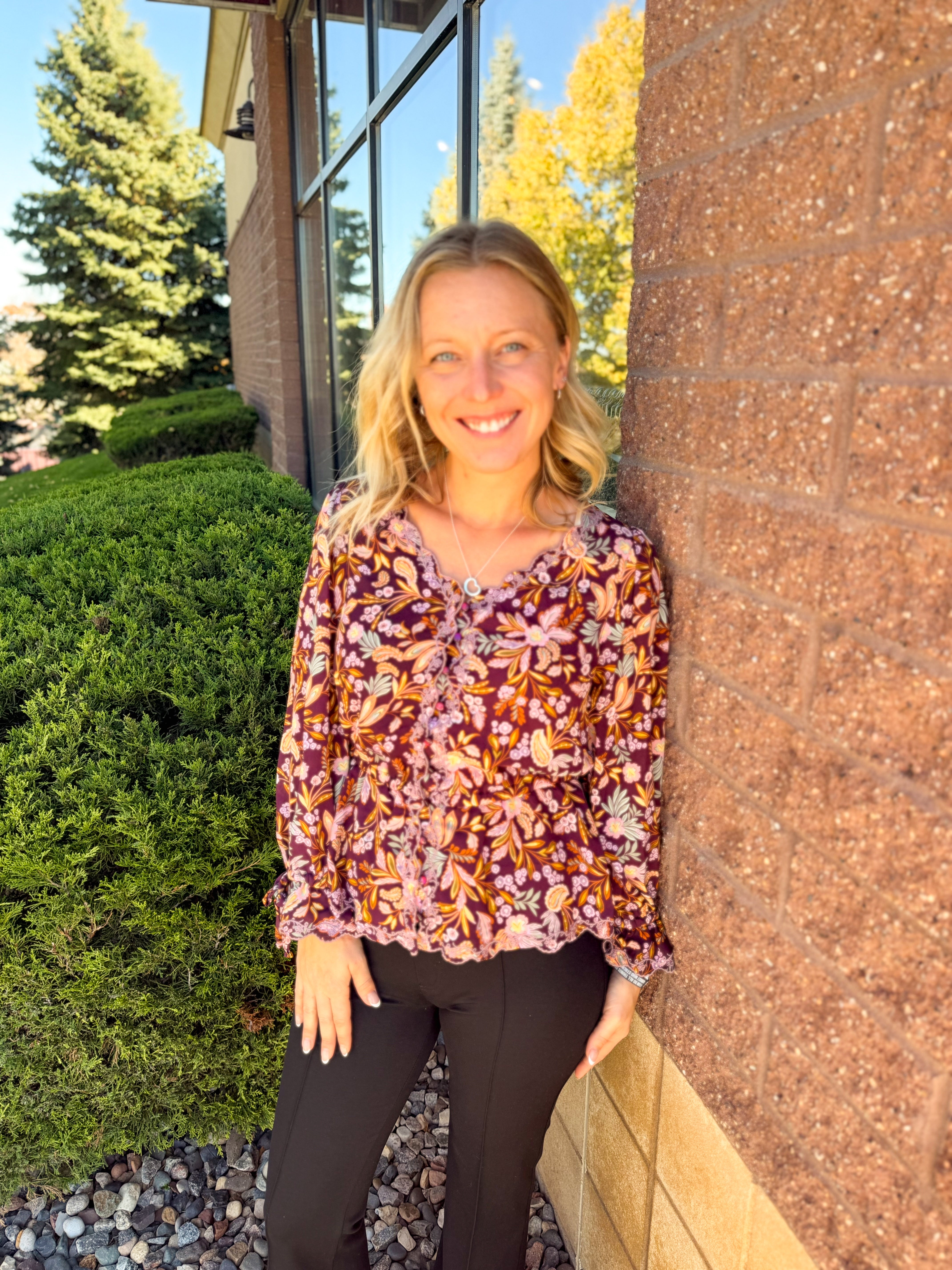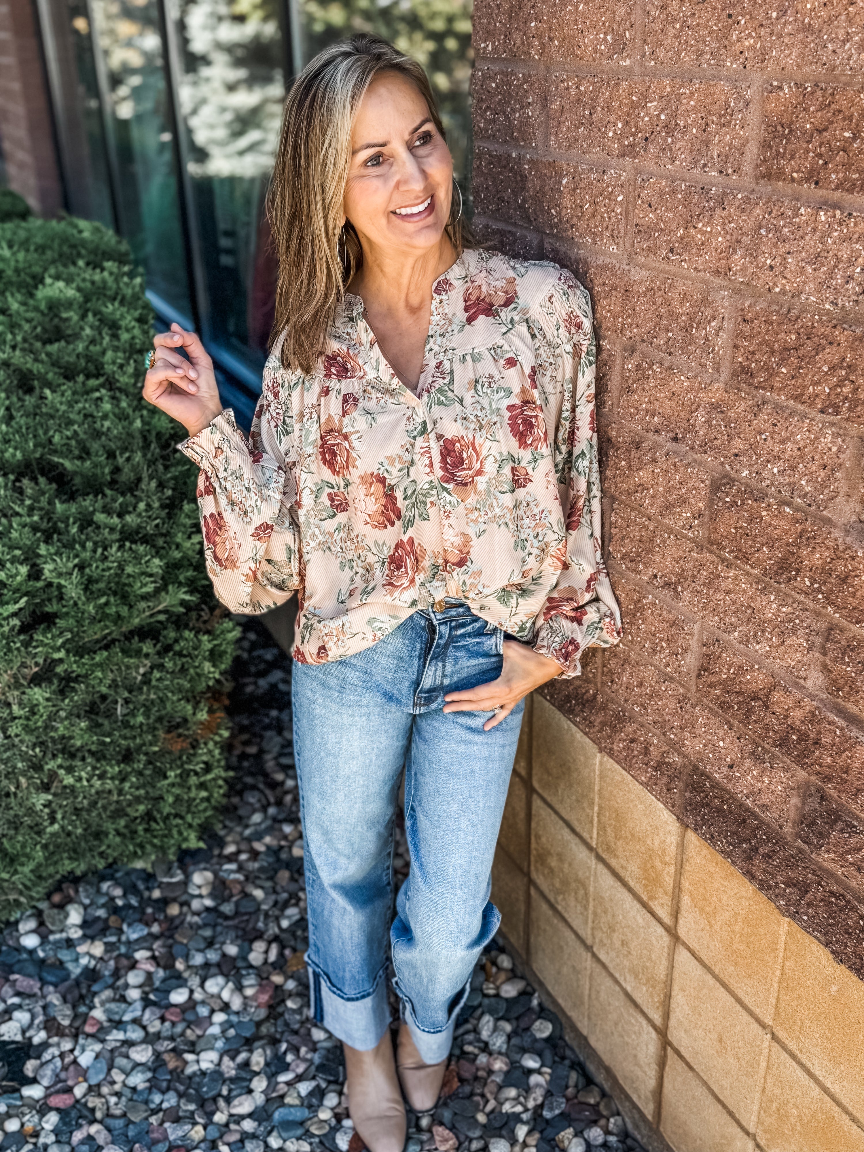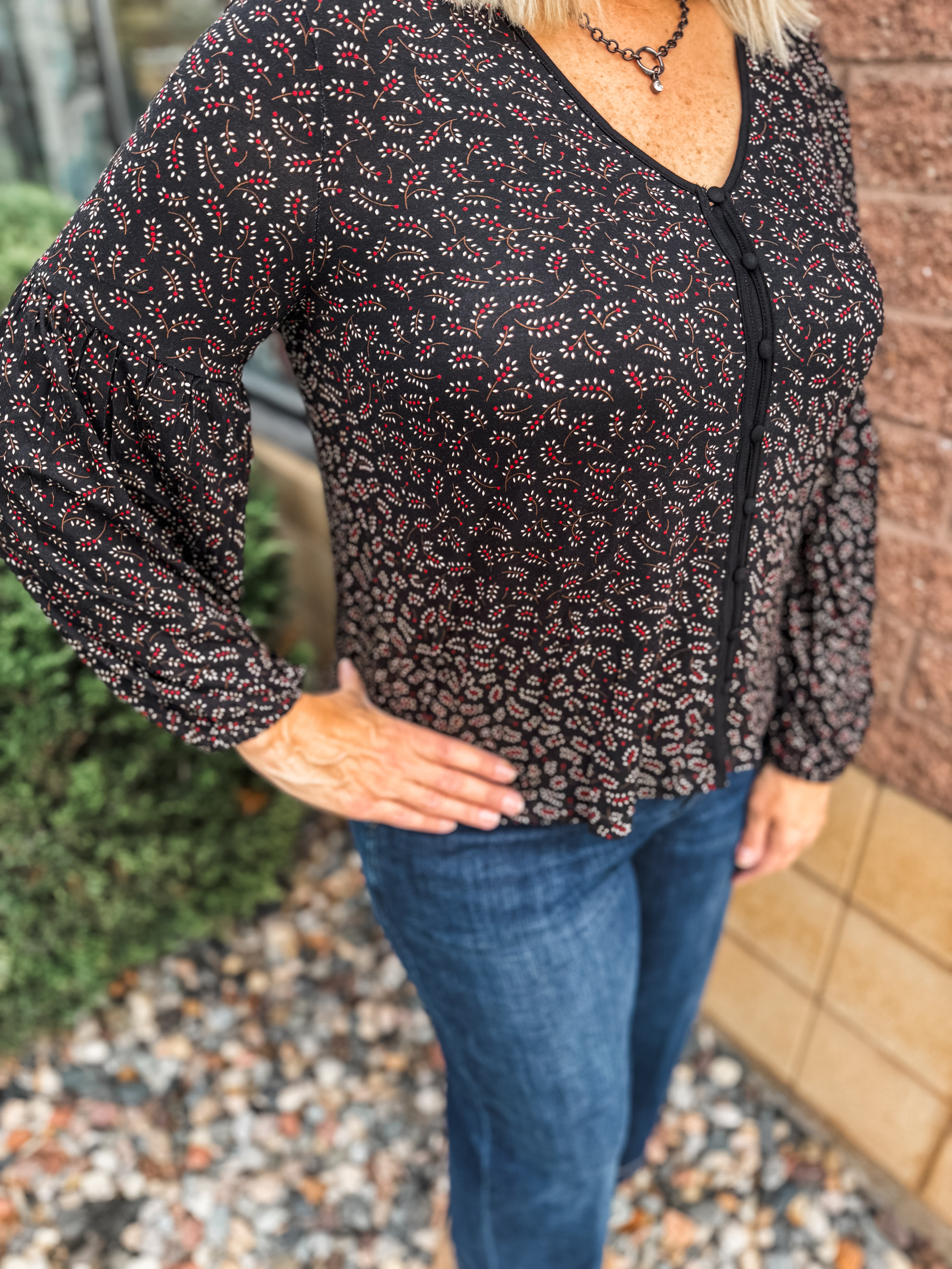 Notched Neck Shoulder Long Sleeve Floral Top