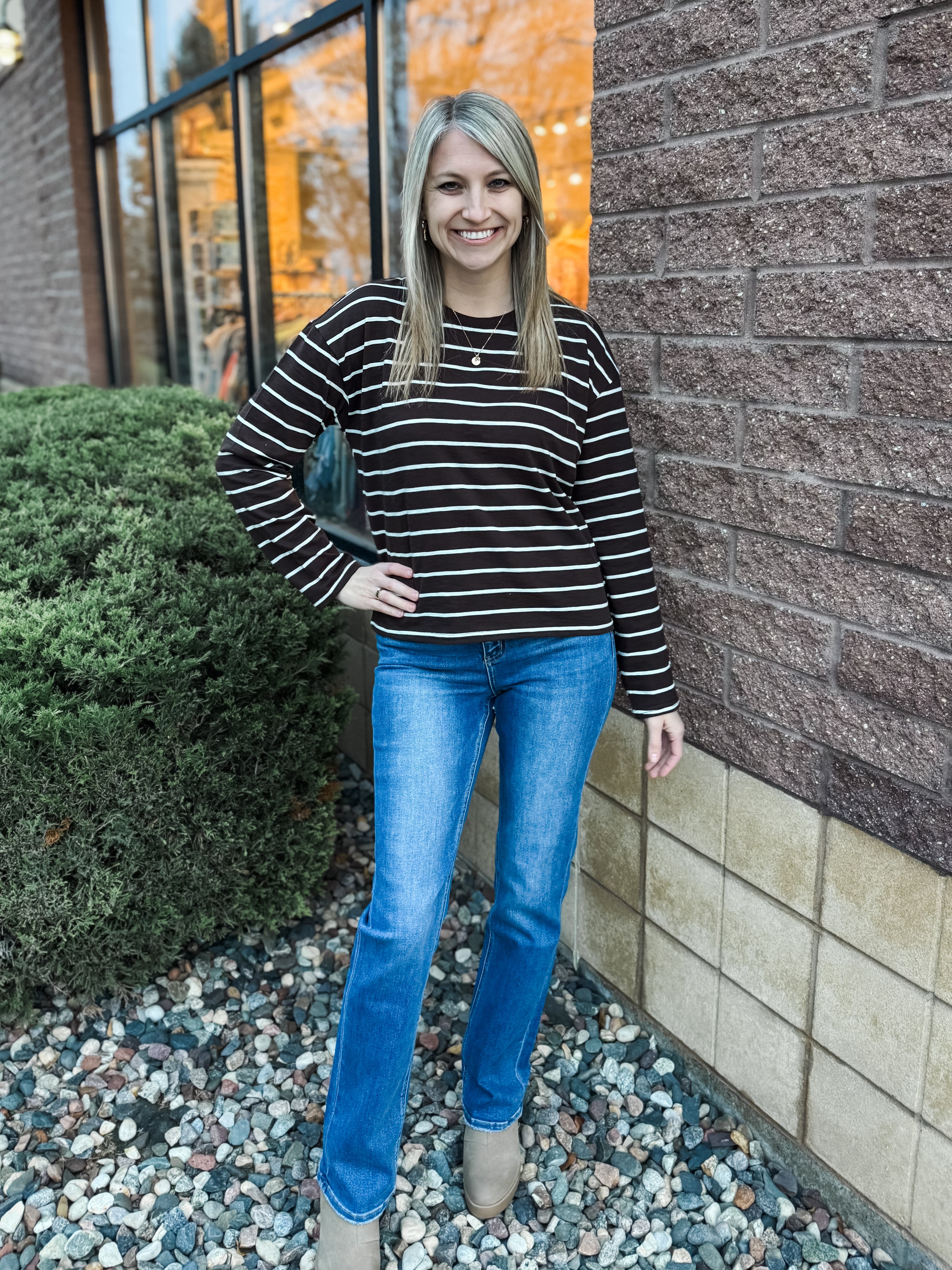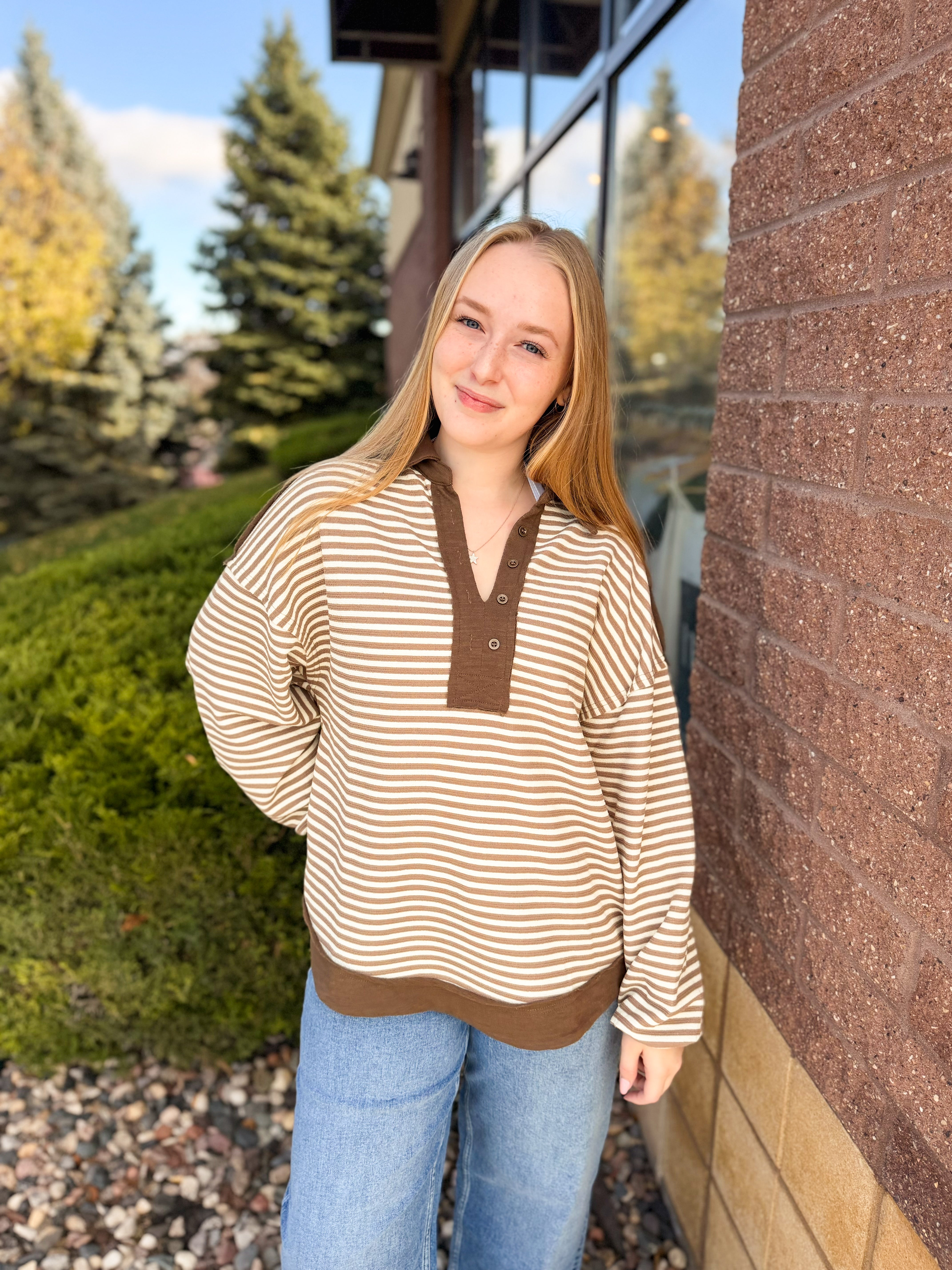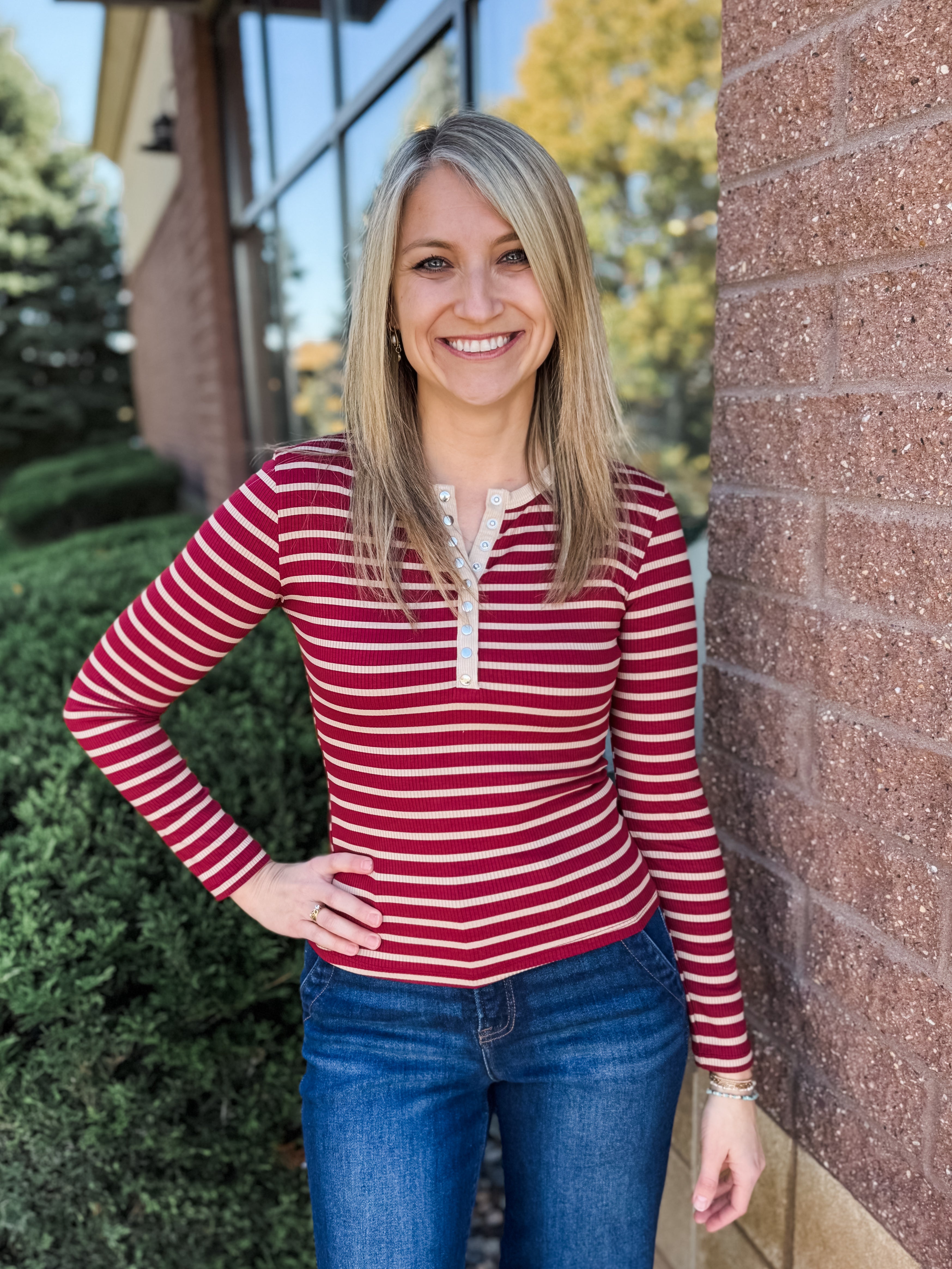 Stripe Henley Snap Button Rib Knit Top