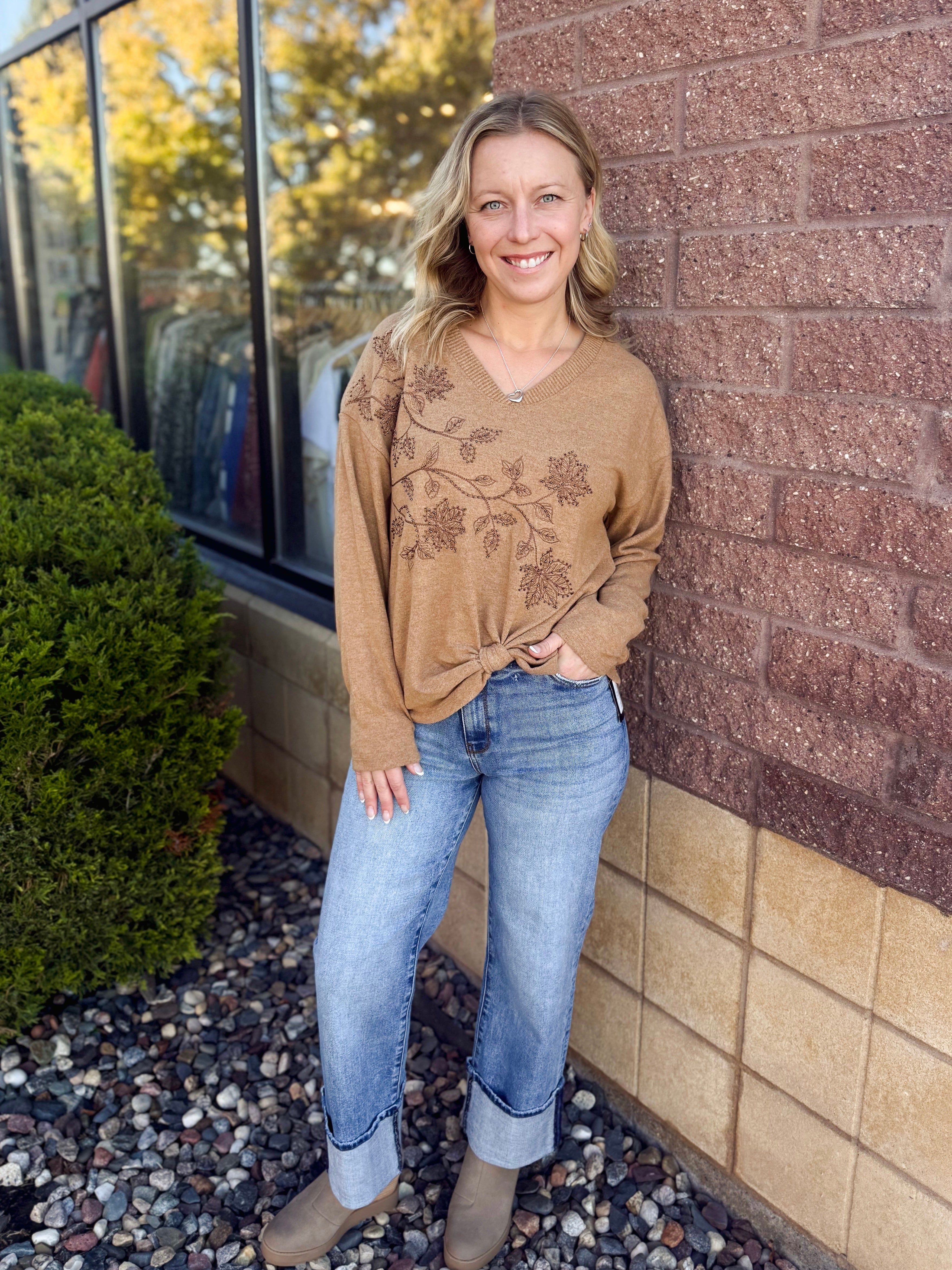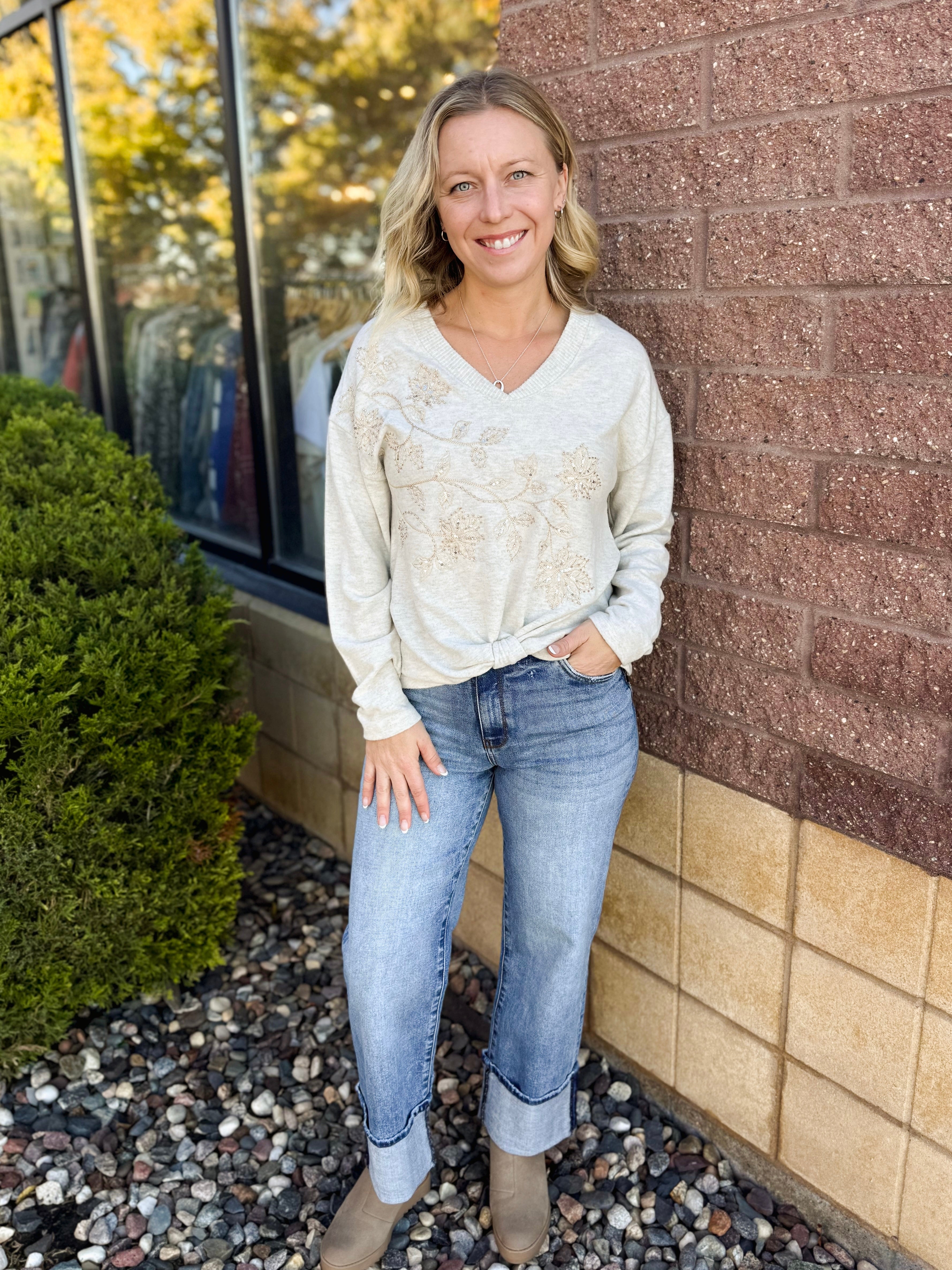V NECK KNOT HEM BEADED EMBROIDERY KNIT TOP