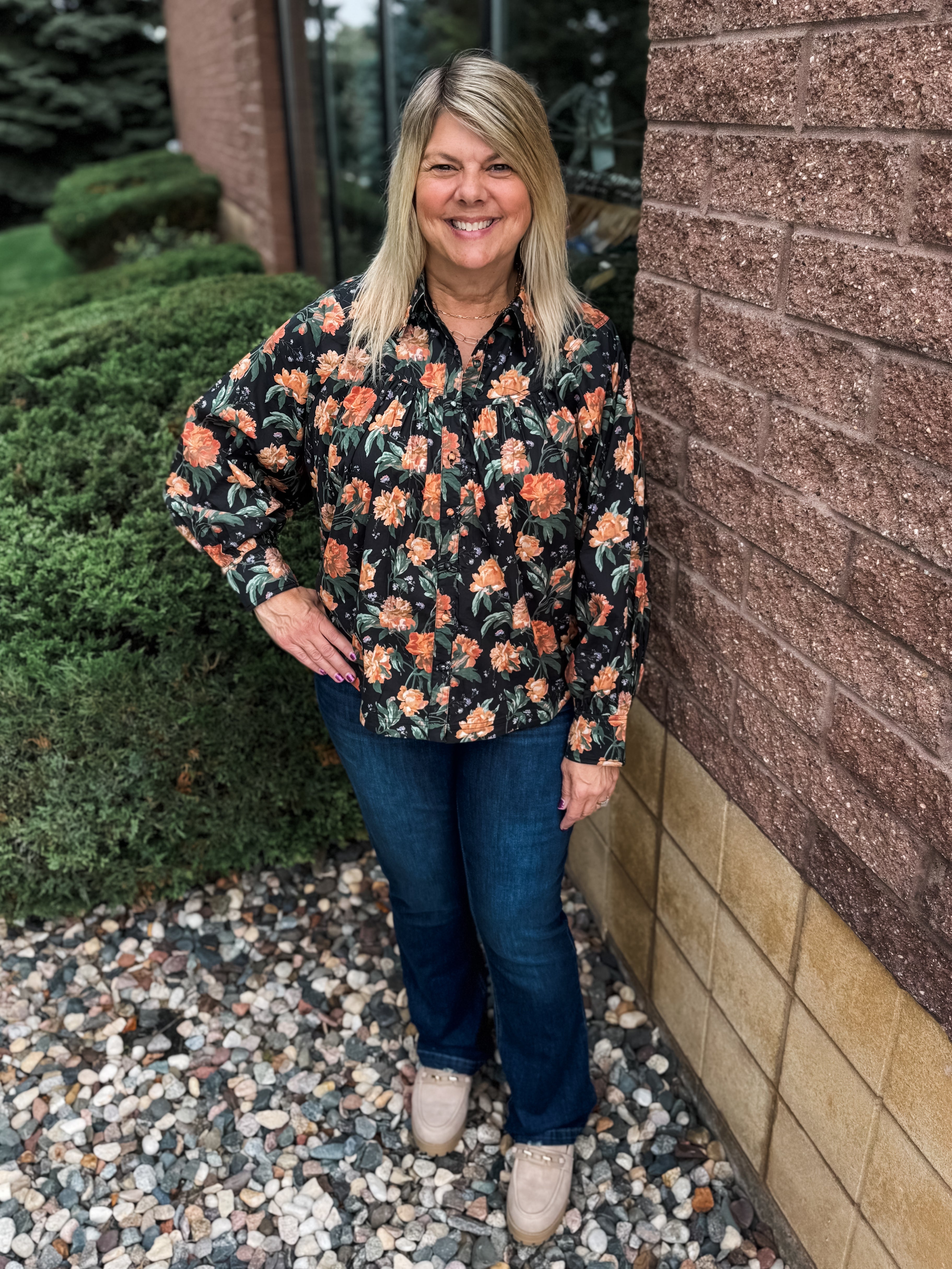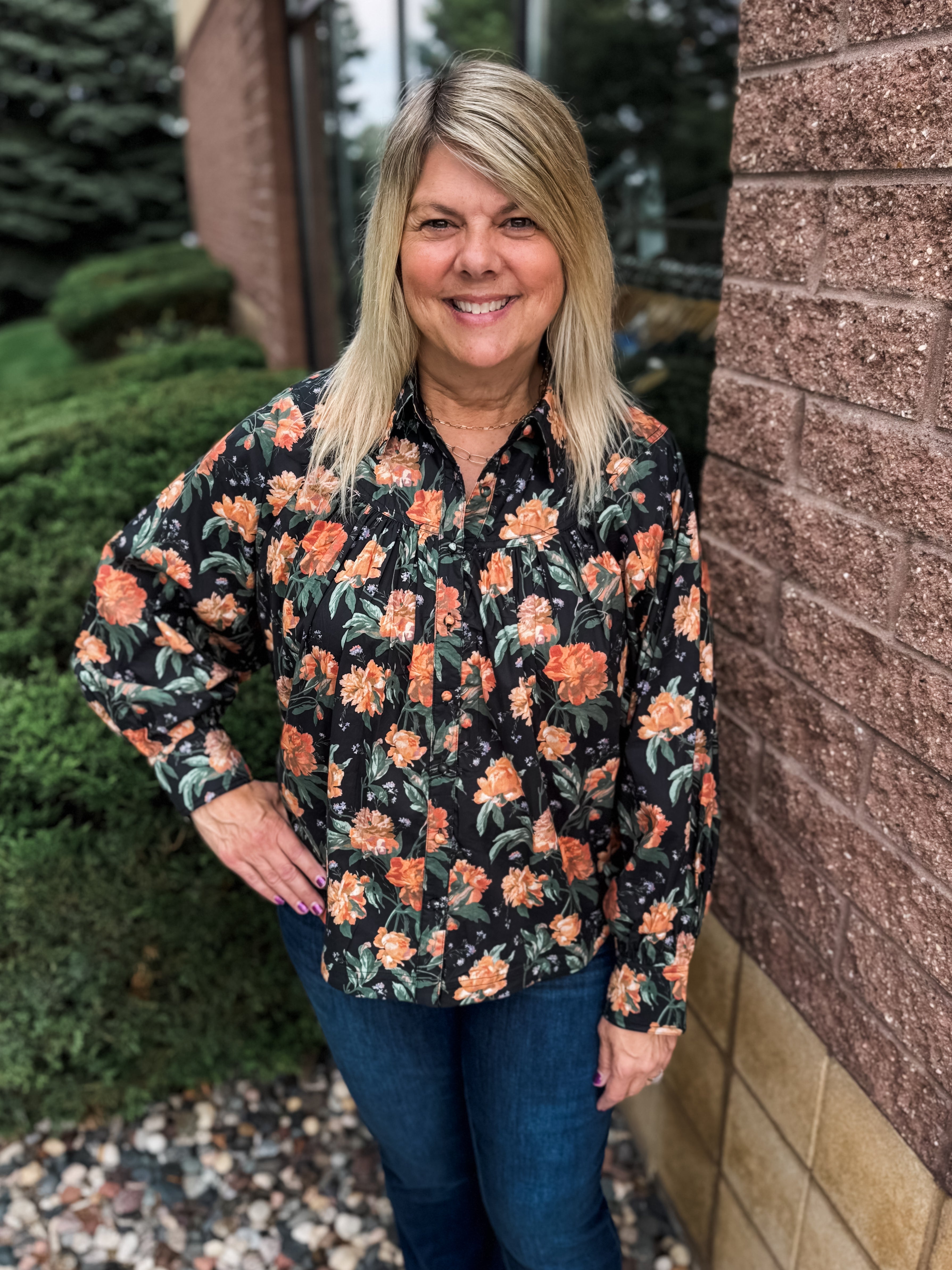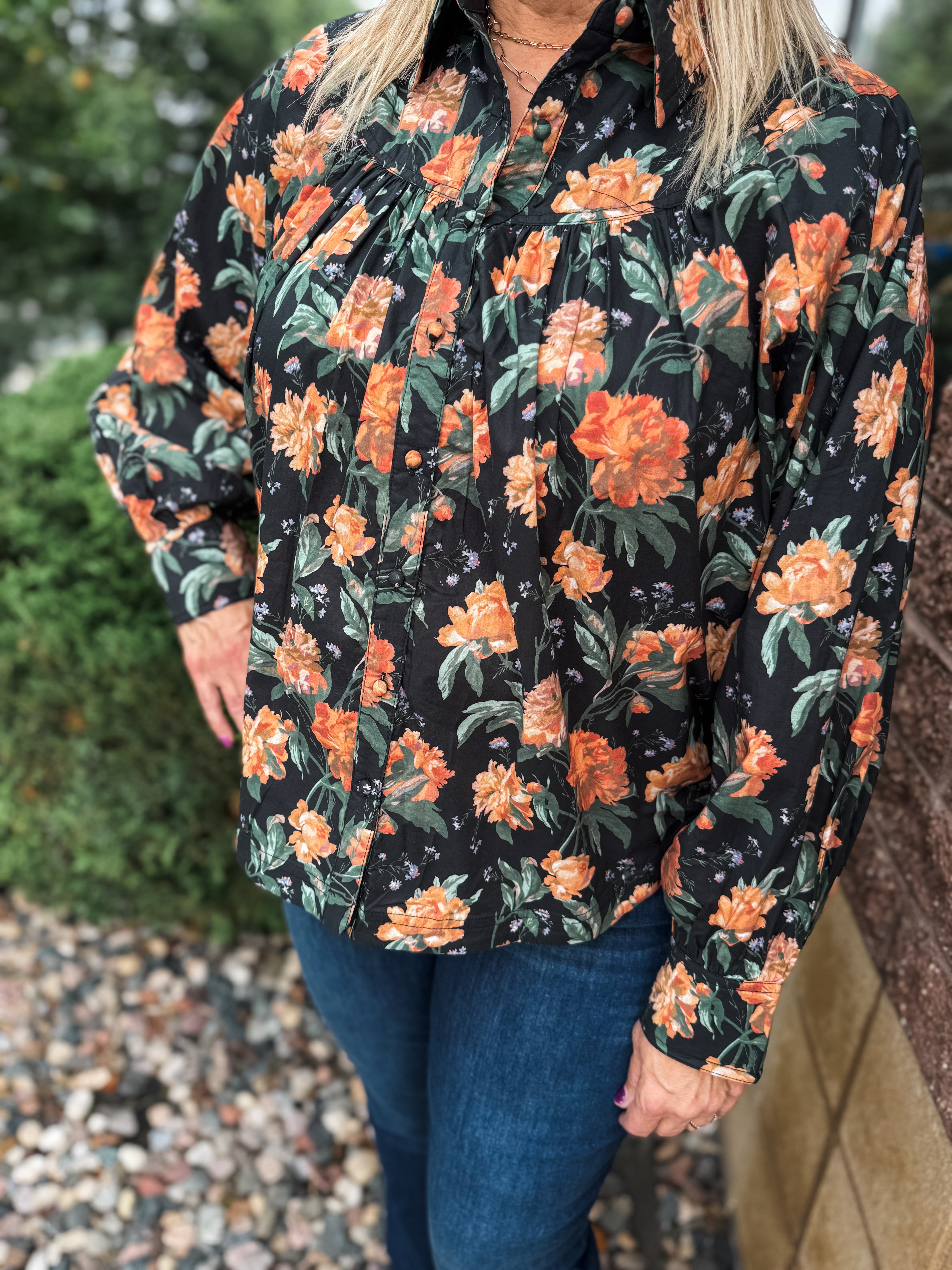 Floral Print Long Sleeve Yoke Top