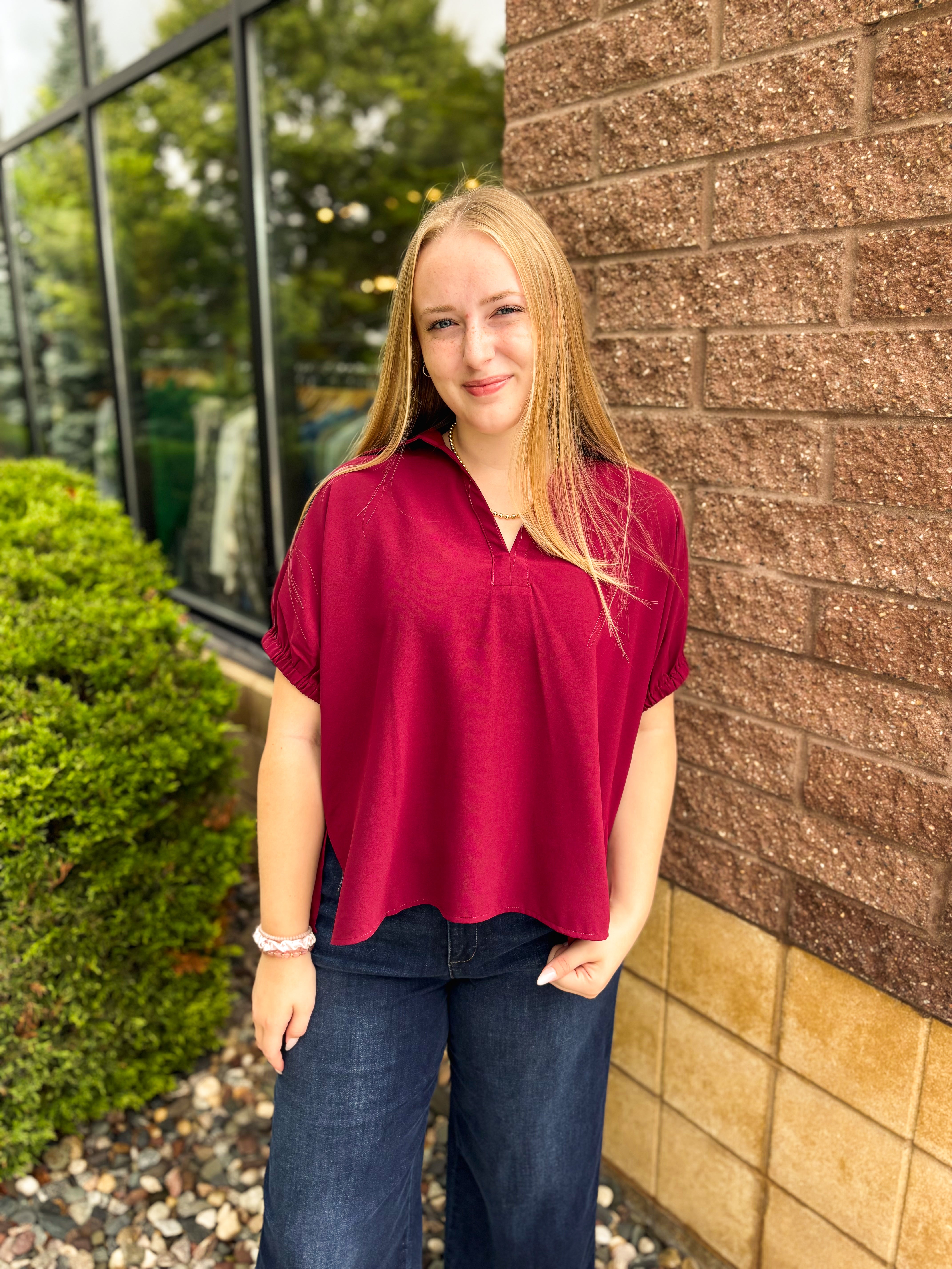 Solid Short Sleeve Split Collar Top