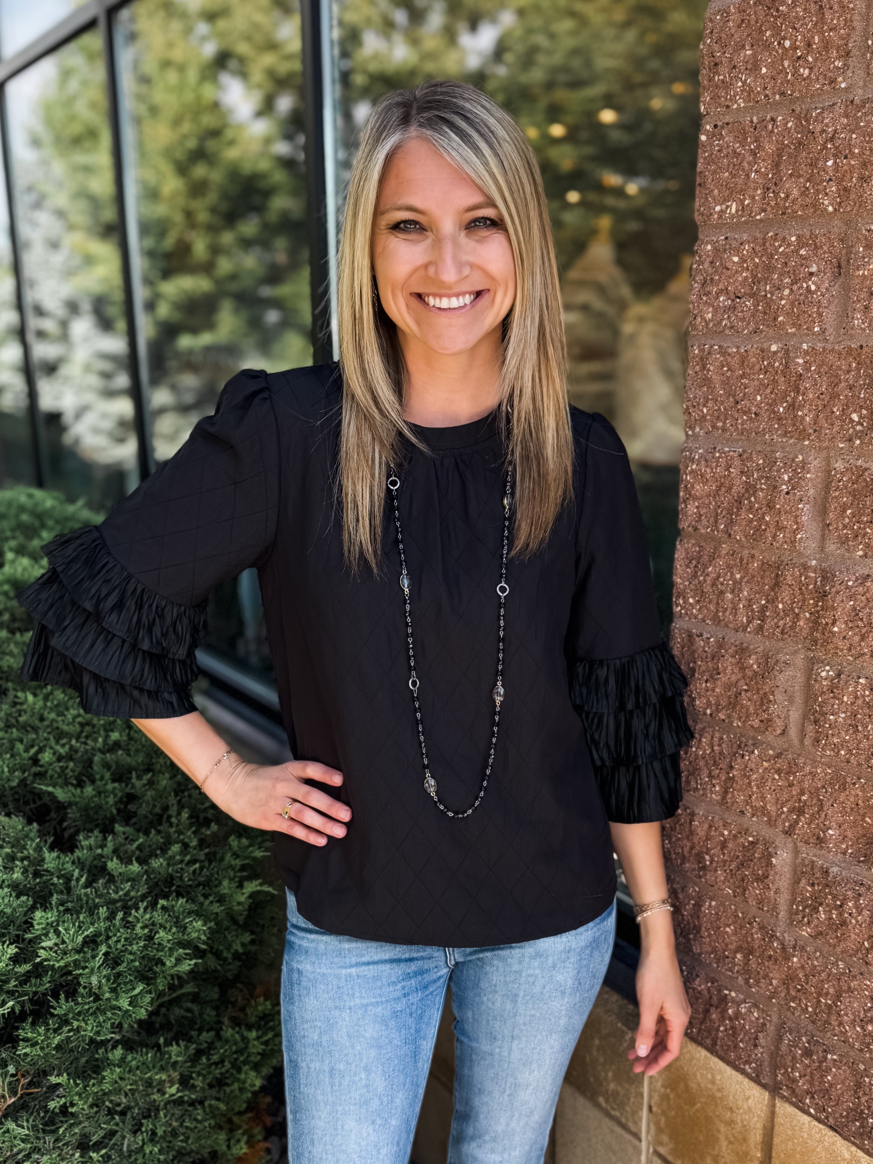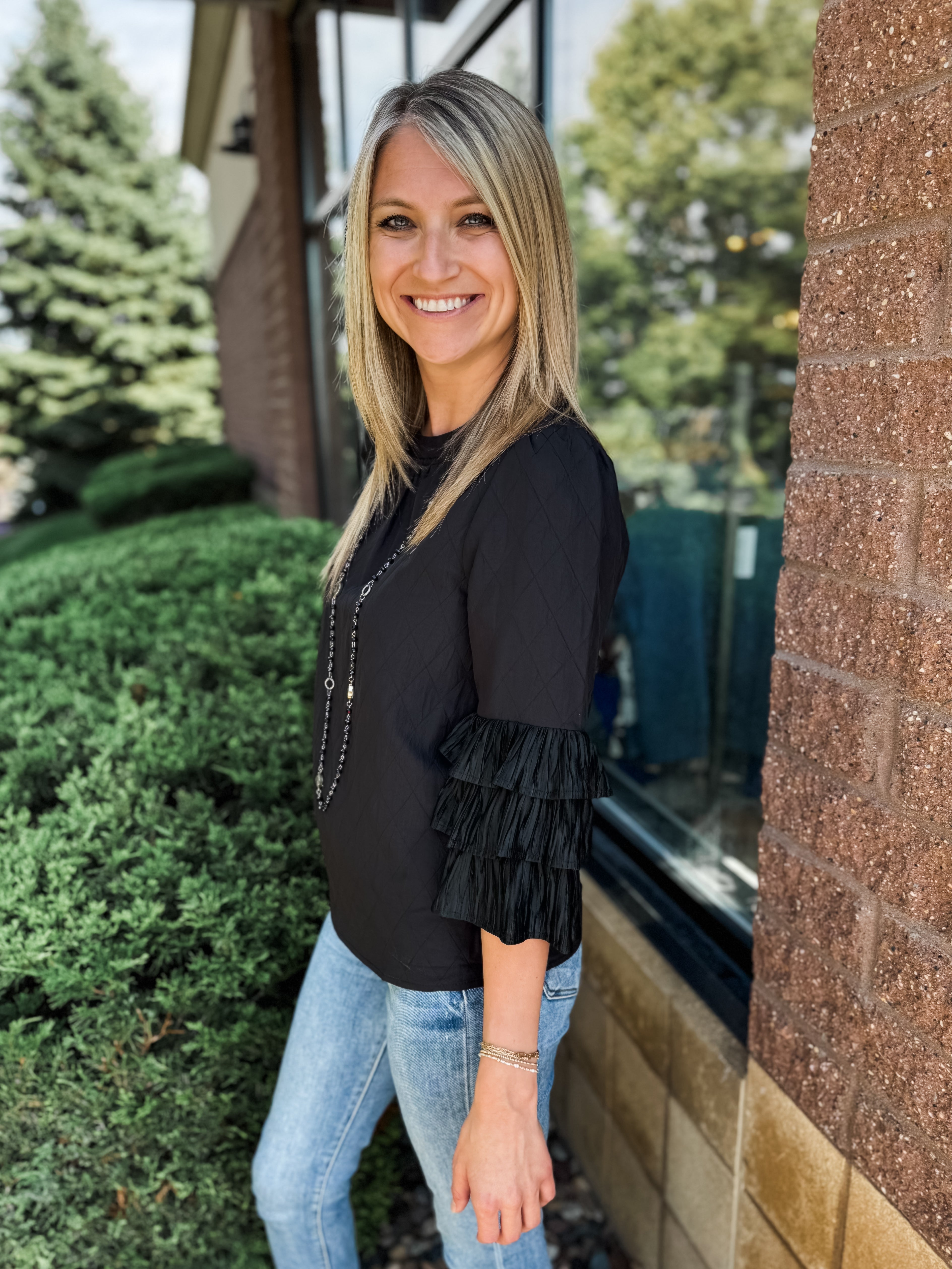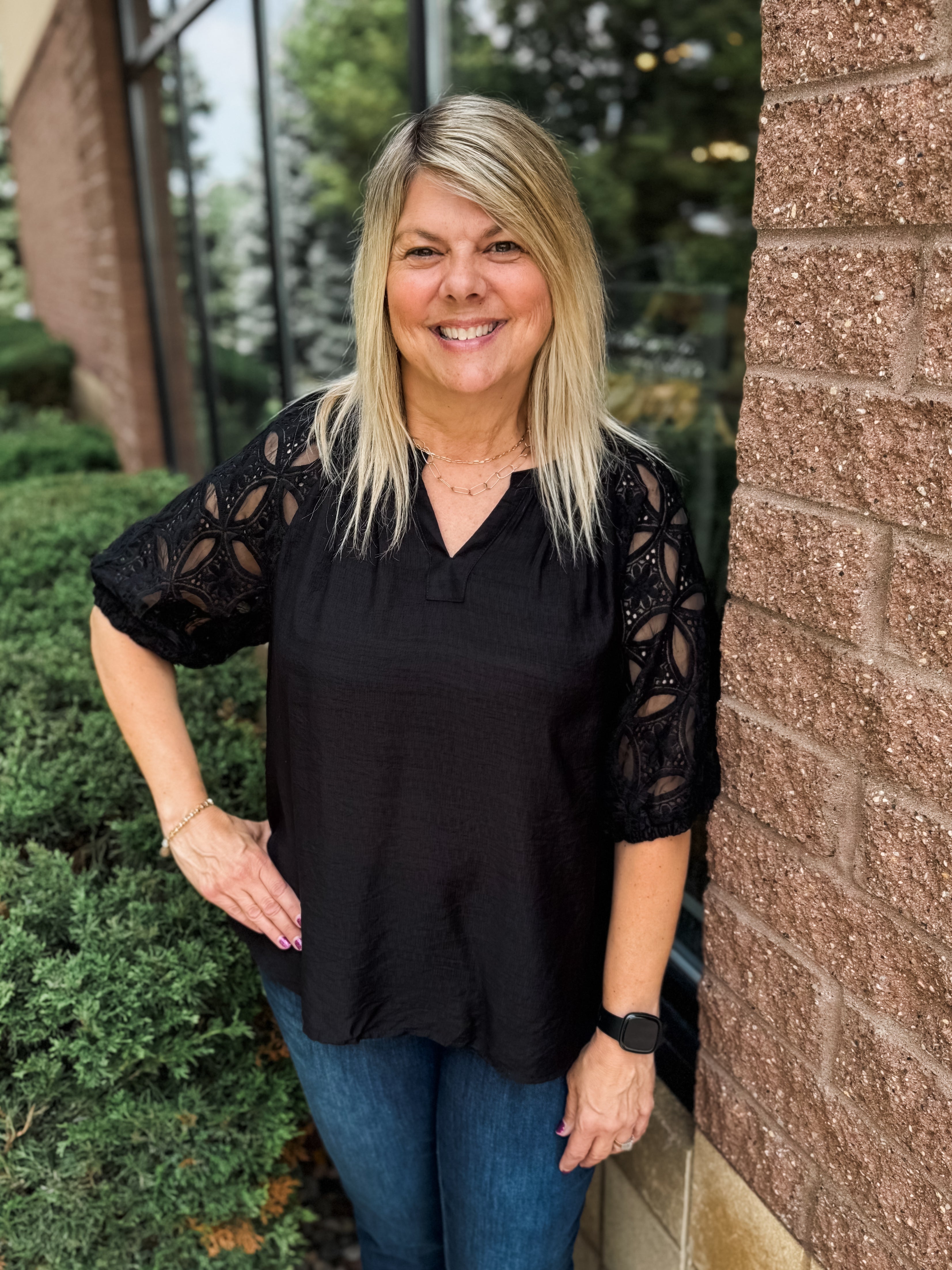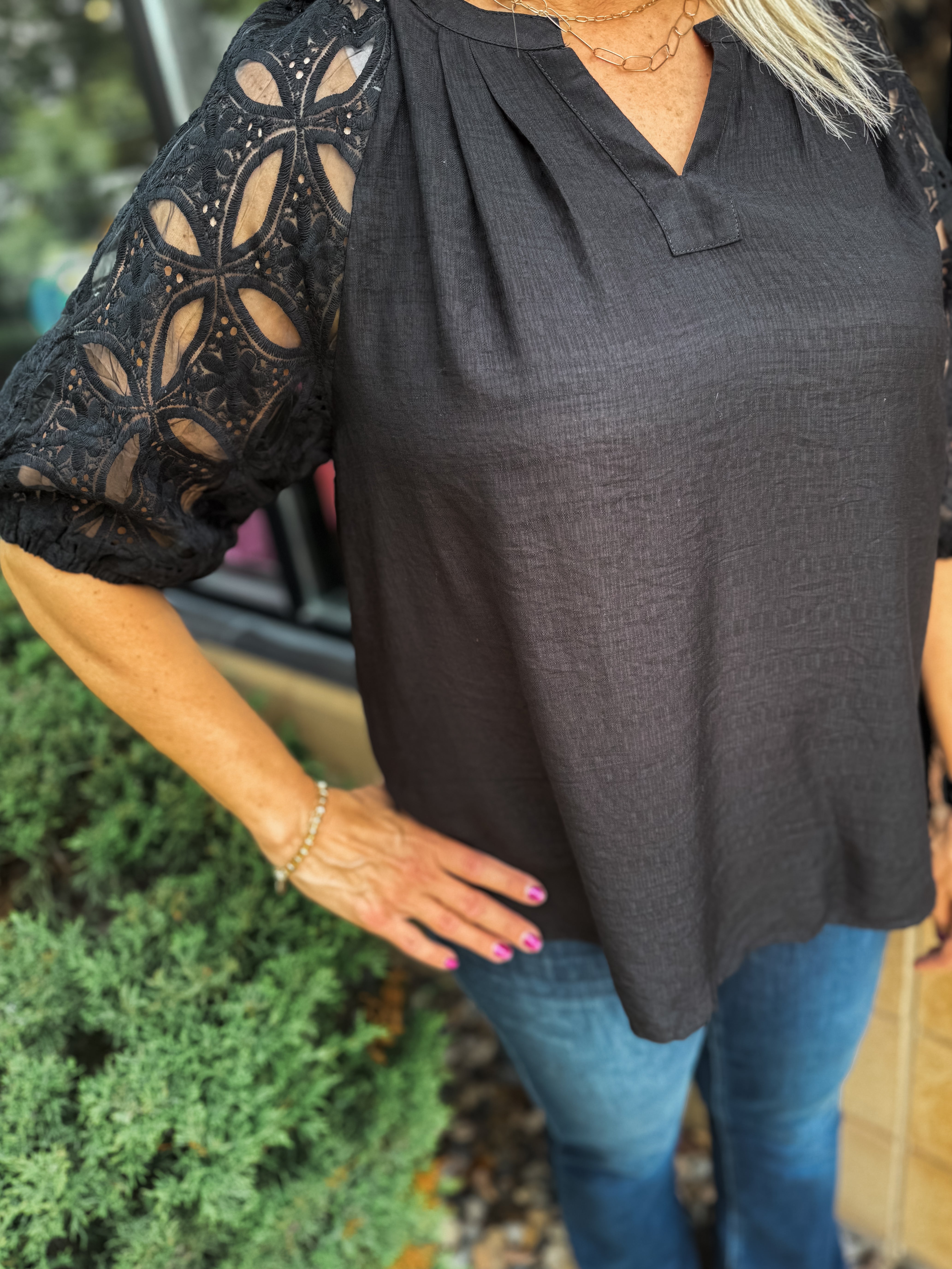 Lace Sleeve Top with Split Neck