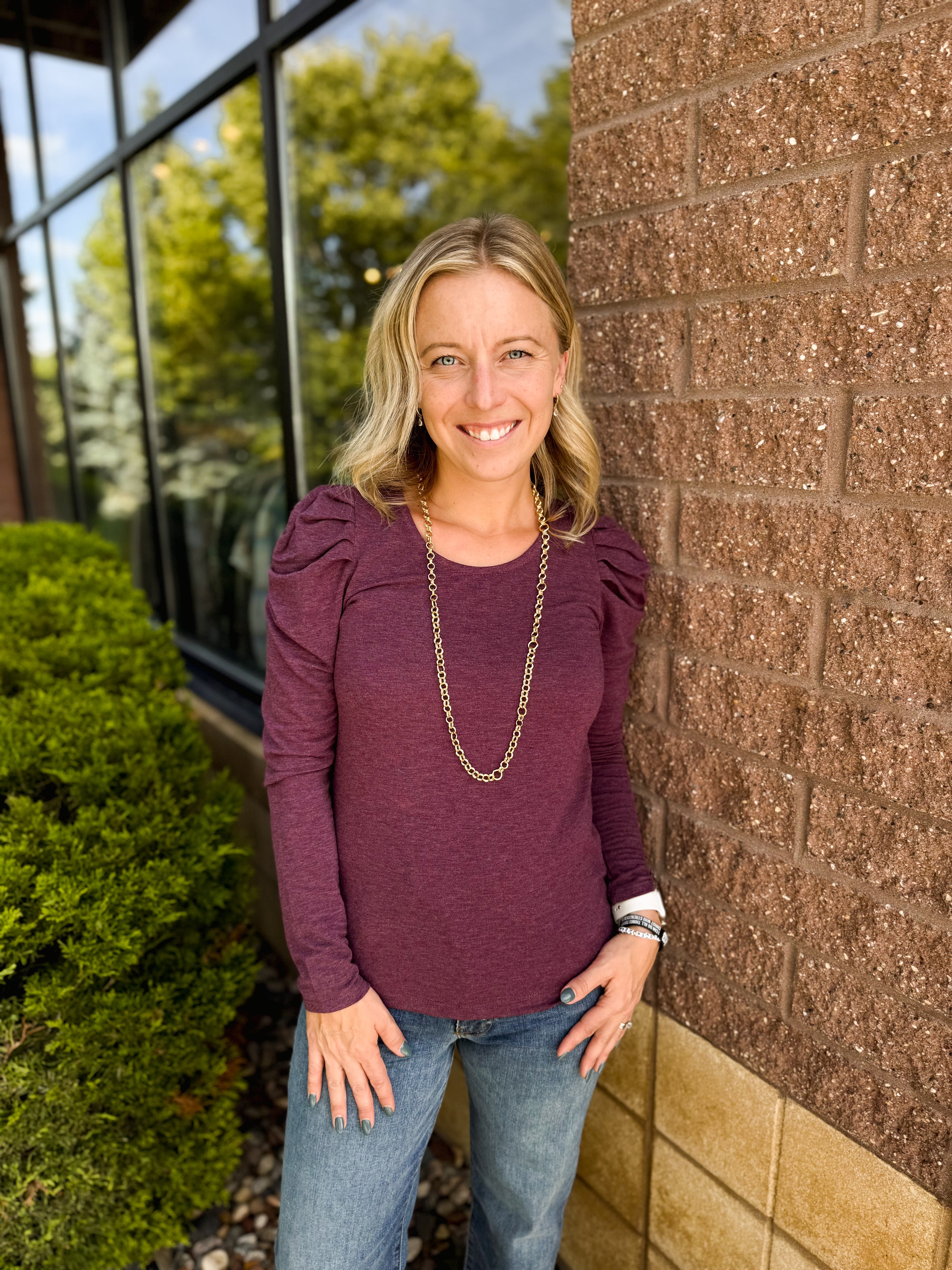 Round Neck Gathered Long Sleeve Top