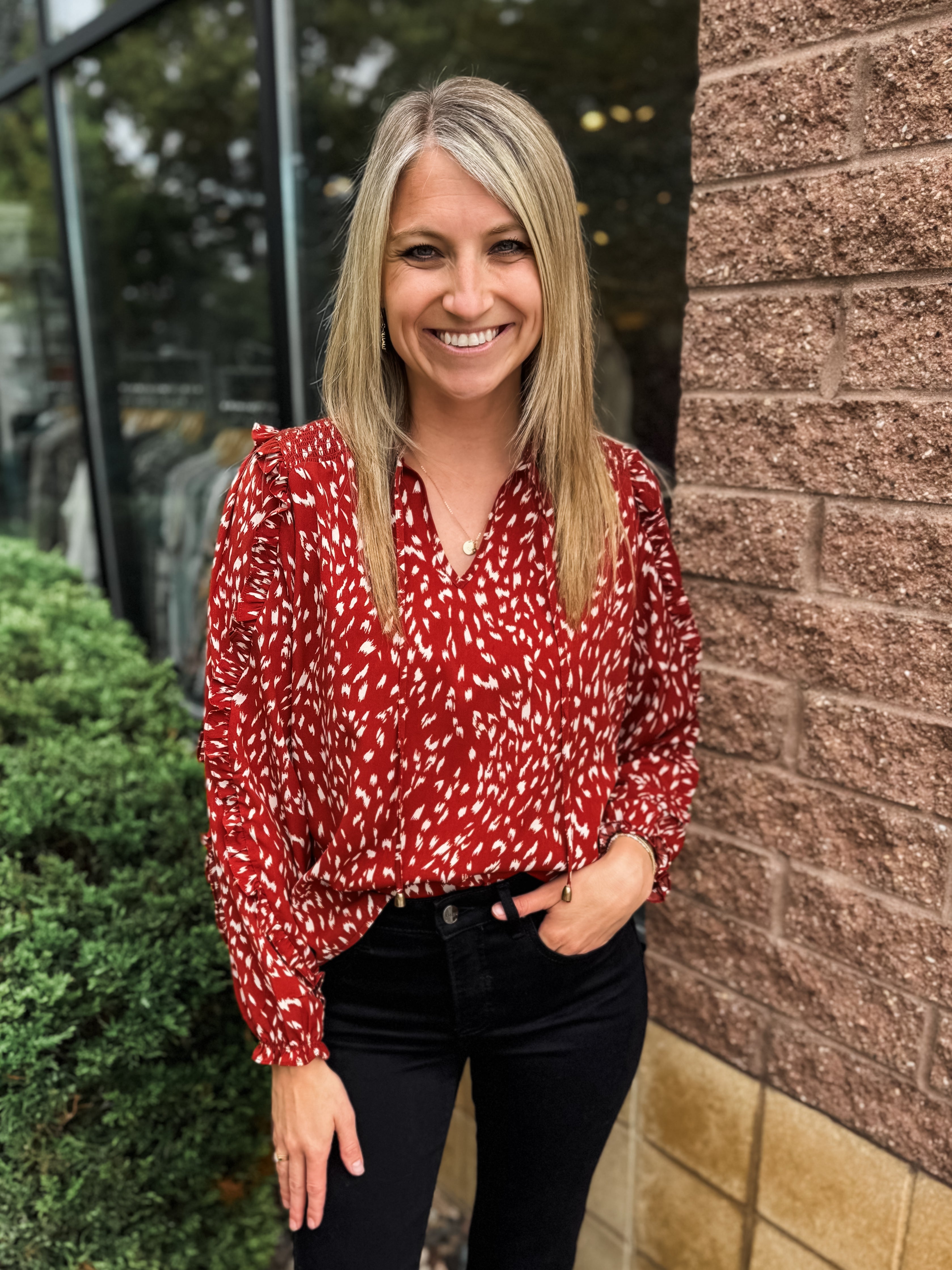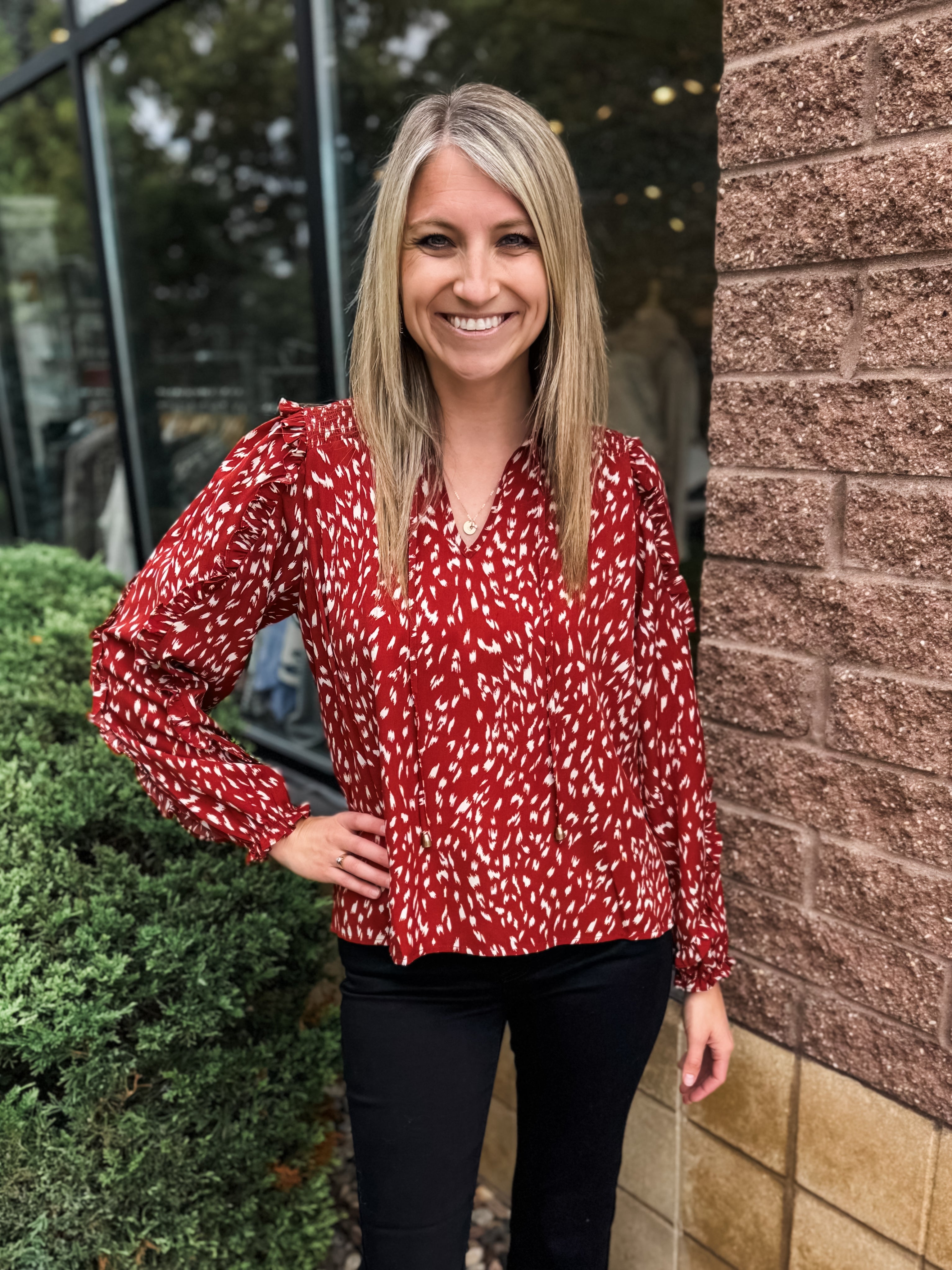 Rust Ruffle Sleeve Blouse With Tie Neck Top