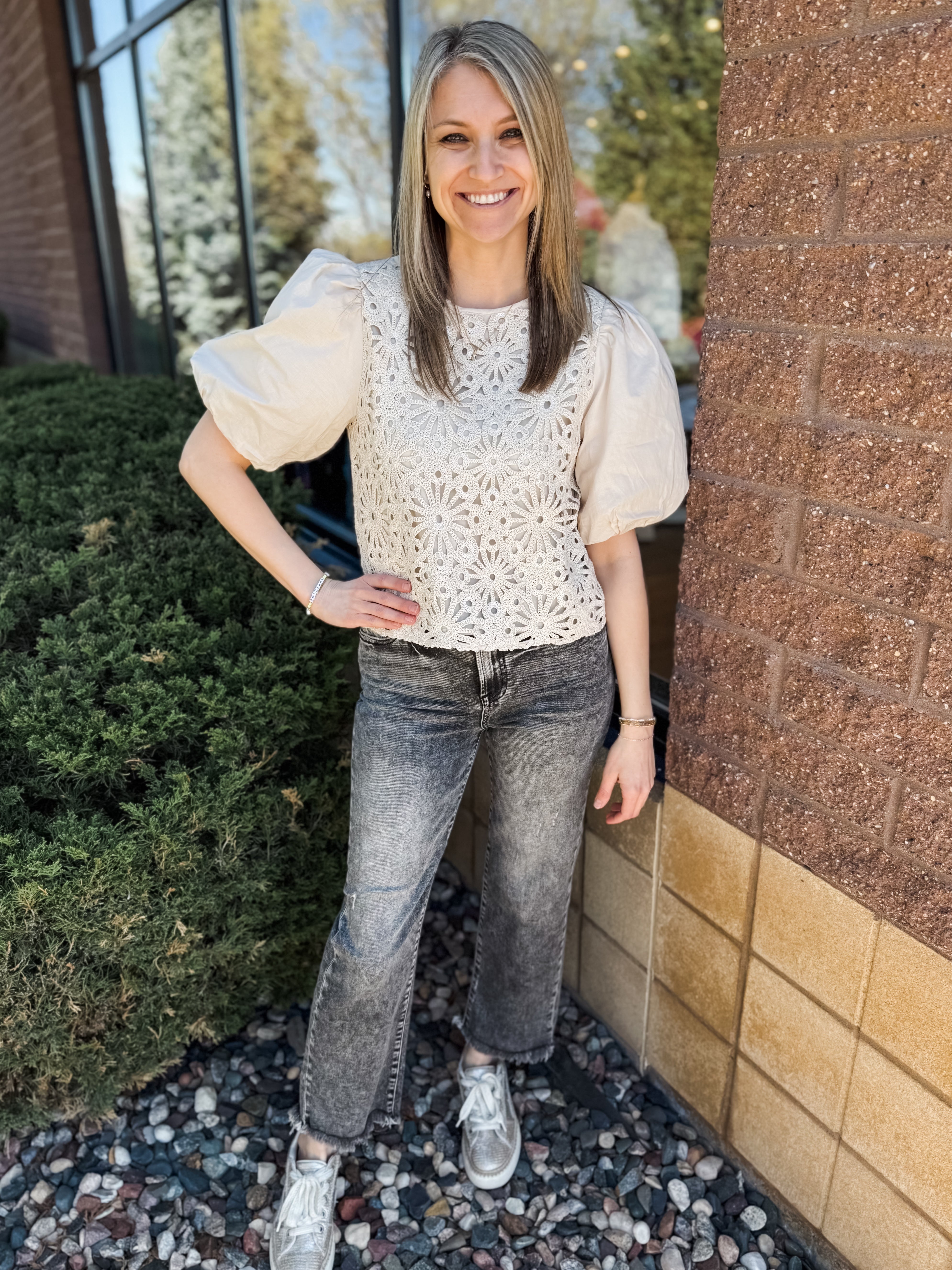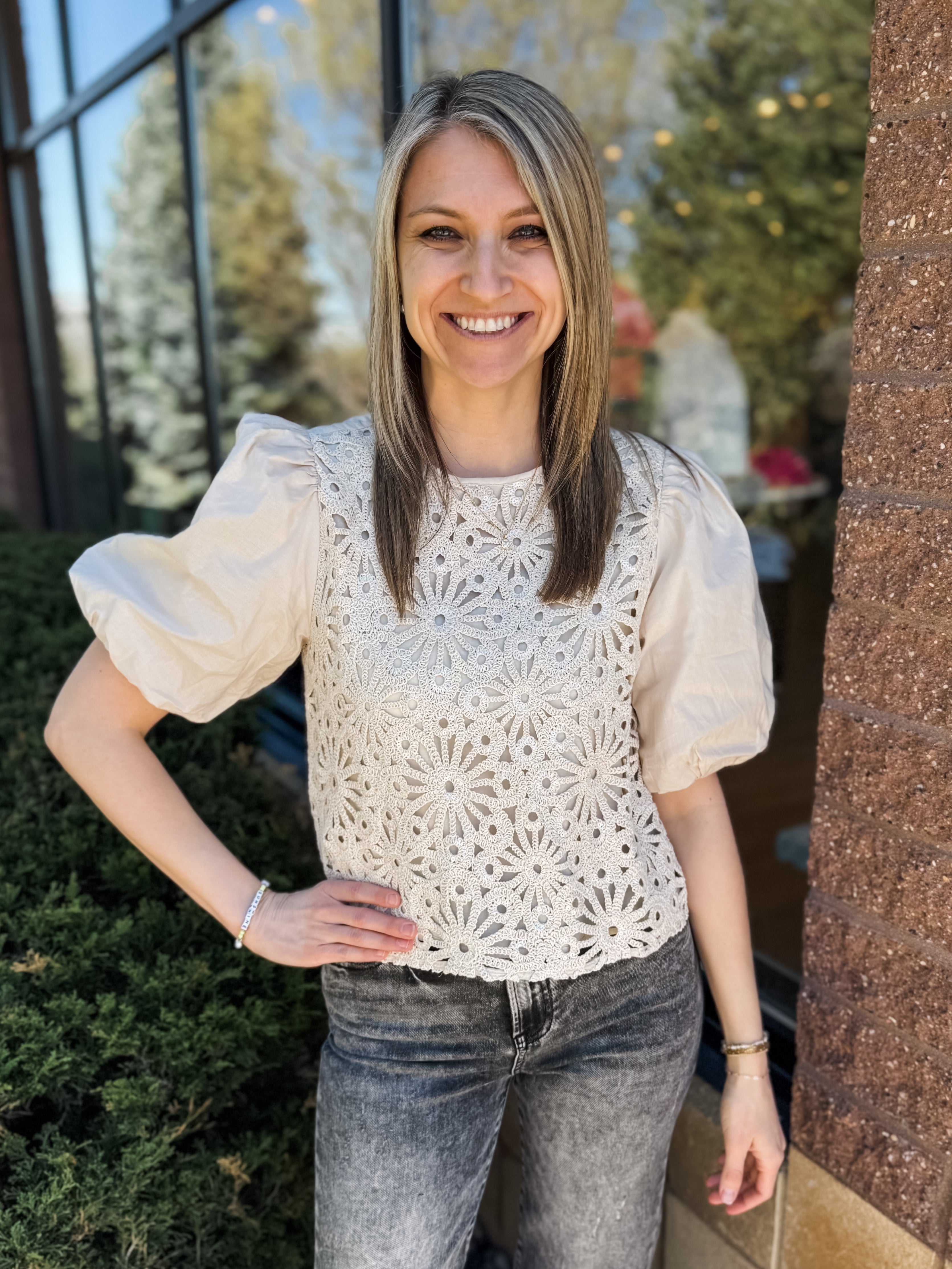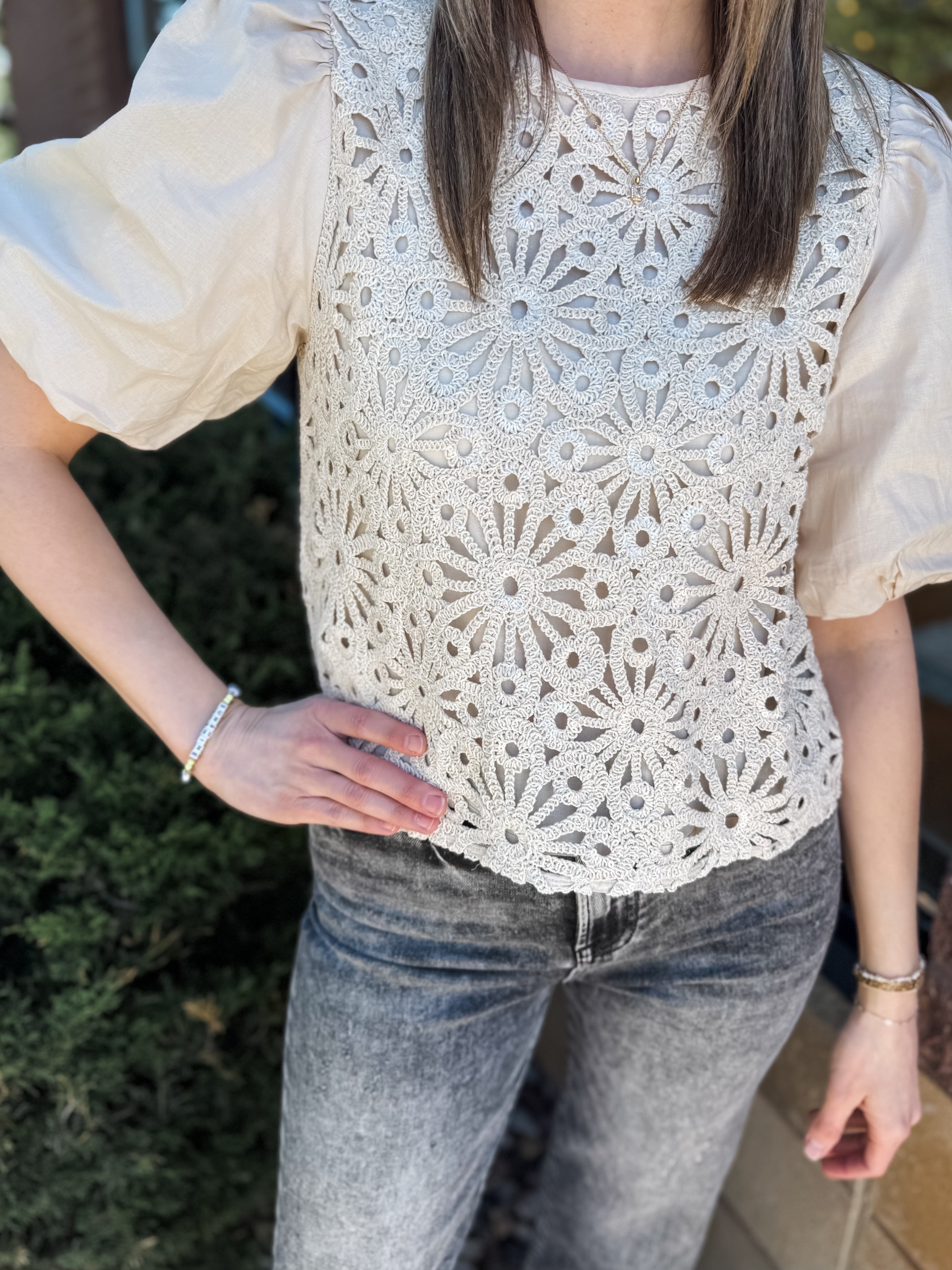 ELBOW PUFF SLEEVE, CREW NECK KNIT TOP W/ CROCHET FAGOTTING